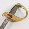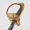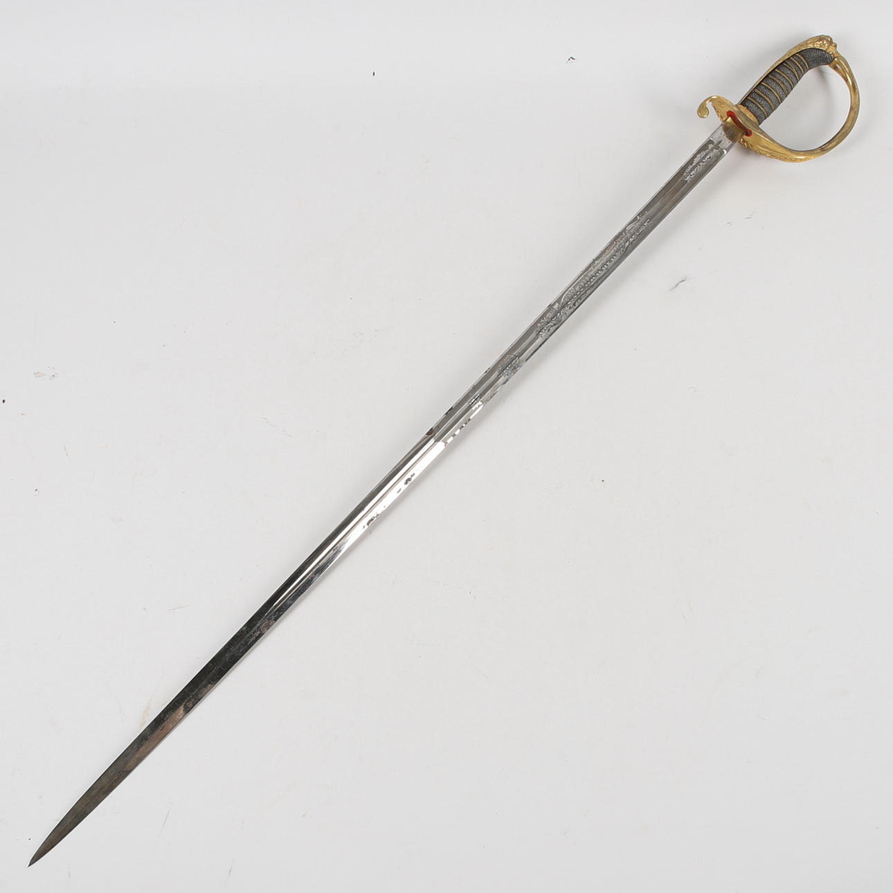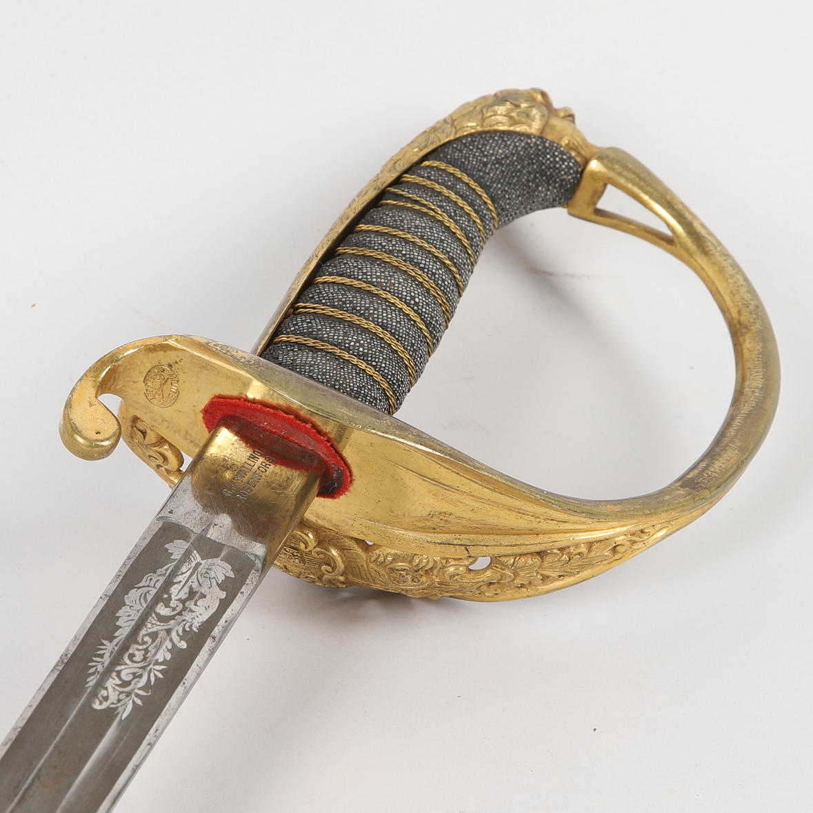 Empuñadura decorada con leones y el escudo nacional sueco. Hoja decorada con las palabras «Patria» y «El rey».