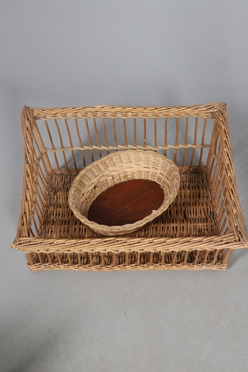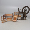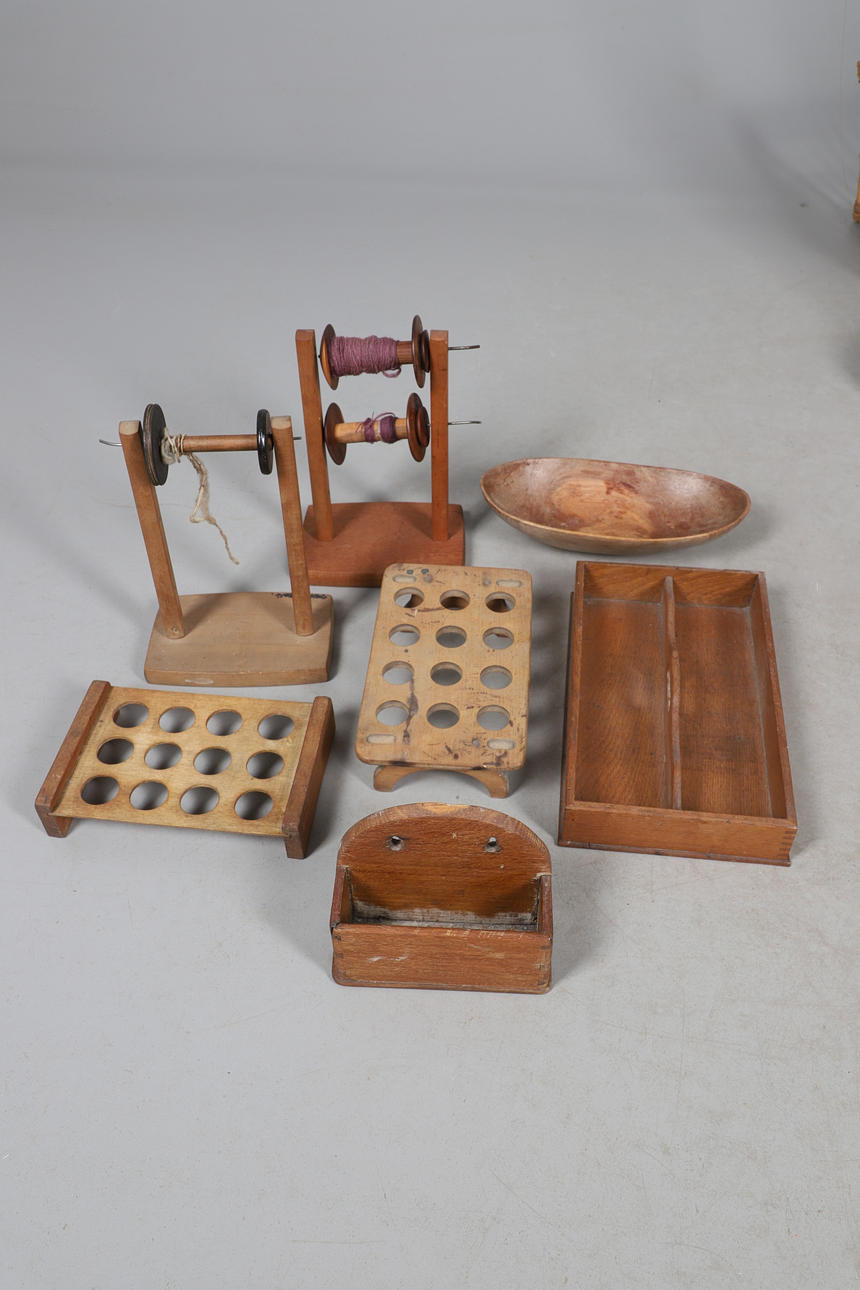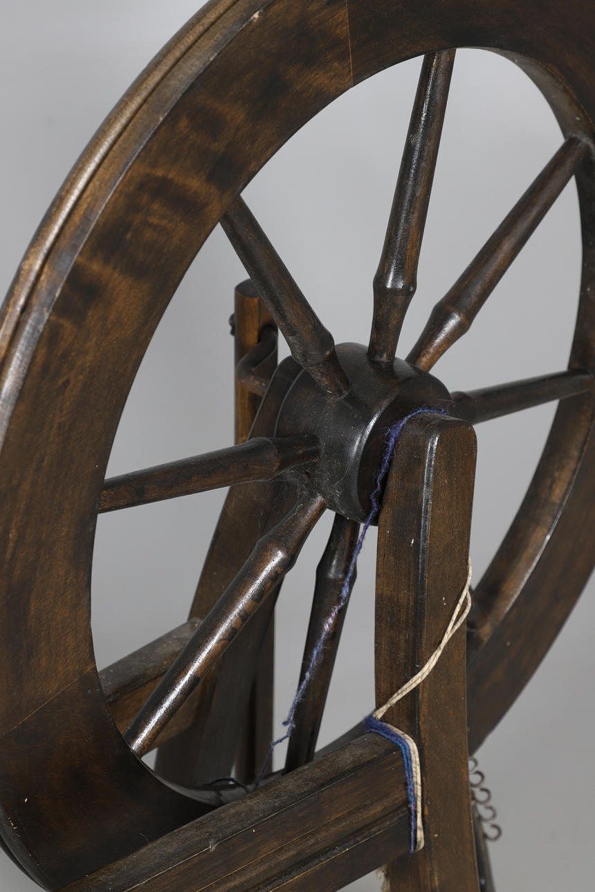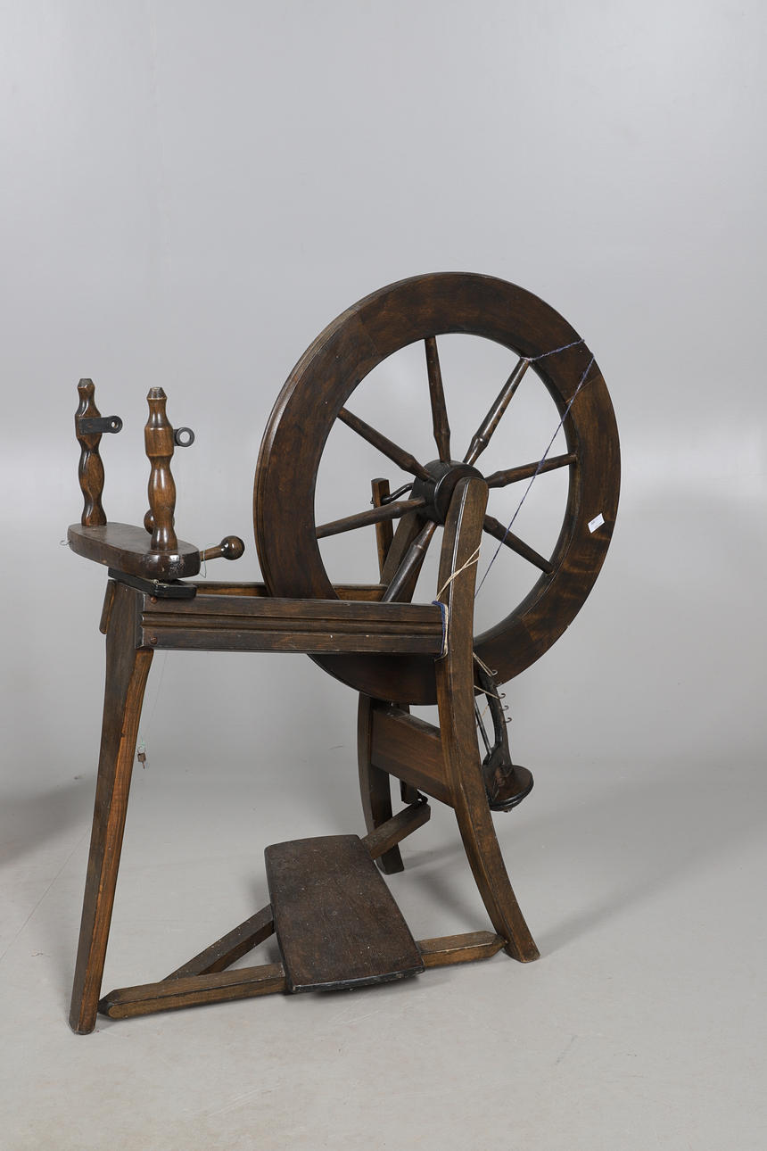 UNA RUECA, UNA CESTA DE MIMBRE Y OBJETOS DE MADERA.