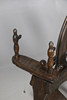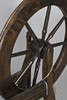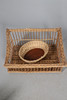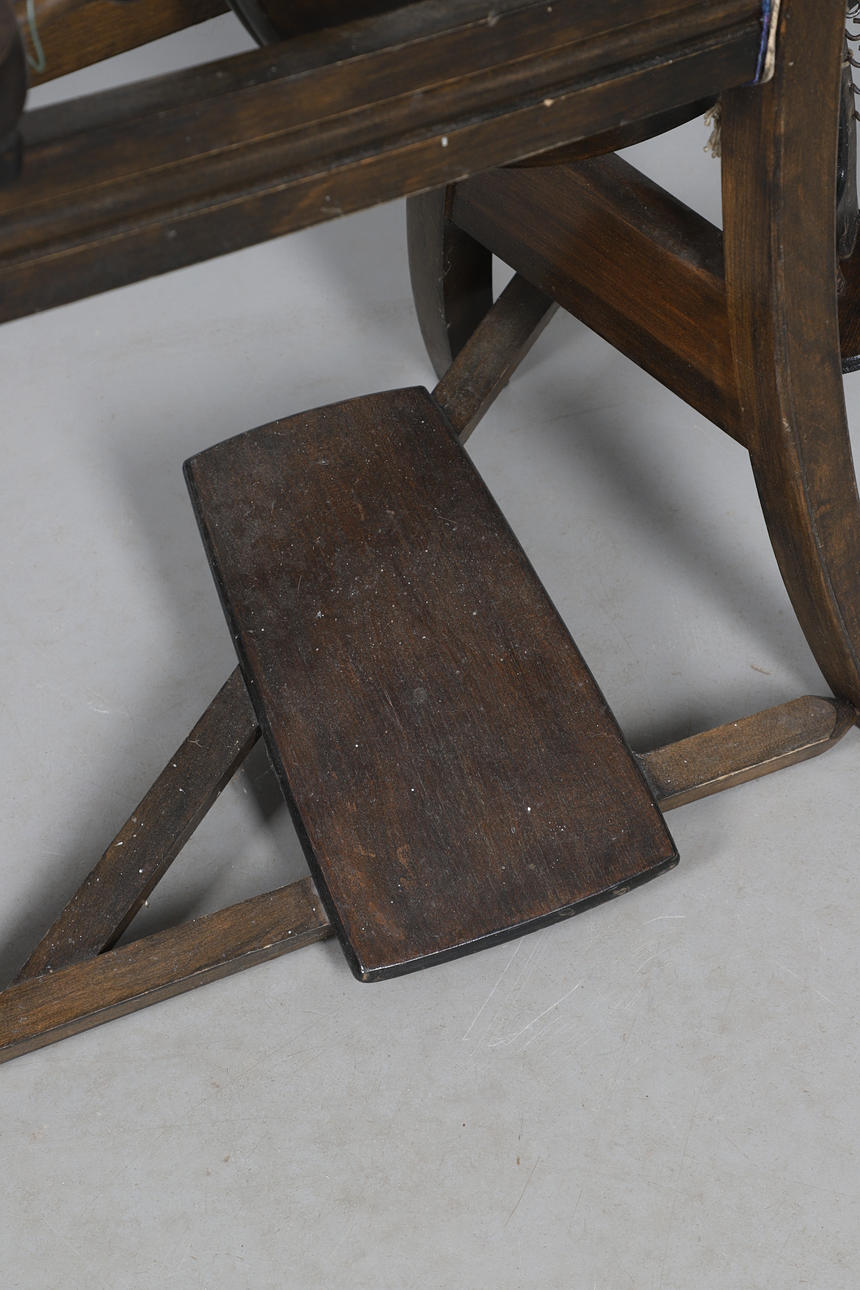 la rueca de 85 cm de alto x 80 cm de ancho x 35 cm de profundidad; junto con una cesta de mimbre de 53 cm x 38 cm, junto con un estante para libros de 52 cm x 28 cm, soportes para huevos, bobinas y soportes, etc.
