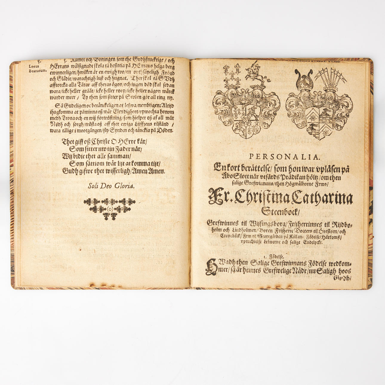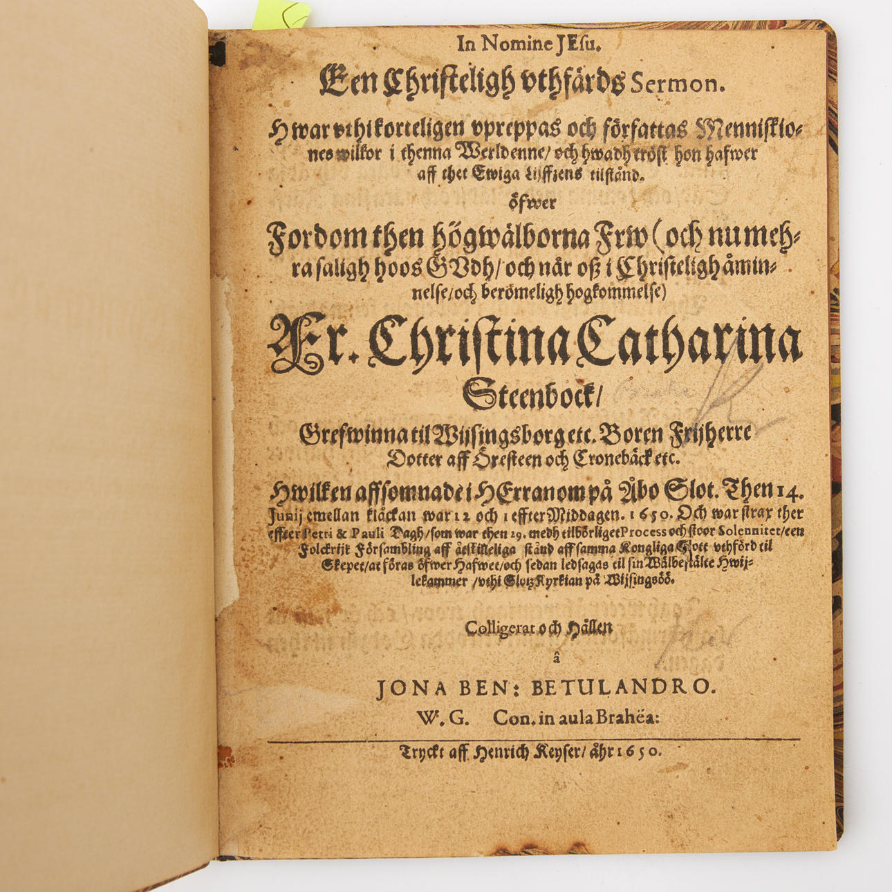 SERMÓN ECLESIÁSTICO (sermón) sobre Christina Catharina Stenbock, 1650, Jonas B Betulander, grabador Henrik Keyser, más tarde banda de cartón jaspeado (G Hedberg).