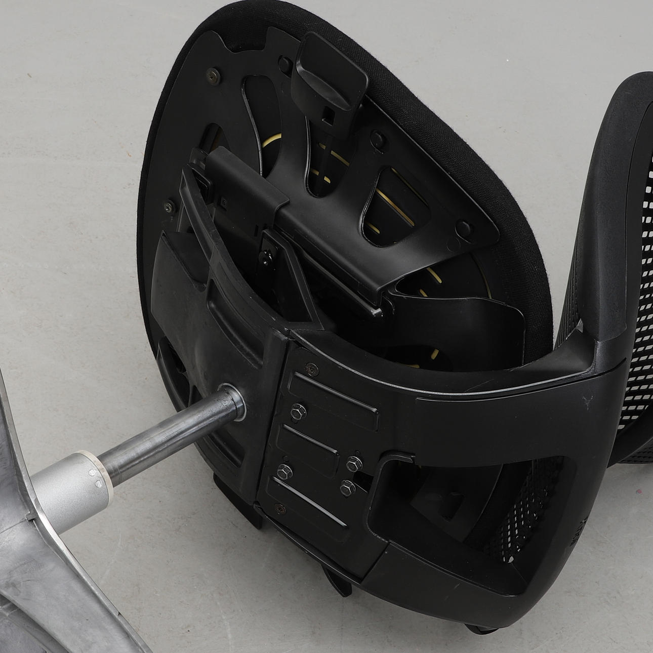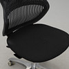 Respaldo en material elástico negro con respaldo flexible, asiento tapizado de tela negra. Girable, sobre ruedas. Ancho del asiento 52 cm. Altura del asiento regulable 43-56 cm. Profundidad de asiento ajustable. Altura mínima del respaldo 98 cm.