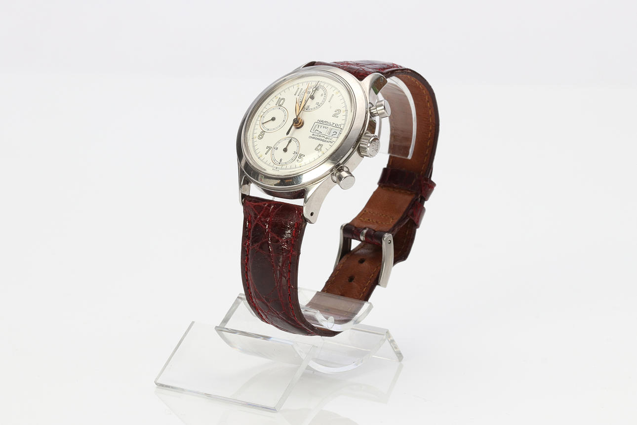 Esfera blanca con subesferas, día y fecha. Cronógrafo, correa de piel Hamilton. Funda Hamilton con caja incluida.