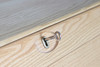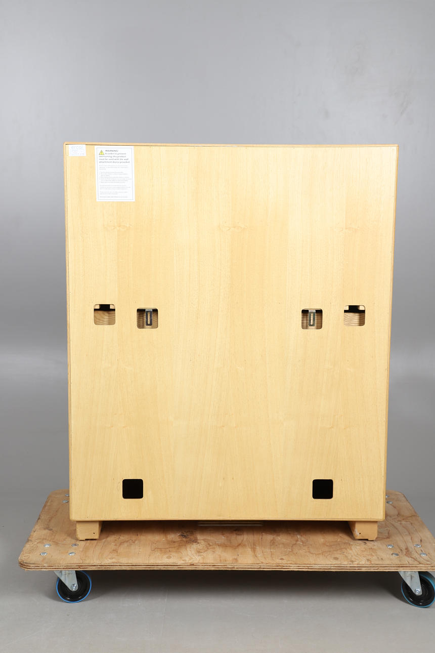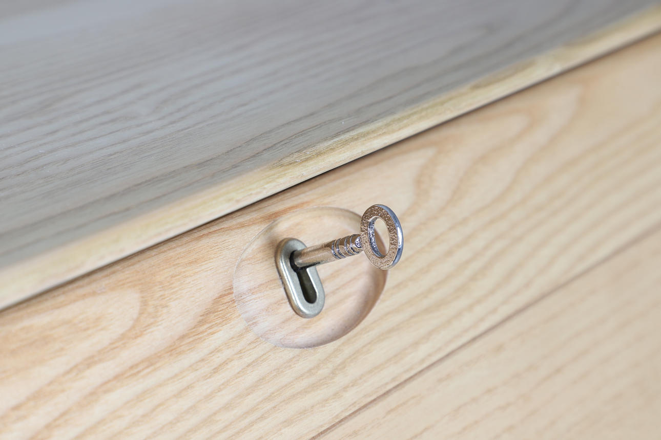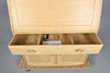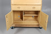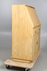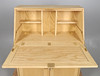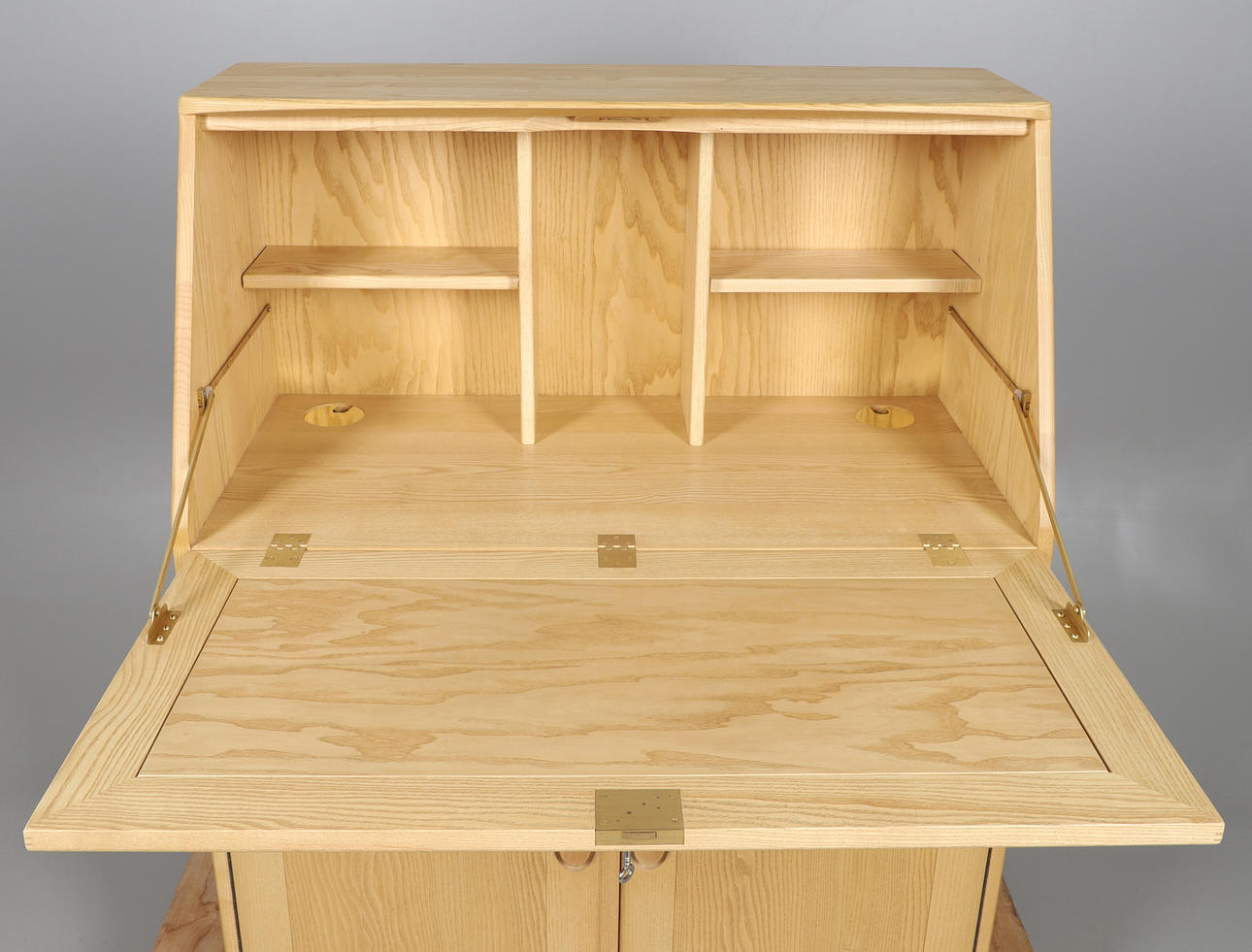 Un moderno escritorio Ercol de color olmo claro, con solapa abatible e interior empotrado. Con un solo cajón sobre un armario de dos puertas. 114,5 cm de alto, 91 cm de ancho.