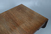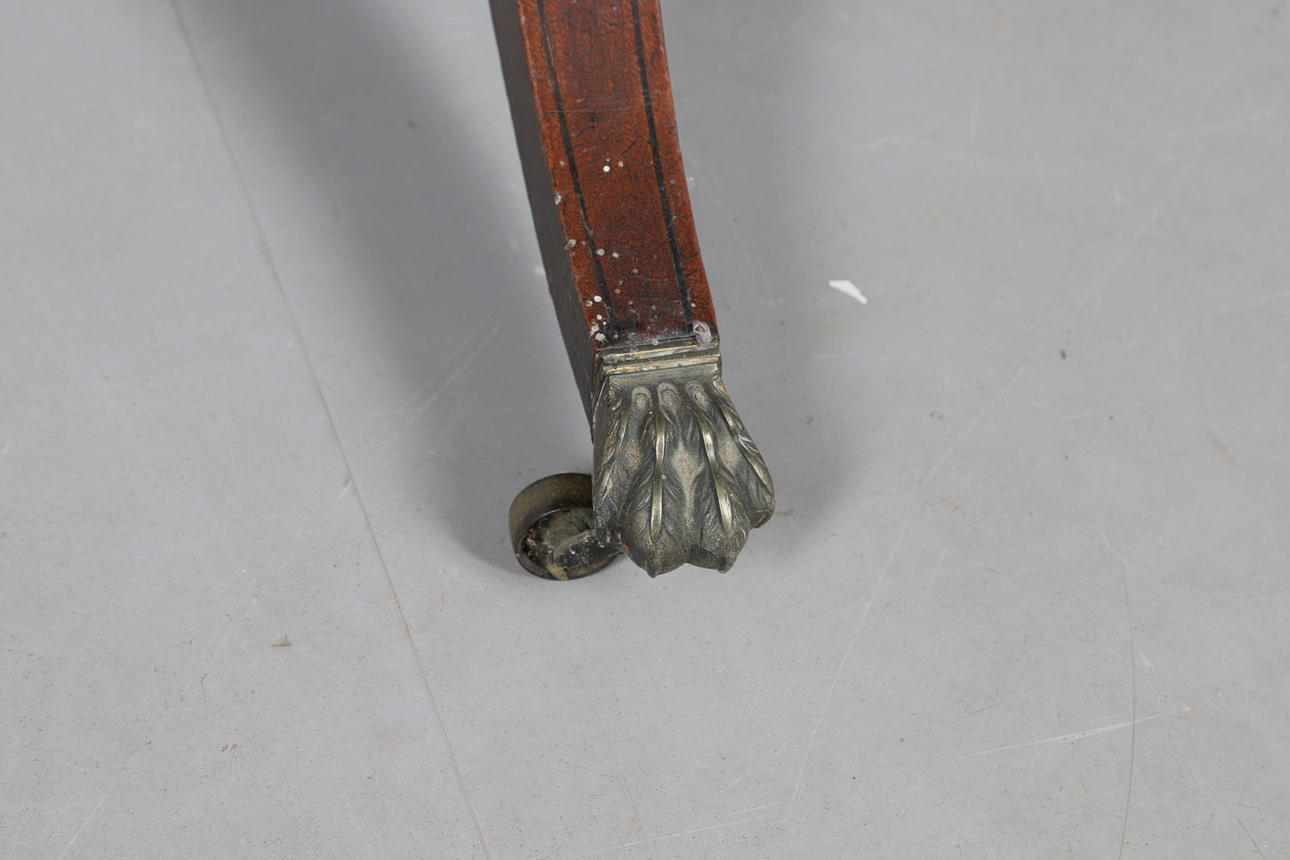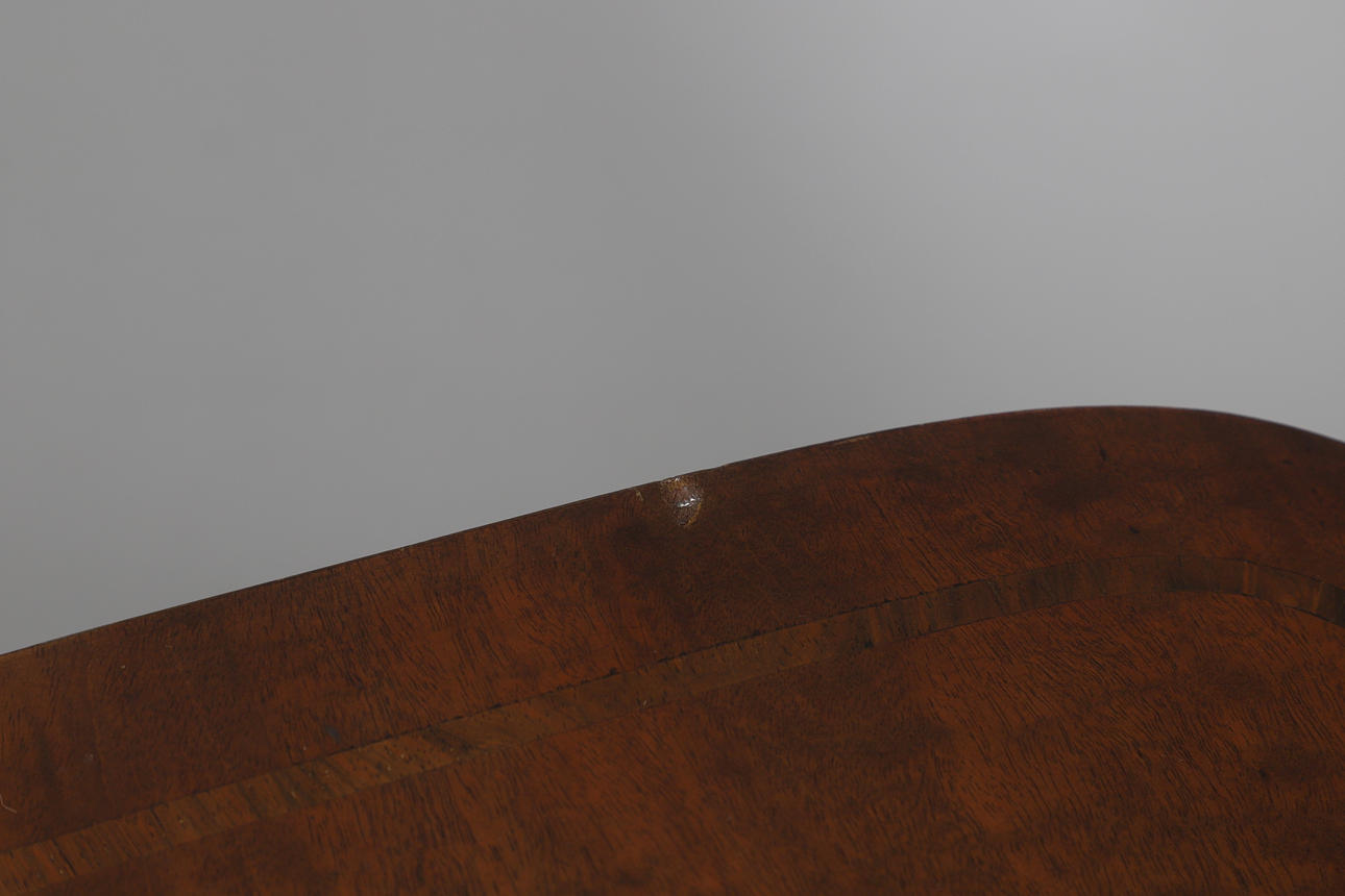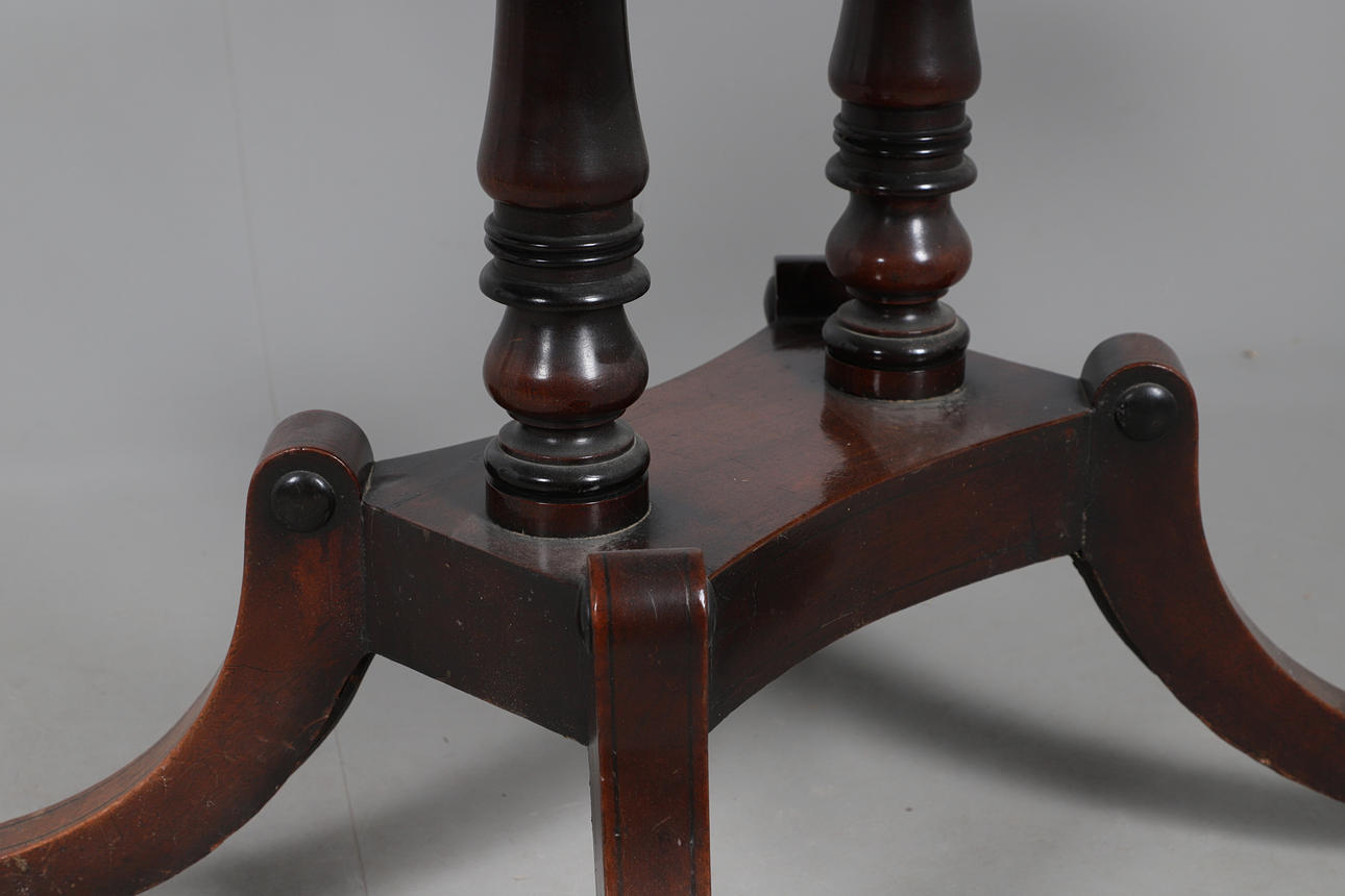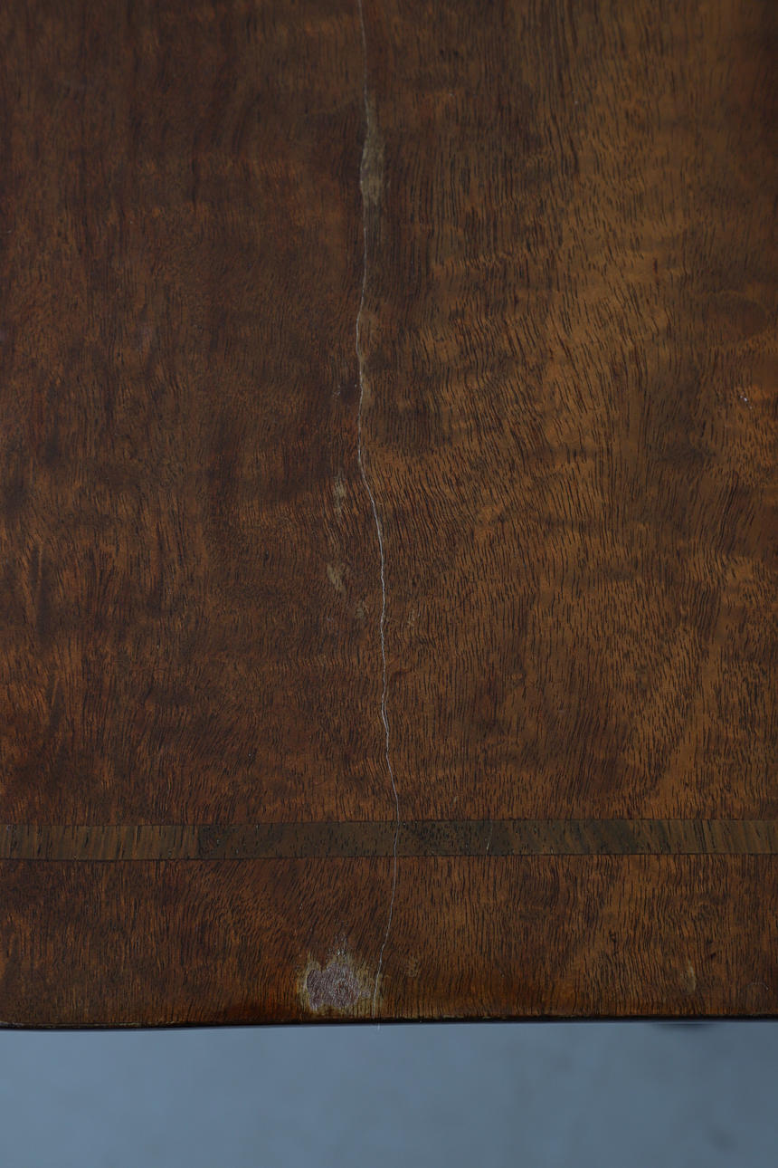 Con dos soportes de columna torneados, levantados sobre patas en forma de garra y ruedas metálicas. Cuenta con un solo cajón central y uno falso en el reverso. Altura 71 cm, ancho 87 cm (extendido 112 cm), profundidad 66 cm.
