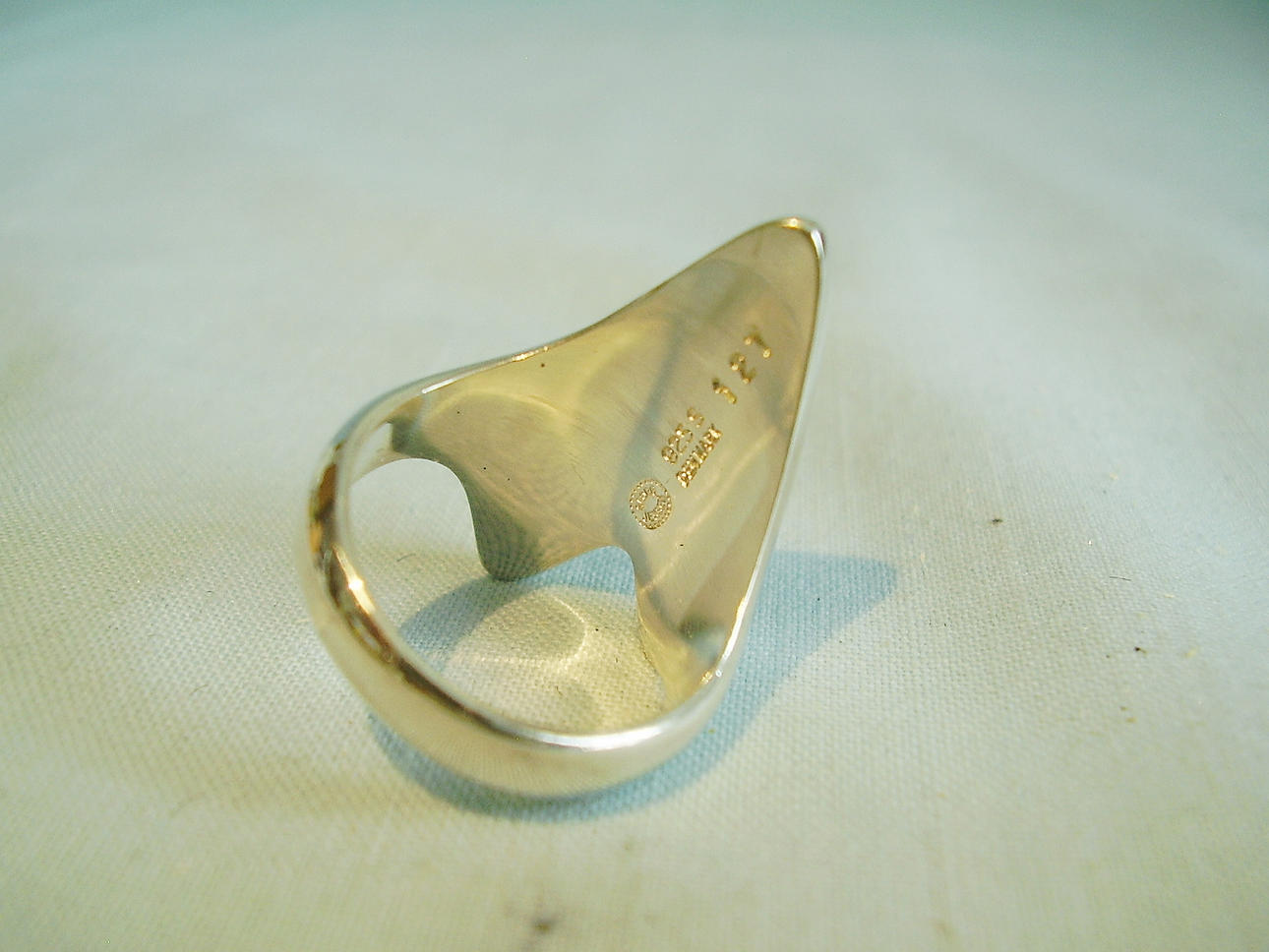 El anillo está hecho de plata 925 y está marcado en consecuencia, con el sello de Georg Jensen, Dinamarca y el modelo no. 127, probablemente un modelo de Henning Koppel para Georg Jensen.