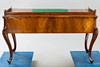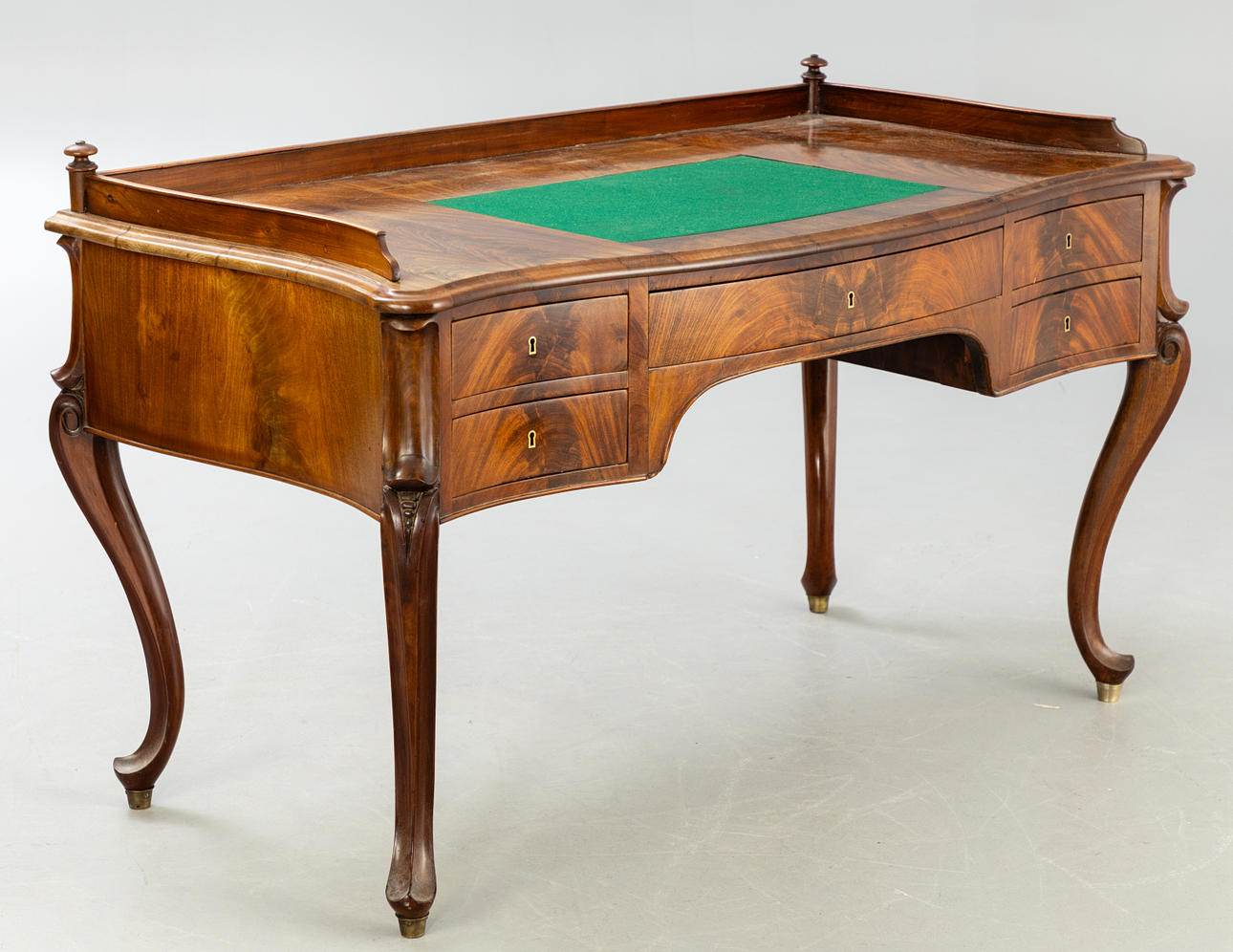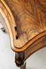 Nogal chapado sobre madera blanda. Estructura ancha con 5 cajones y su correspondiente tablero con patas curvas.