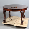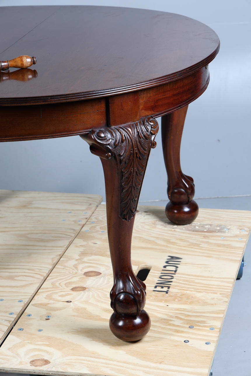 Una mesa de comedor extensible a la manera de Maple & Co., la parte superior circular sobre patas de cabriole talladas en hojas de acanto sobre patas bulbosas en forma de garra y bola, junto con tres hojas y una enrolladora de mesa, 76 cm de altura, 121 cm de diámetro en la forma más compacta, cada hoja mide 41 cm de ancho.