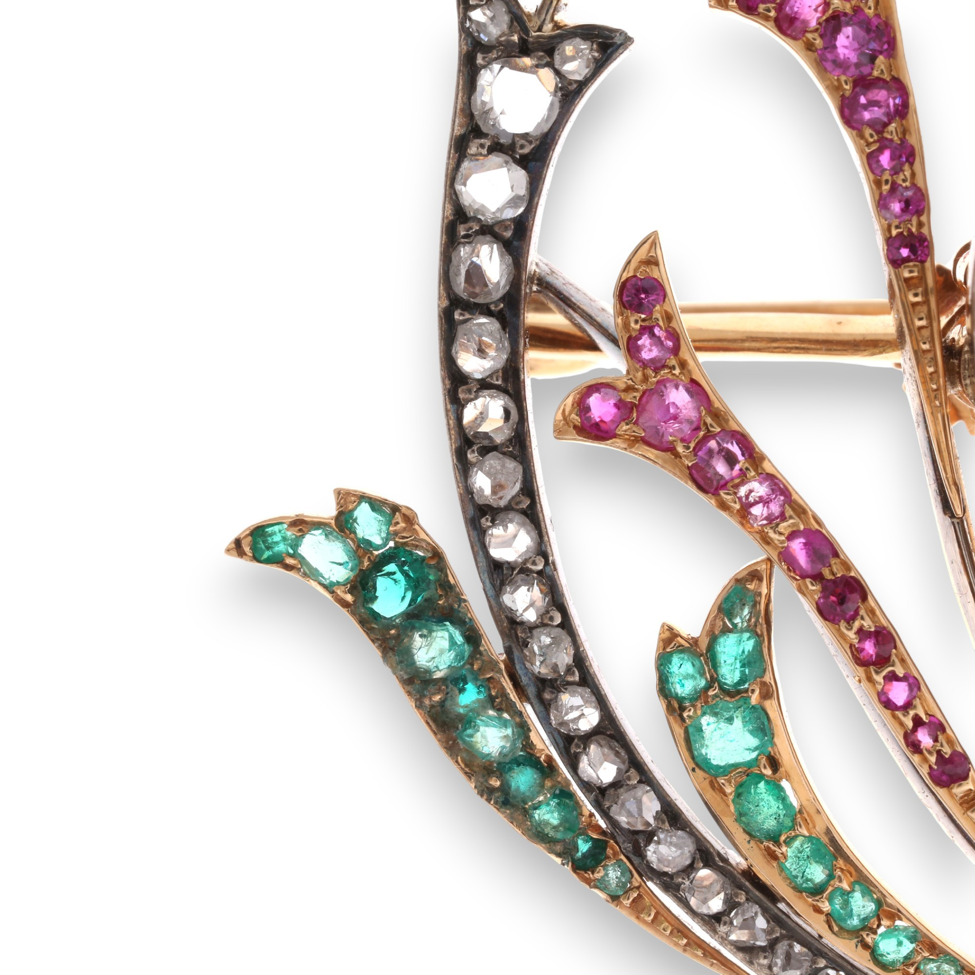 4548008. Broche modernista de diamantes, rubíes y esmeraldas, de principios del siglo XX.