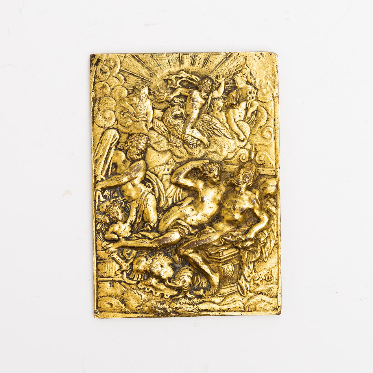 Decoración en relieve con forma de hombre y mujer entre nubes, aproximadamente 8 x 12 cm.
