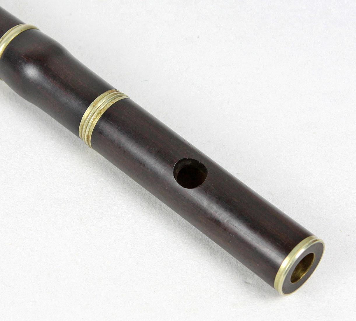 Flauta travesera (flauta flautín) de ébano negro, cuerpo articulado con extremos metálicos y borde de soplado, longitud aprox. 31,5 cm, en buen estado.