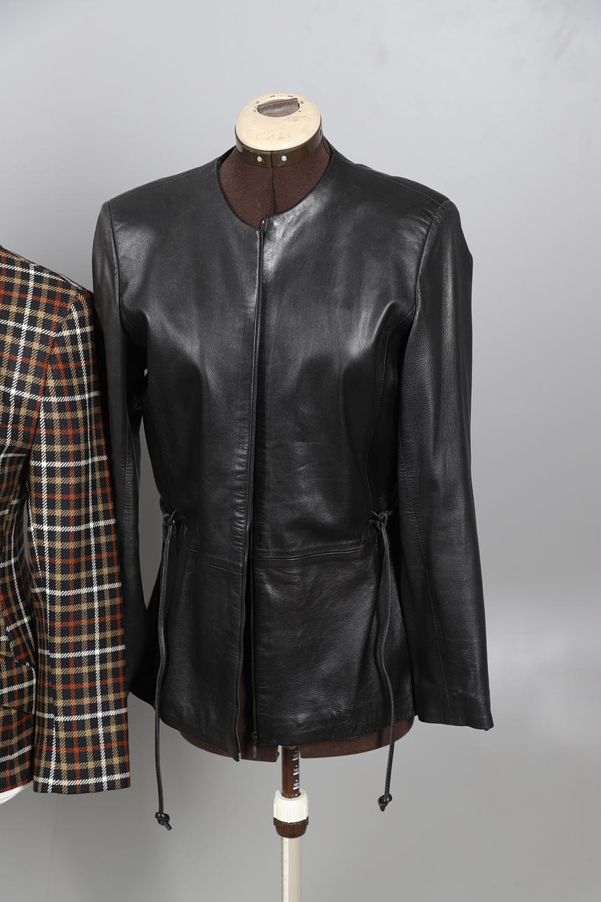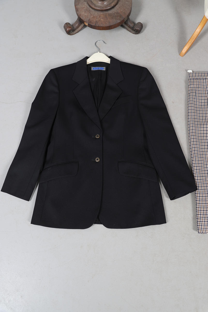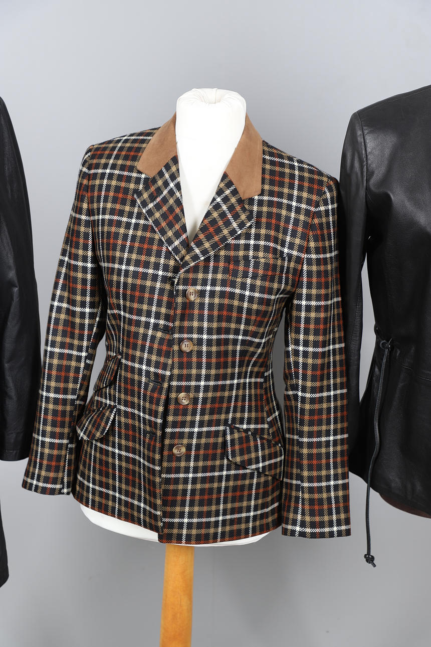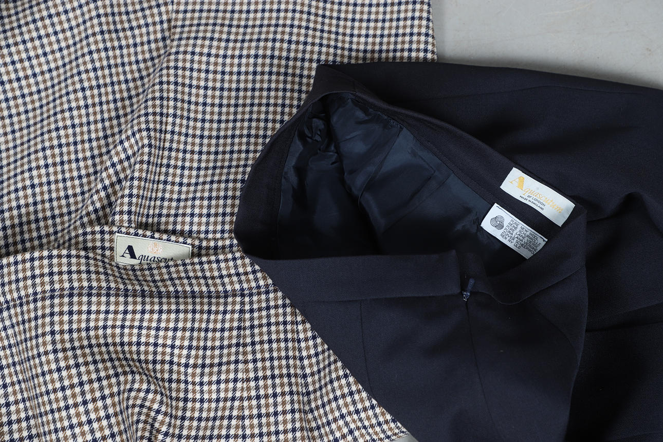 Chaqueta con cinturón Woodland Leather, talla 12, chaqueta con cinturón de cuero negro General Leather Co, talla 10/12, blazer de lana negra Austin Reed, talla 8, chaqueta DAKS Signature de lana a cuadros, talla 12, falda Aquascutum de lana a cuadros, talla 10, y falda plisada azul marino Aquascutum, talla 10 (6).