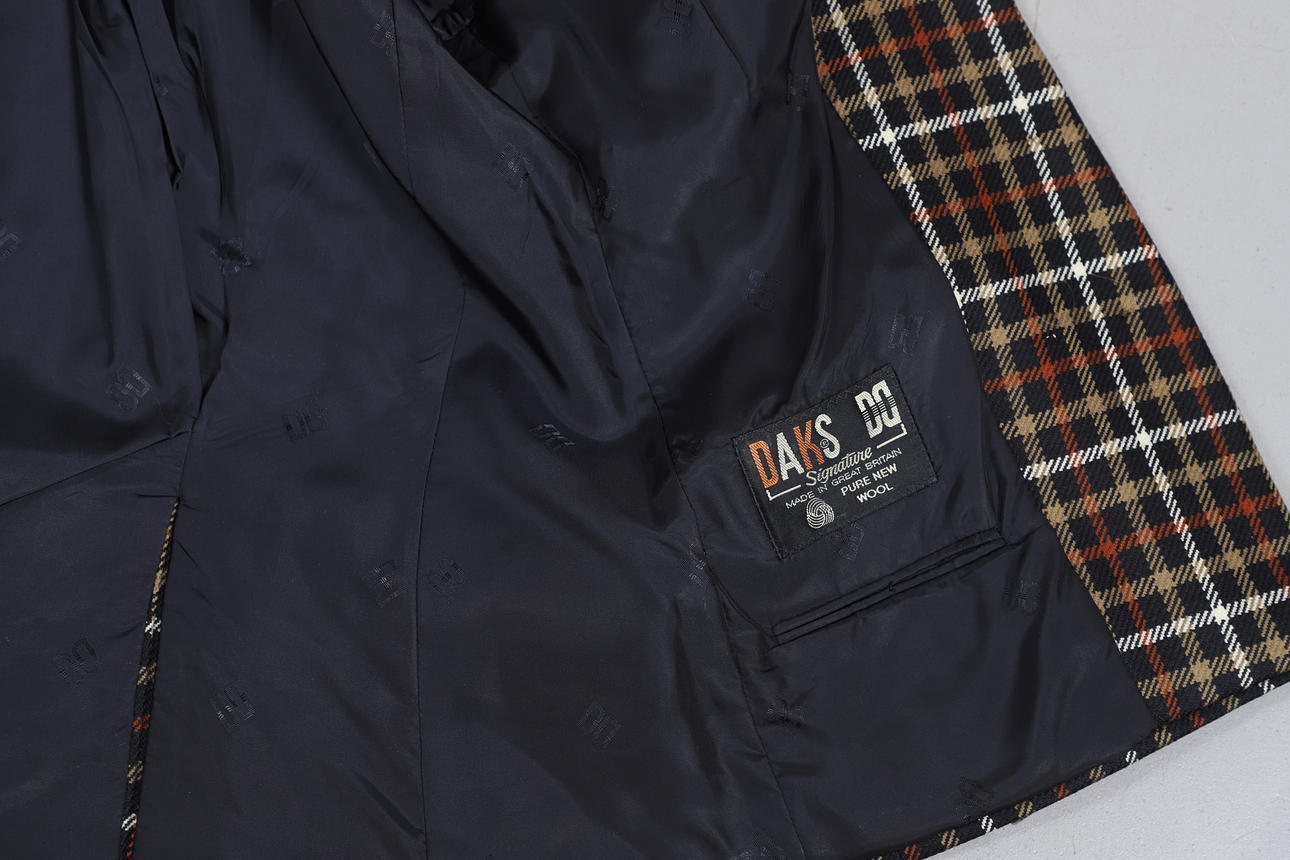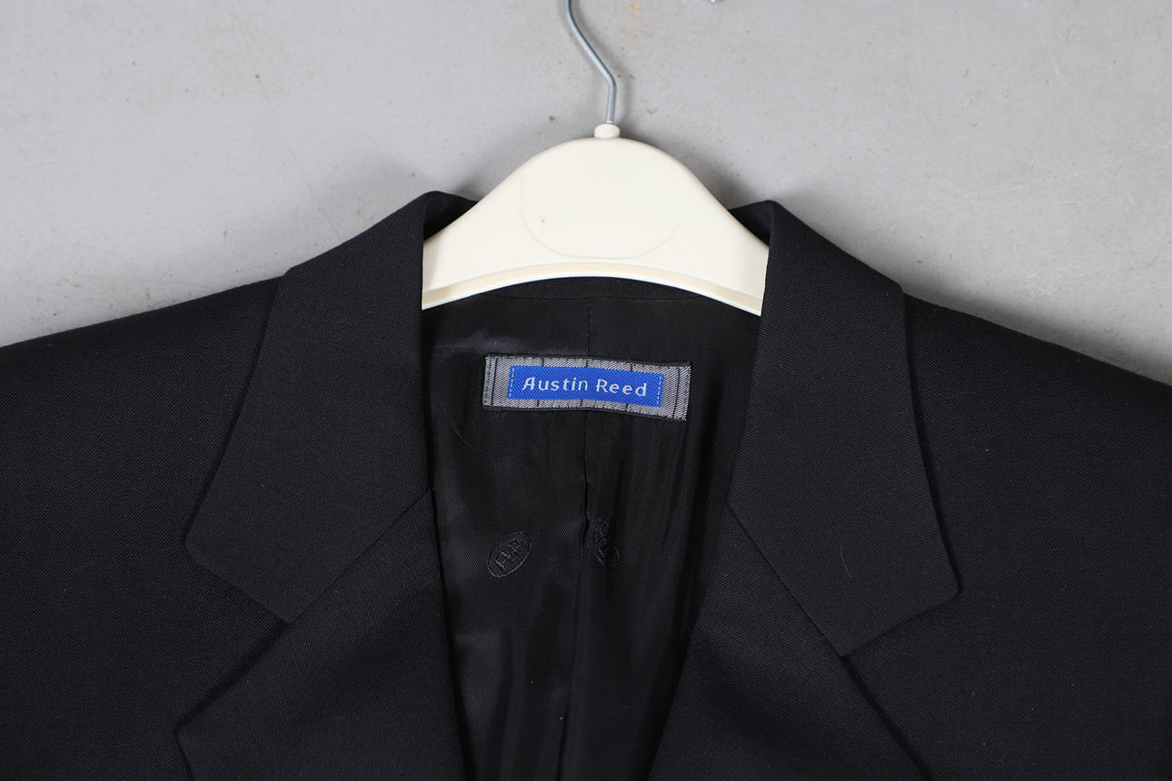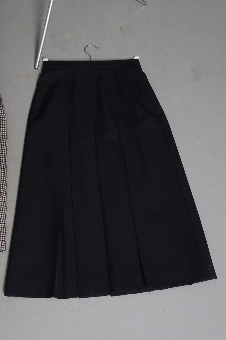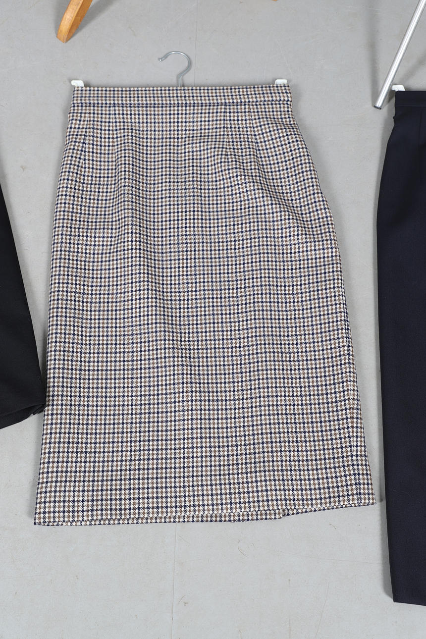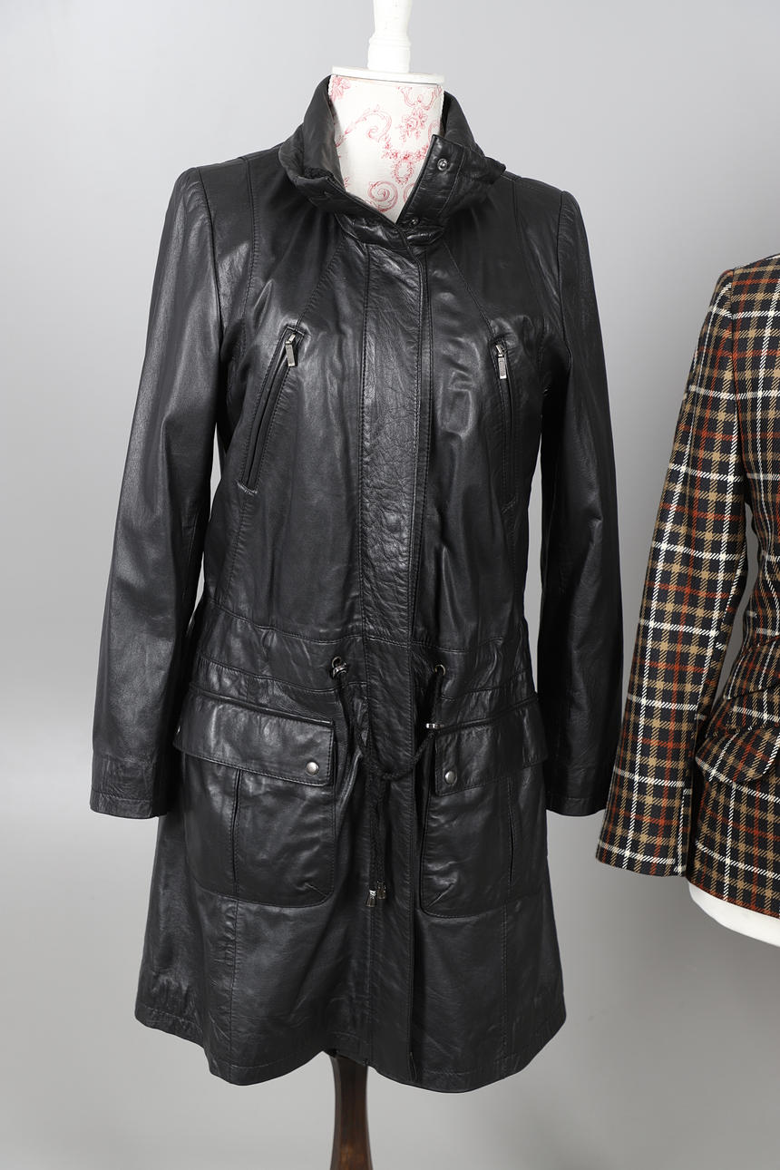 Chaqueta con cinturón Woodland Leather, talla 12, chaqueta con cinturón de cuero negro General Leather Co, talla 10/12, blazer de lana negra Austin Reed, talla 8, chaqueta DAKS Signature de lana a cuadros, talla 12, falda Aquascutum de lana a cuadros, talla 10, y falda plisada azul marino Aquascutum, talla 10 (6).