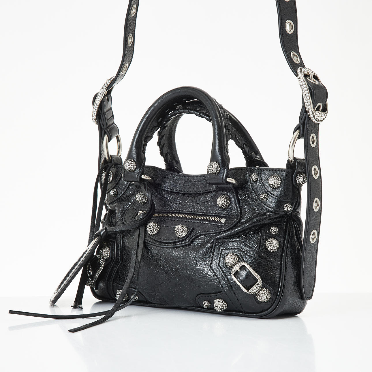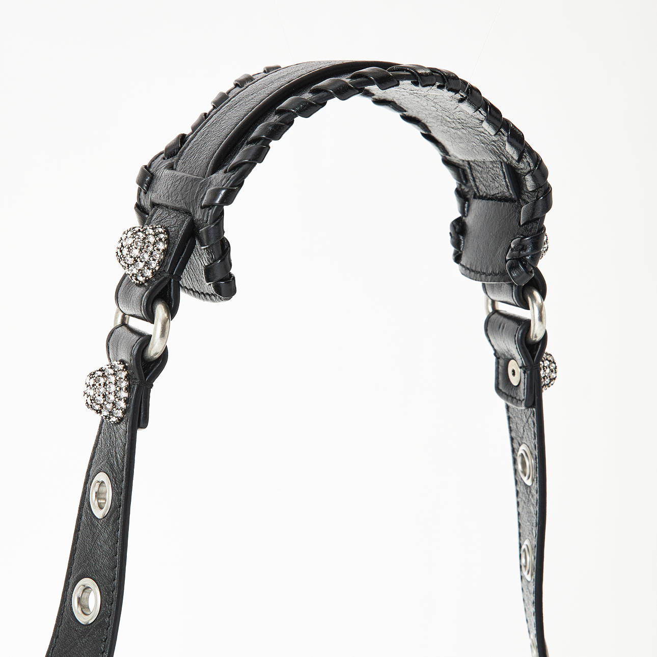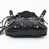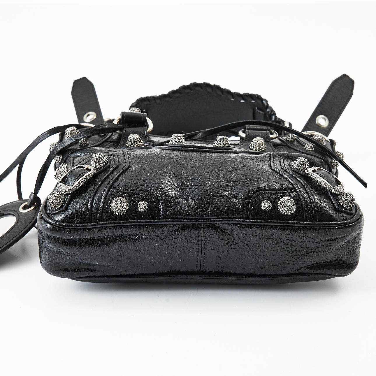 Piel de cordero Black Arena, metal blanco, tachuelas y hebillas adornadas con strass, correa de hombro desmontable y ajustable, espejo de bolsillo extraíble en forma de corazón, cierre con cremallera, forrado en tela negra, interior con un compartimento más pequeño con cremallera, con la inscripción «Balenciaga made in Italy», bolsa para el polvo incluida, dimensiones aproximadas de 23 x 15 x 6 cm.