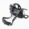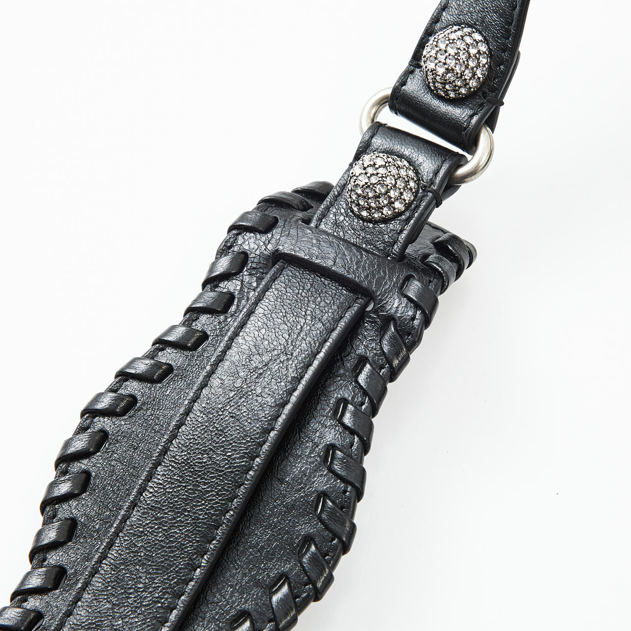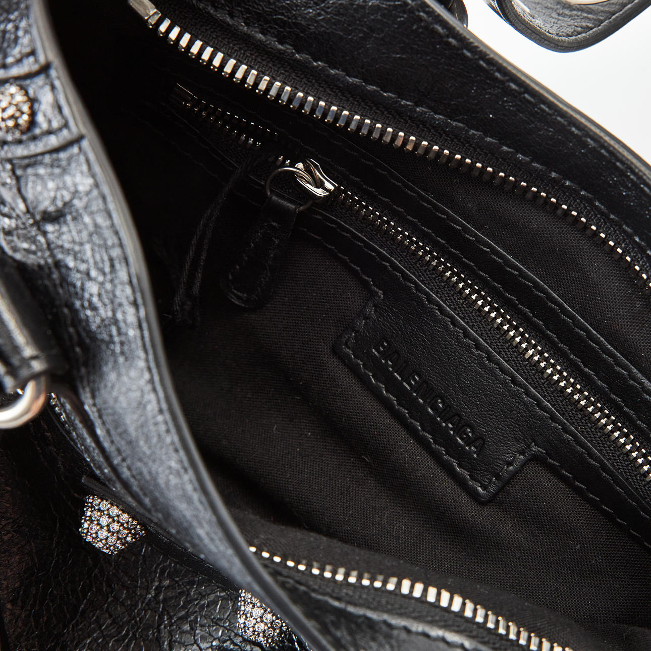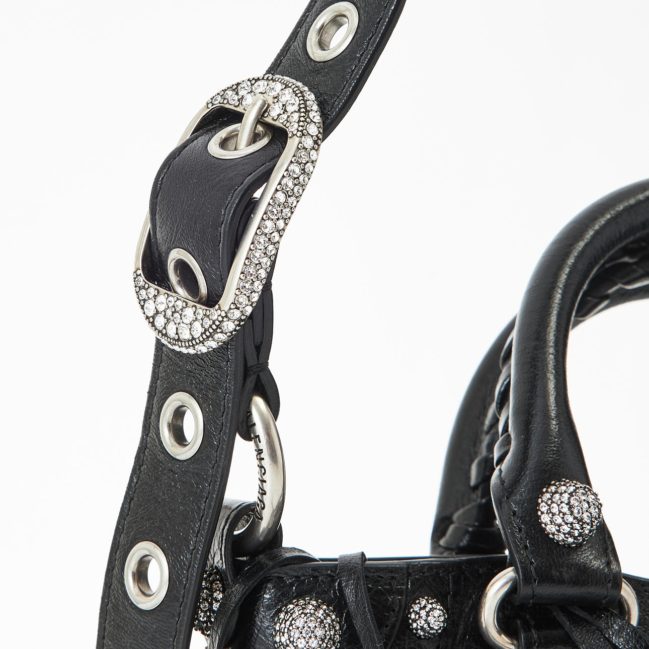 Piel de cordero Black Arena, metal blanco, tachuelas y hebillas adornadas con strass, correa de hombro desmontable y ajustable, espejo de bolsillo extraíble en forma de corazón, cierre con cremallera, forrado en tela negra, interior con un compartimento más pequeño con cremallera, con la inscripción «Balenciaga made in Italy», bolsa para el polvo incluida, dimensiones aproximadas de 23 x 15 x 6 cm.