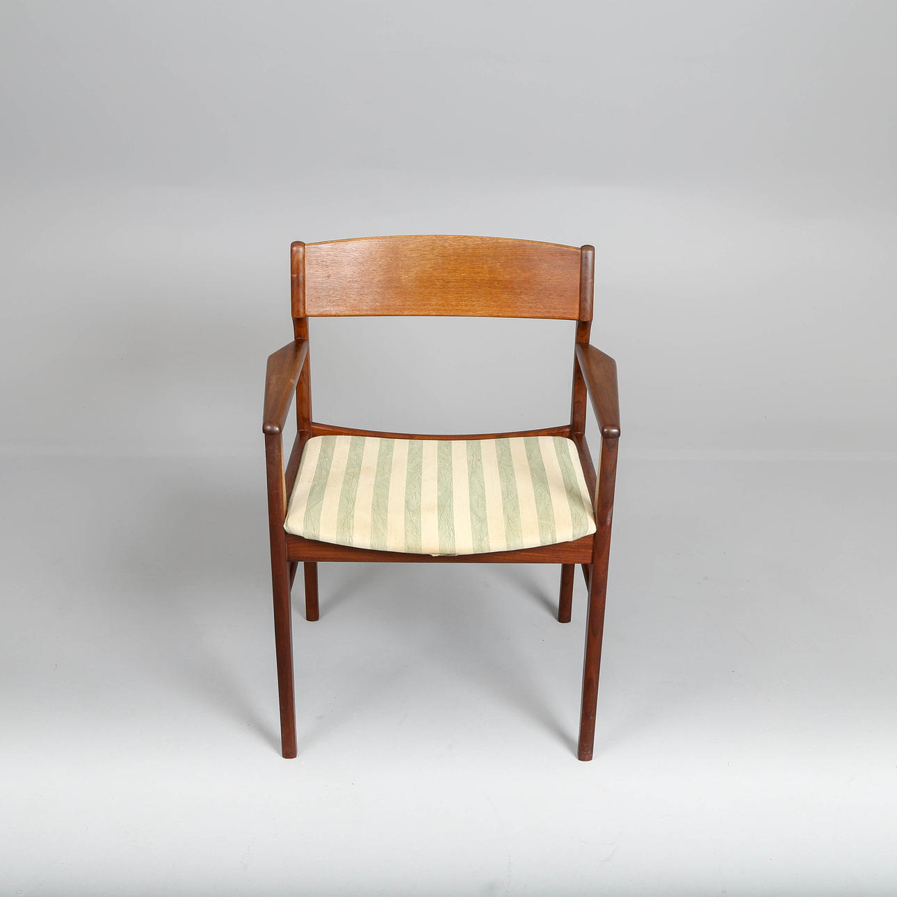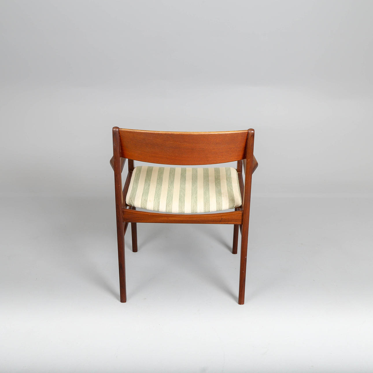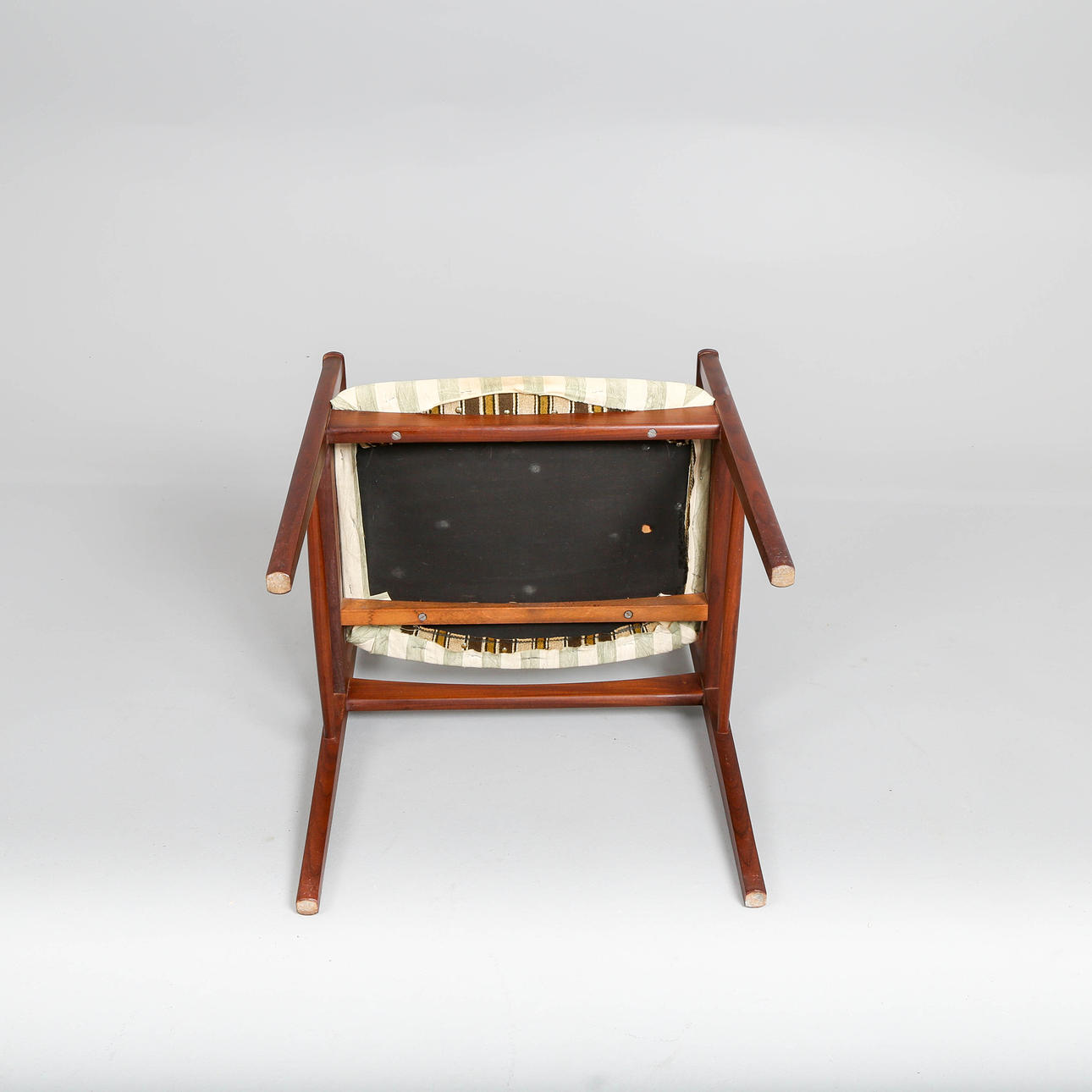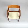 Sillón de madera maciza de teca, respaldo curvo de teca chapada con forma tensada, asiento tapizado en tela a rayas. Década de 1960. H. 76, B. 58, D. 43 cm. Sh. 43 cm.