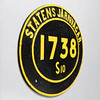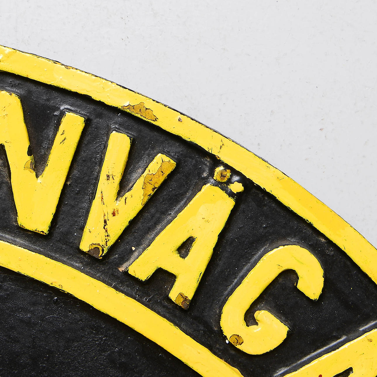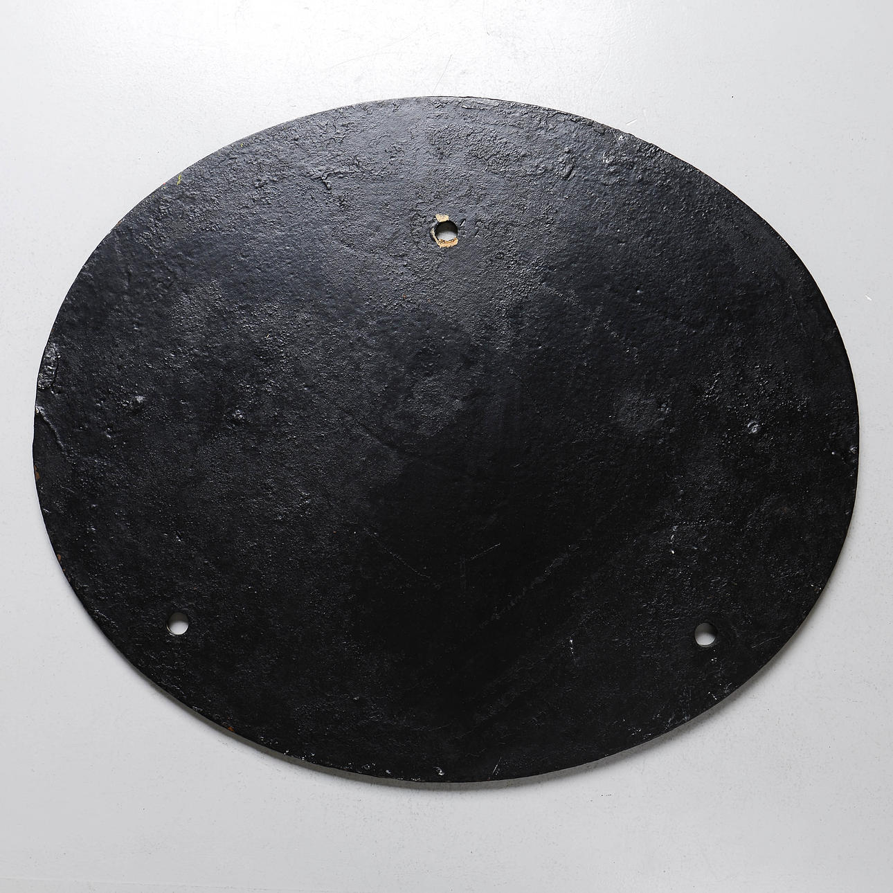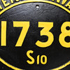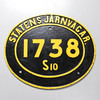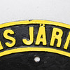 Cartel ovalado en hierro fundido. Decoración en relieve del texto «Statens Järn1738 S10". Dimensiones 51 x 42 cm.