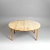 Mesa de comedor ovalada de madera maciza de roble tratada con jabón y extraíble. H. 70,5, L. 140, B. 120 cm. A esto, dos placas adicionales, B. 49 cm.