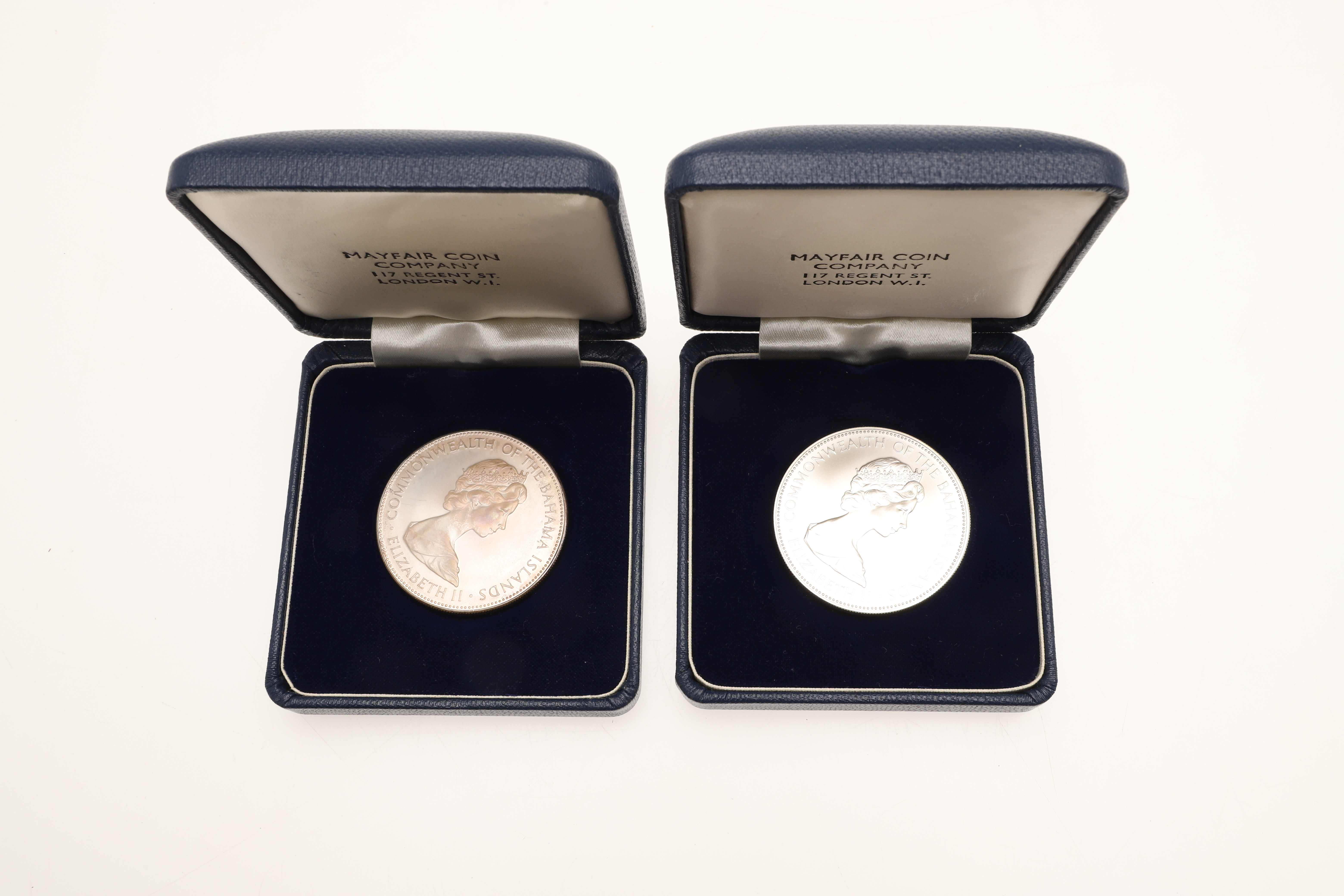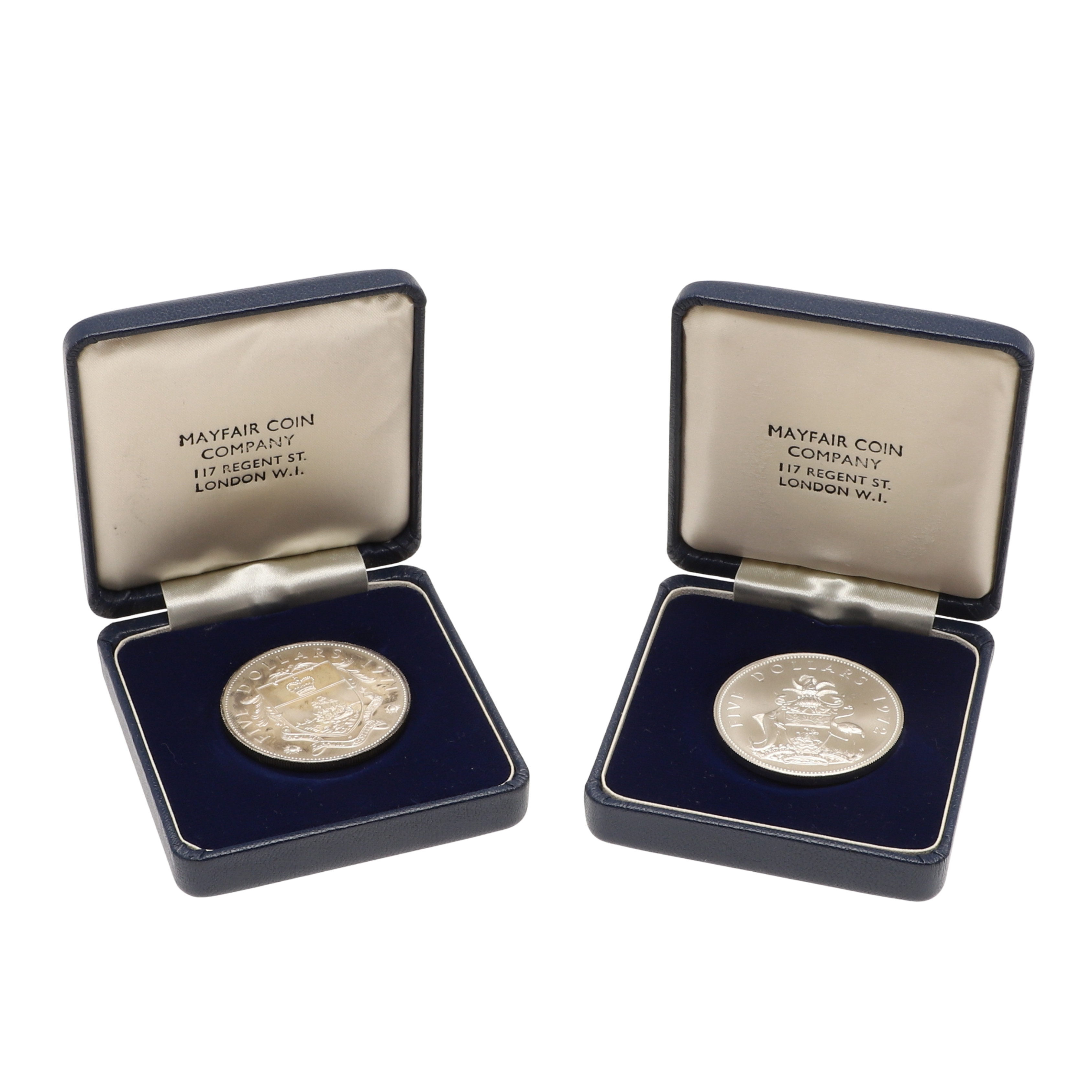 4665104. MONEDAS DE CINCO DOLARES DE PLATA DE DOS ISLAS BAHAMAS.