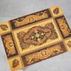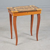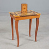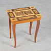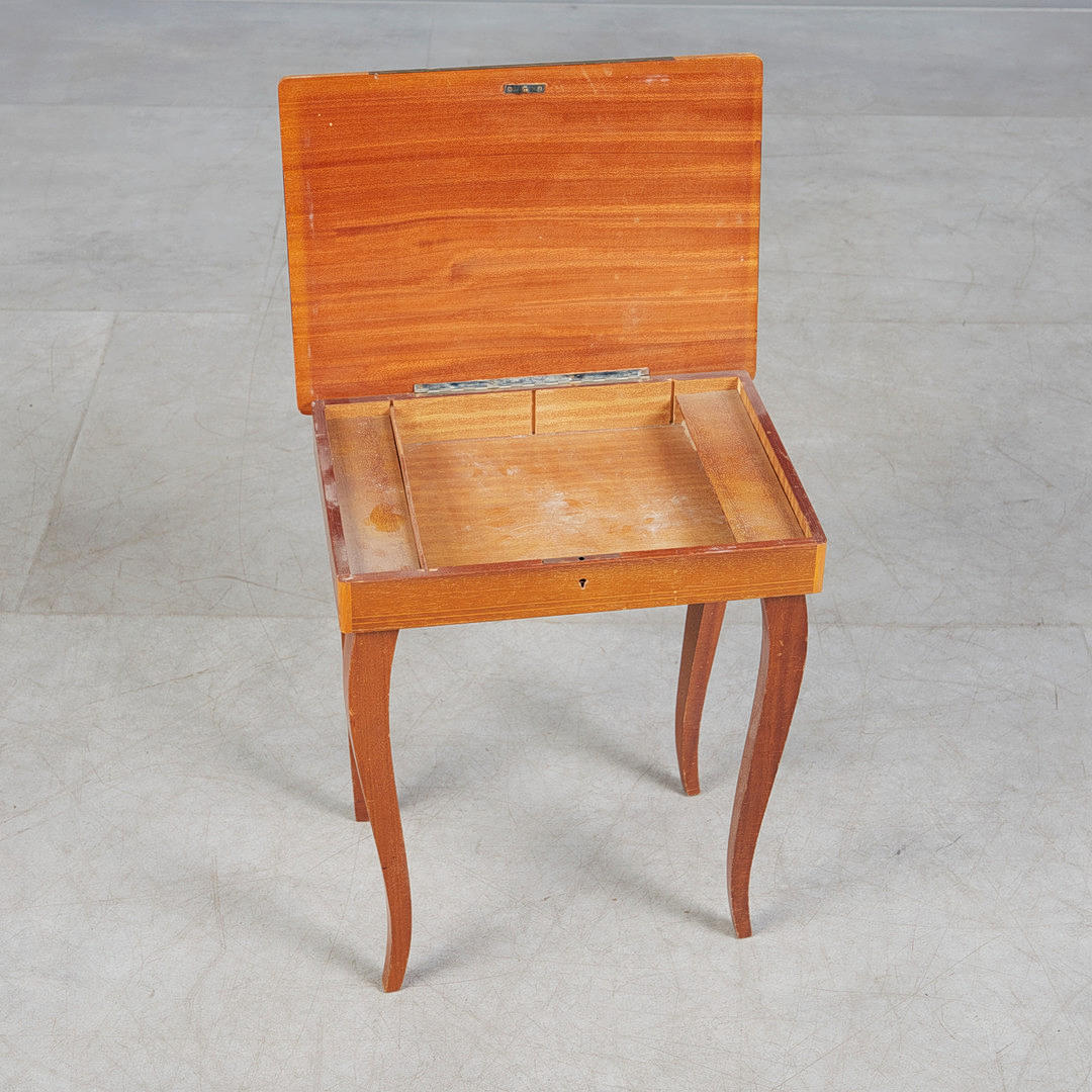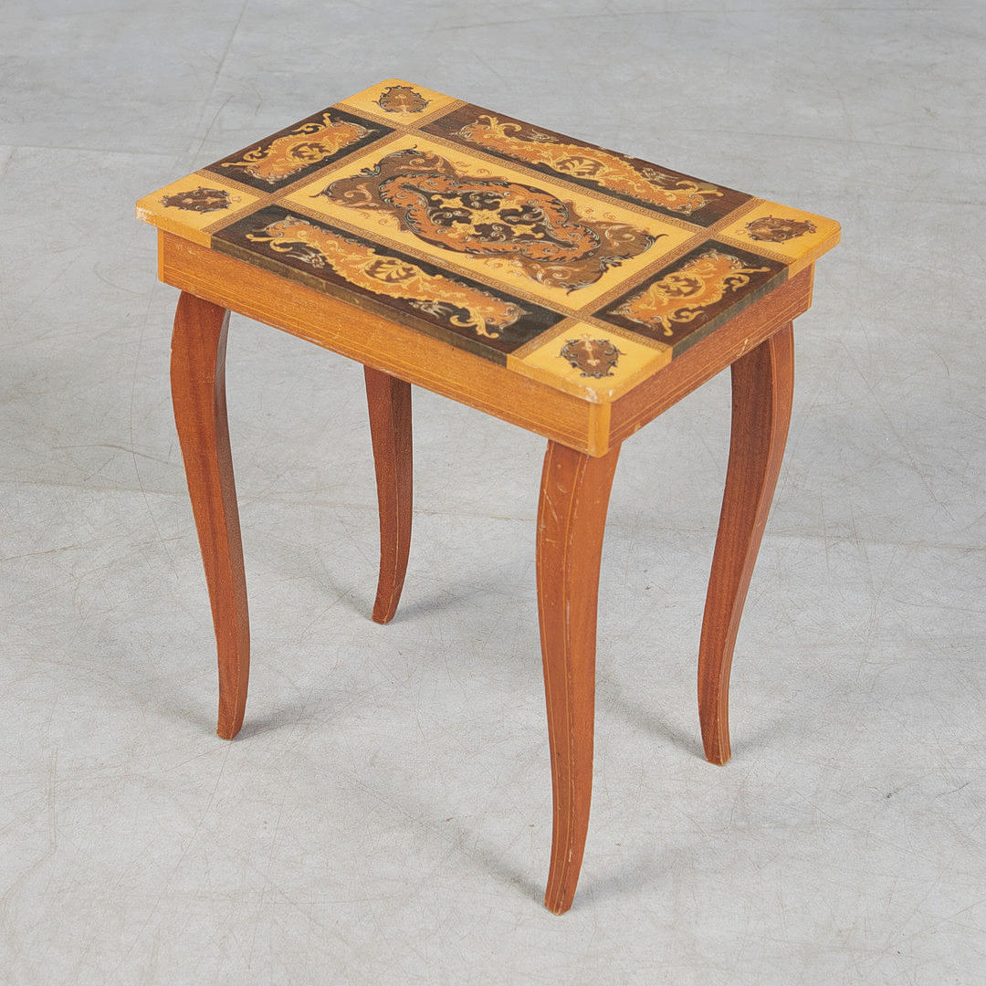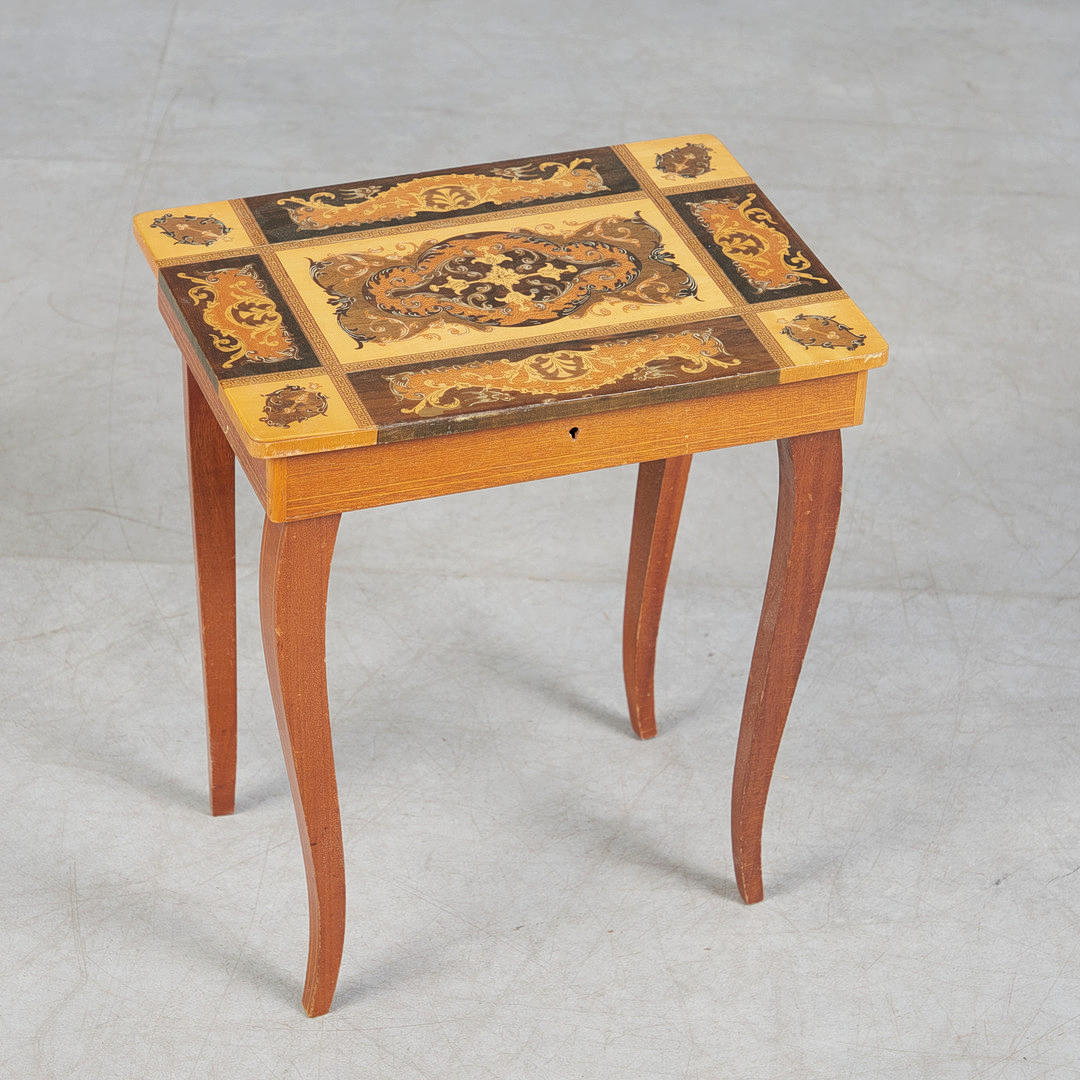 Mesa auxiliar, antigua caja de música, caja de costura y caja de cigarrillos, incrustaciones de madera de varios colores, lacada, Italia.