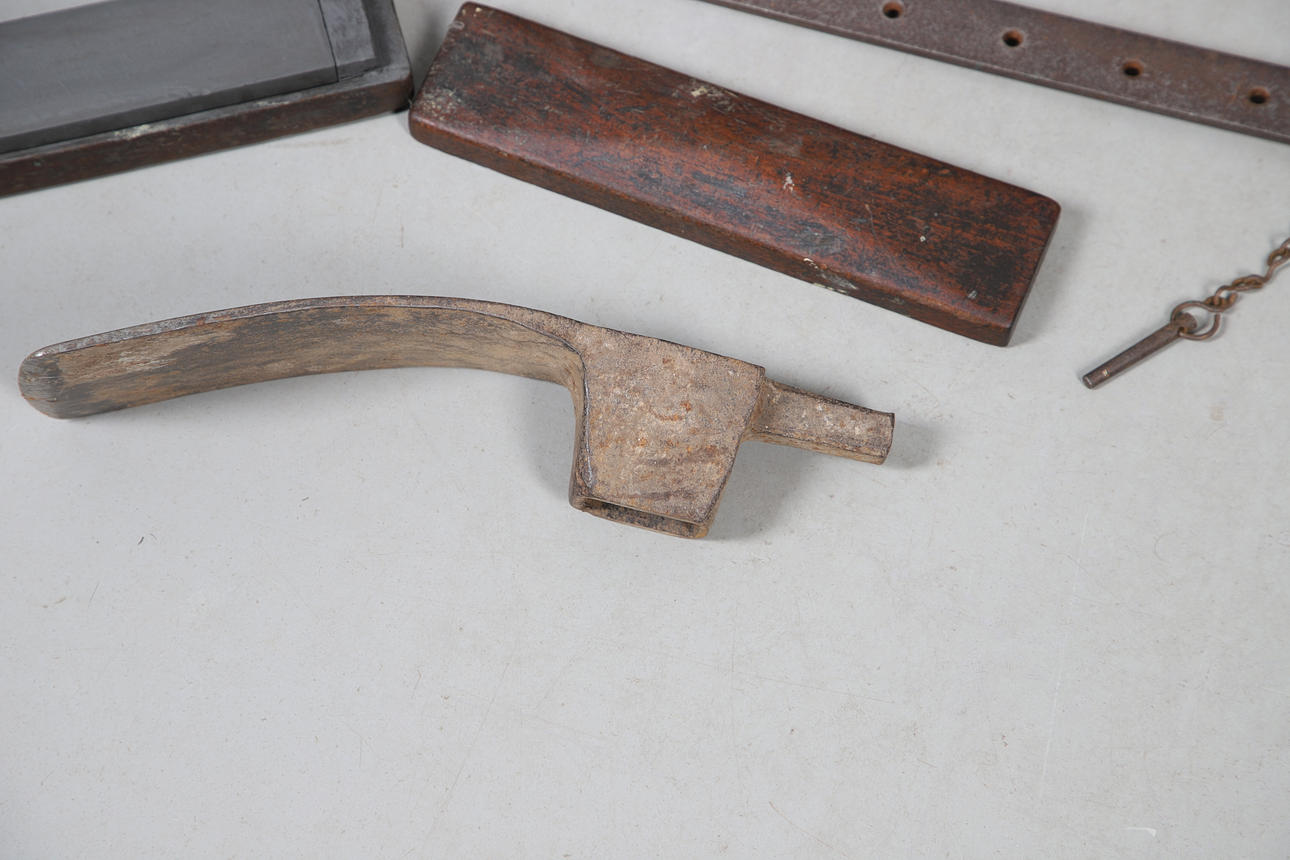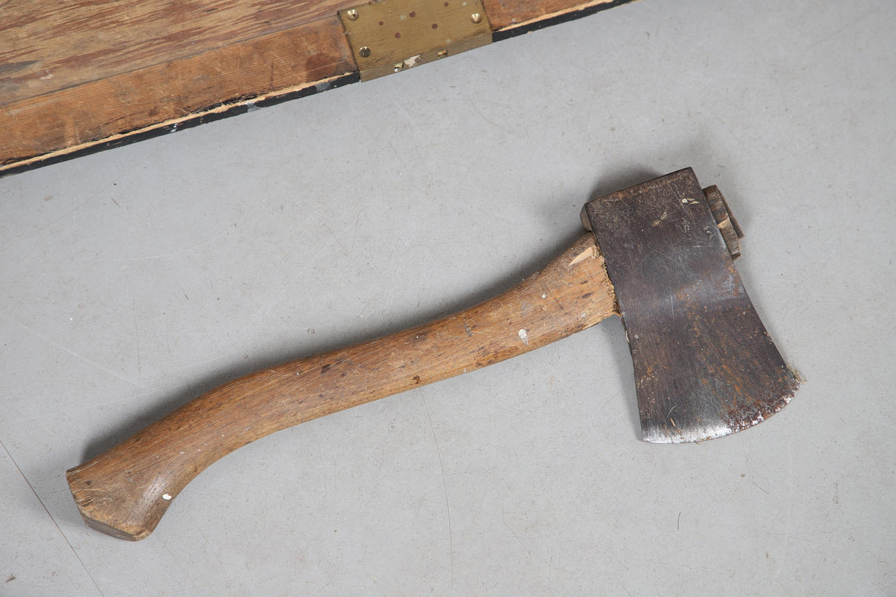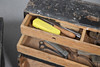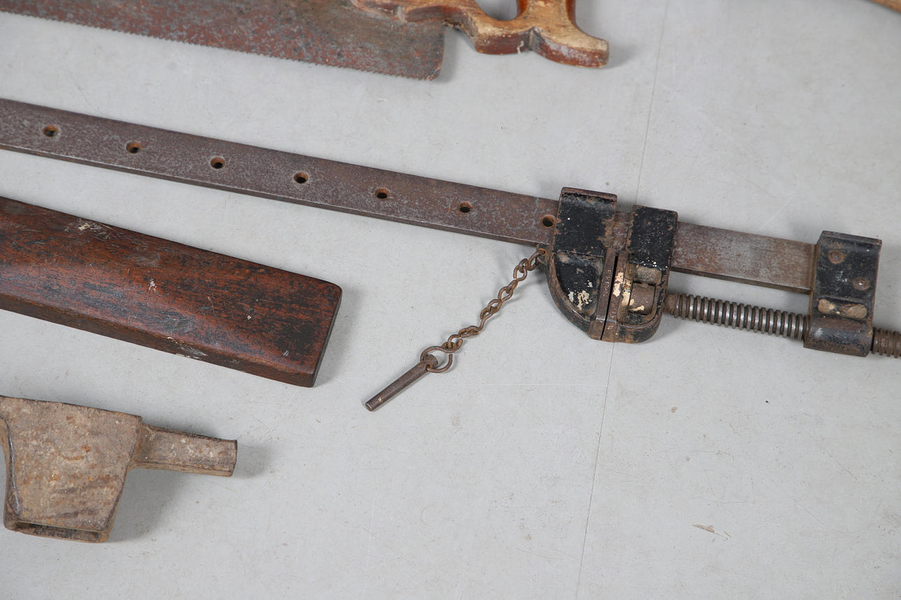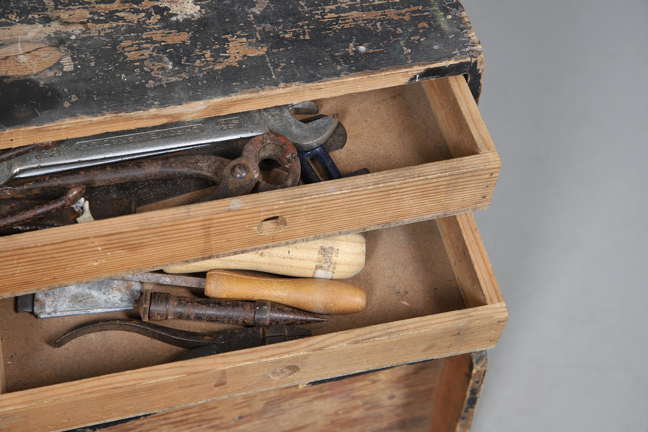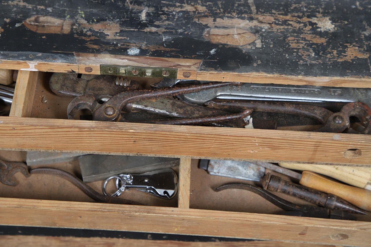 Para incluir dos cajas de herramientas de madera antiguas con varias herramientas, como sierras, hachas, martillos, etc. La más grande de las dos cajas contiene dos cajones de pino. El tamaño de la más grande es de 18 cm (alto) x 68,5 cm (ancho) x 38 cm (profundidad). (2).