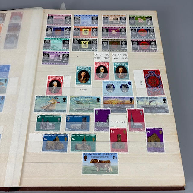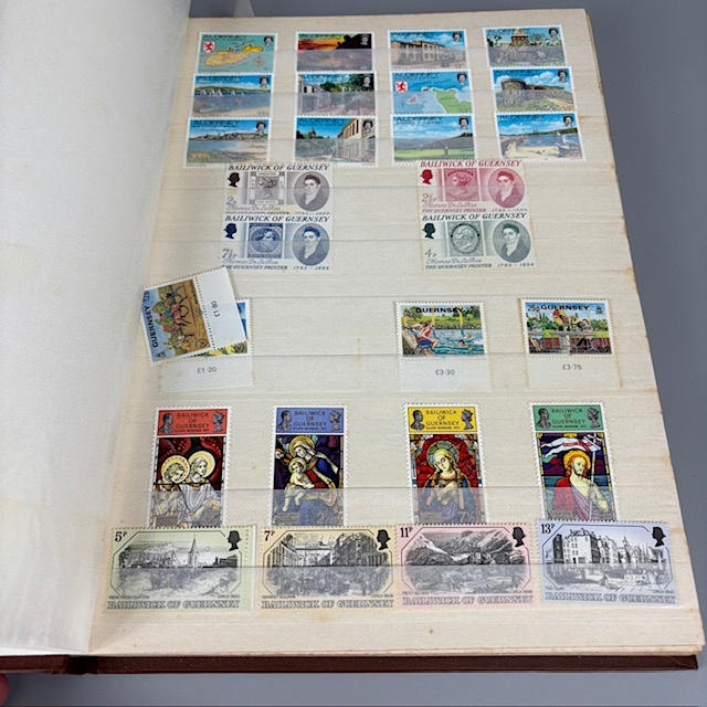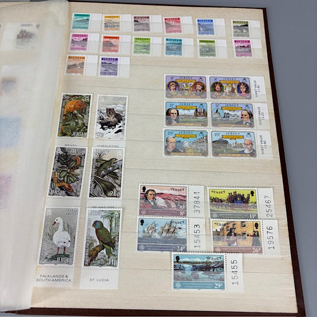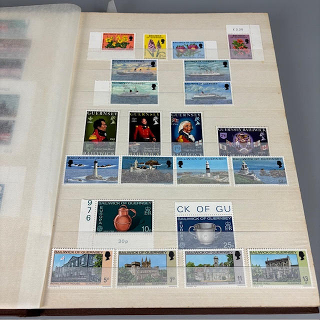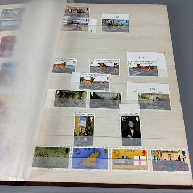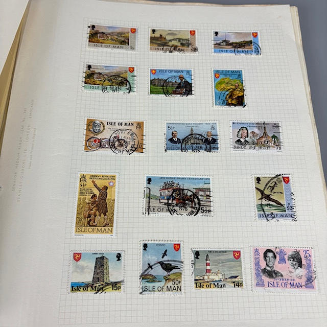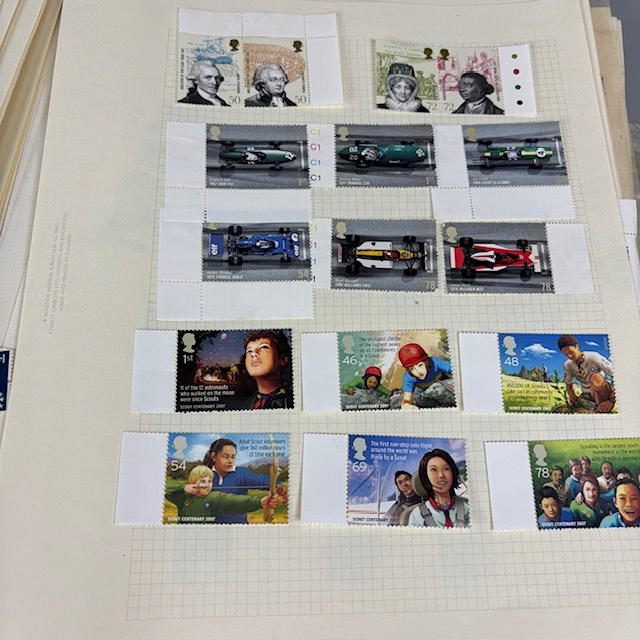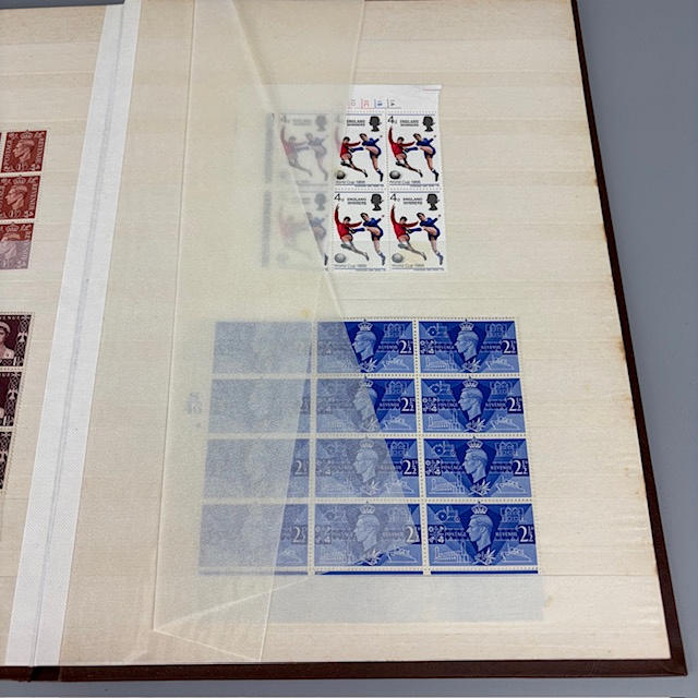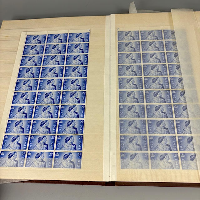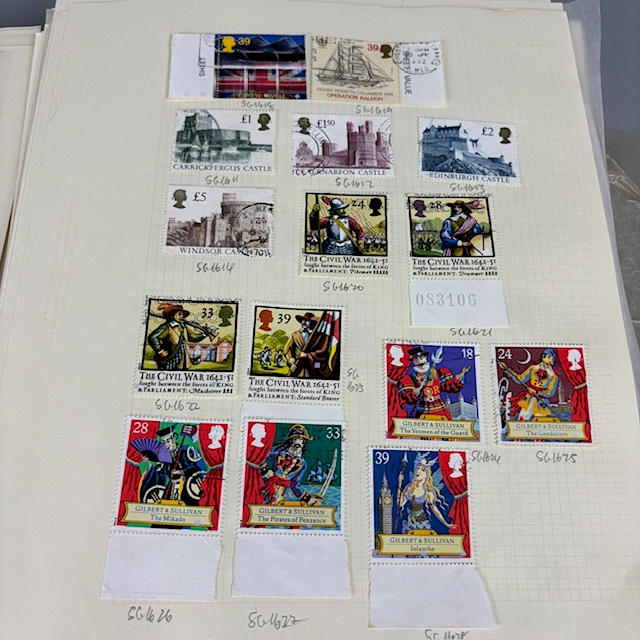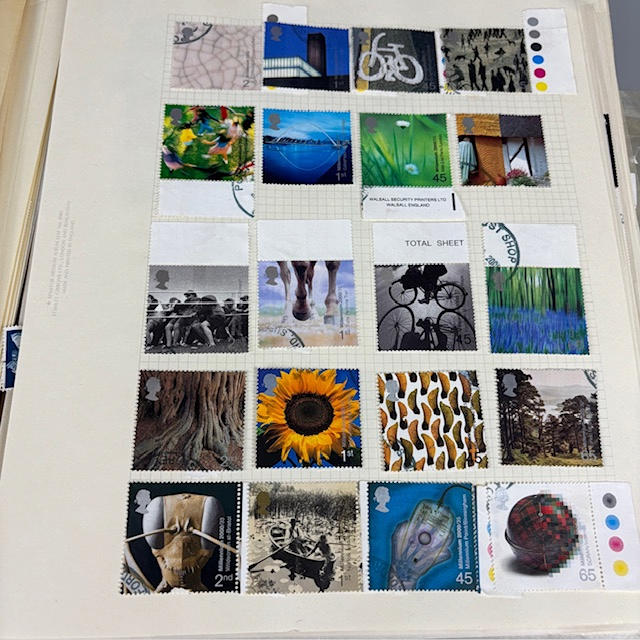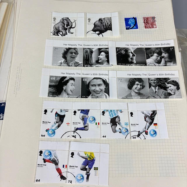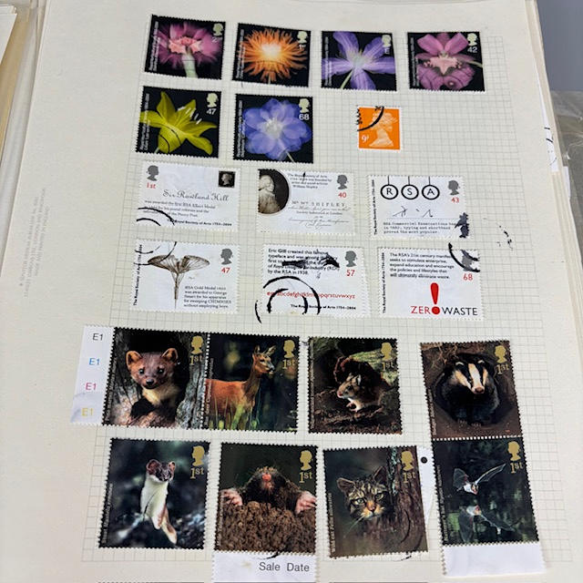 Colección de sellos postales británicos contenida en dos álbumes, que contienen 1/2 y 1/4 hojas, tiradas, individuales y dobles, muchos de ellos con orillos en las esquinas y los bordes, que datan de la década de 1930 a 1990, y una parte de un álbum de sellos europeos.