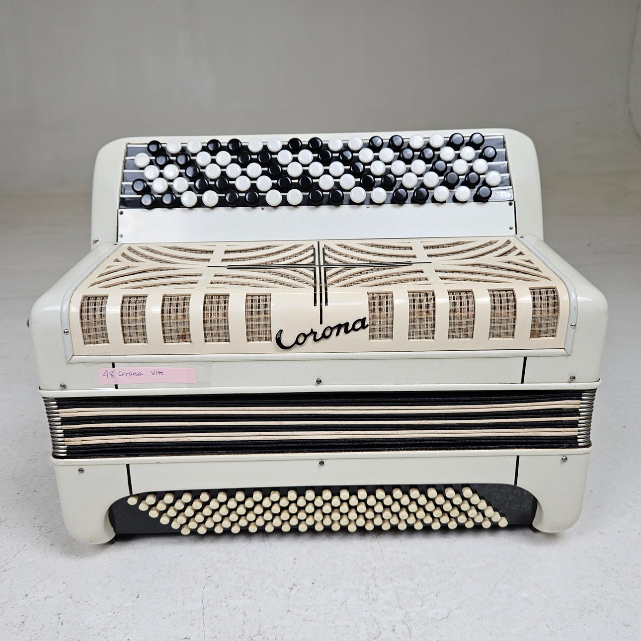 Corona, acordeón blanco con botones de 3 radios, aprox. 46 x 38 x 21 cm.