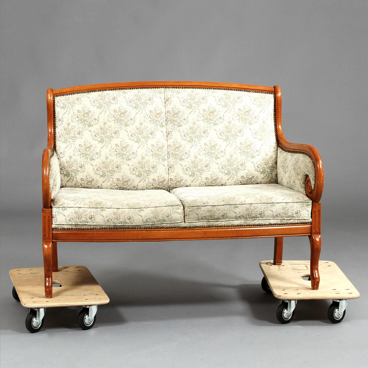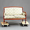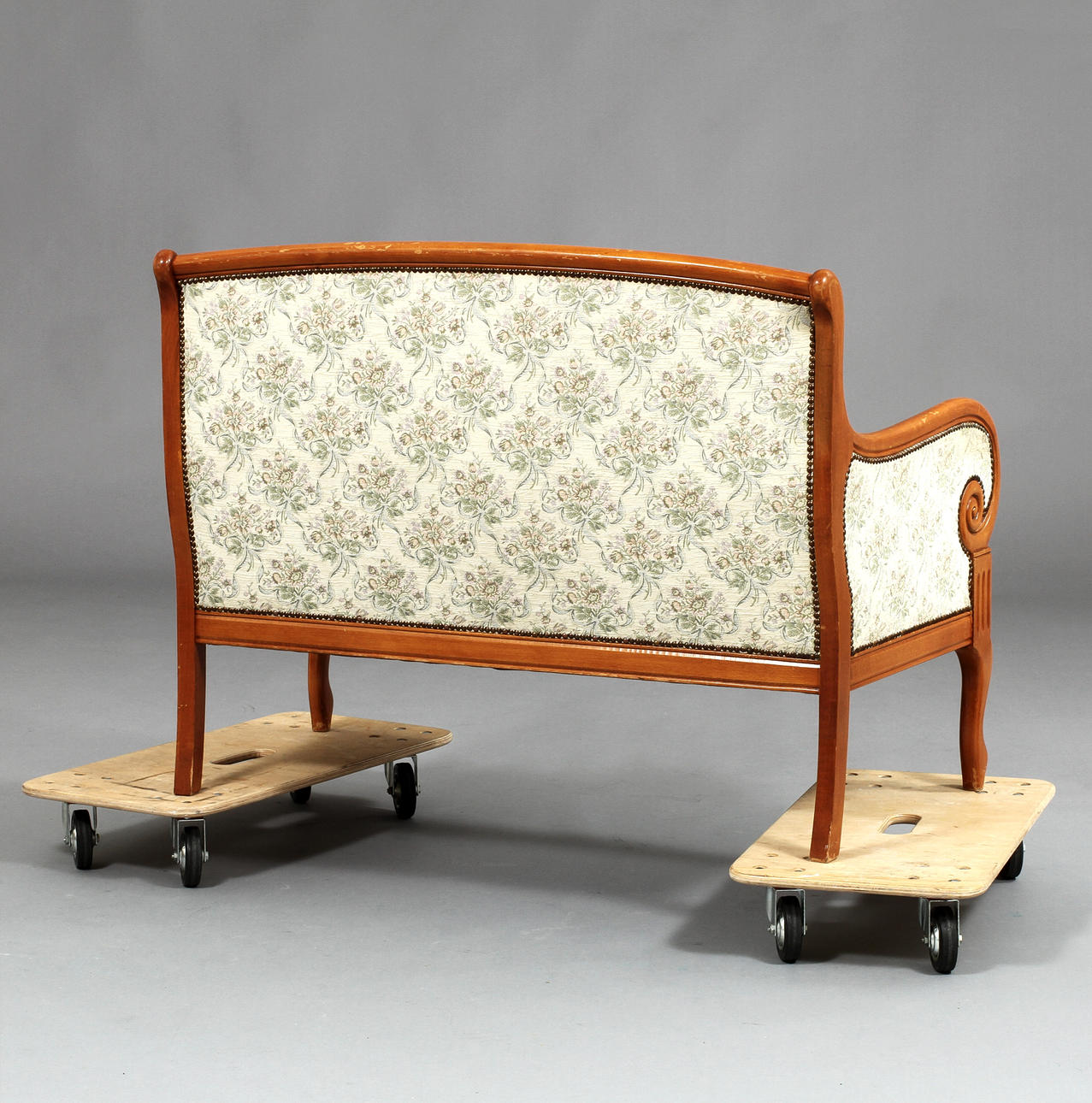 Madera teñida de marrón. Piernas y brazos curvos. Respaldo y asiento tapizados. Longitud 126 cm.