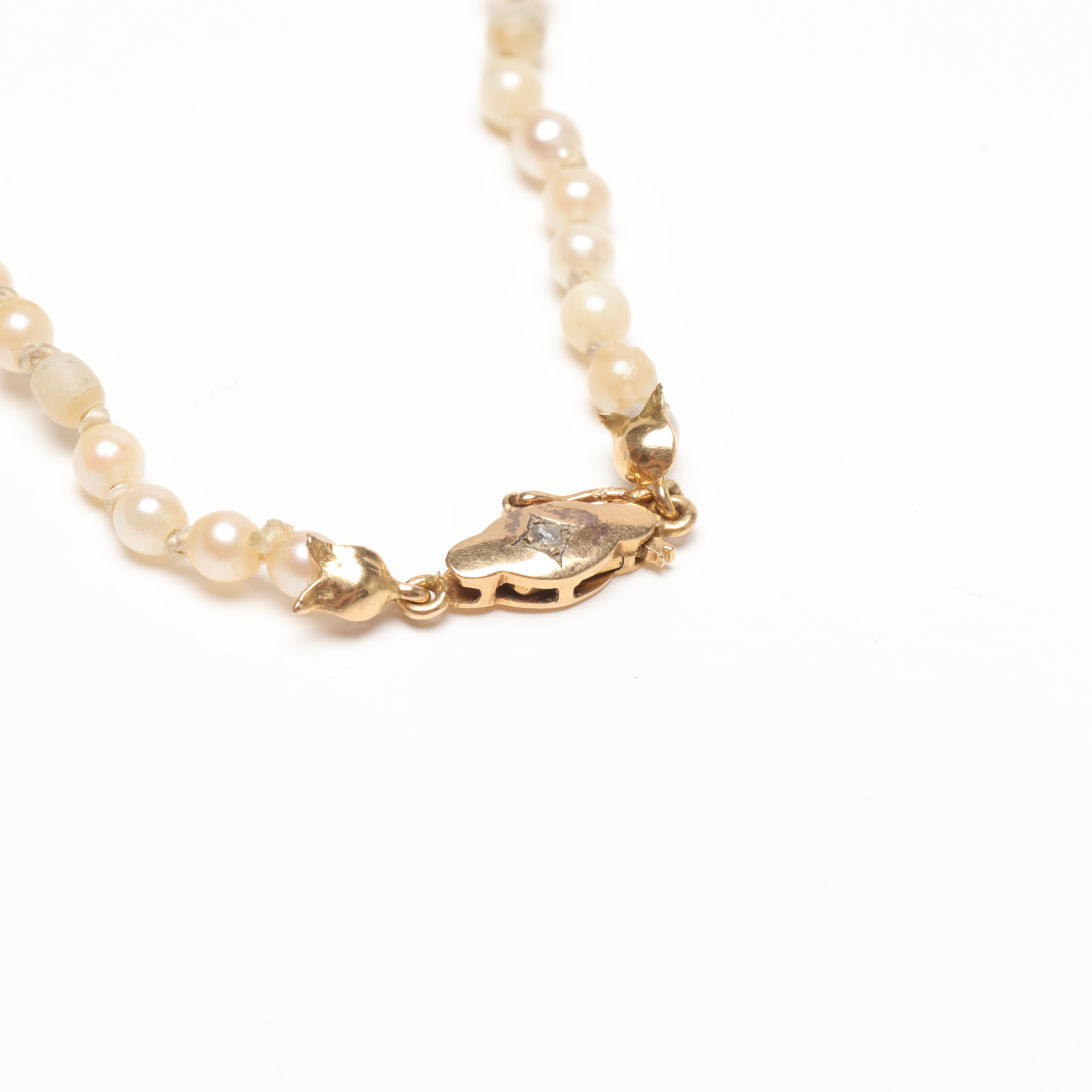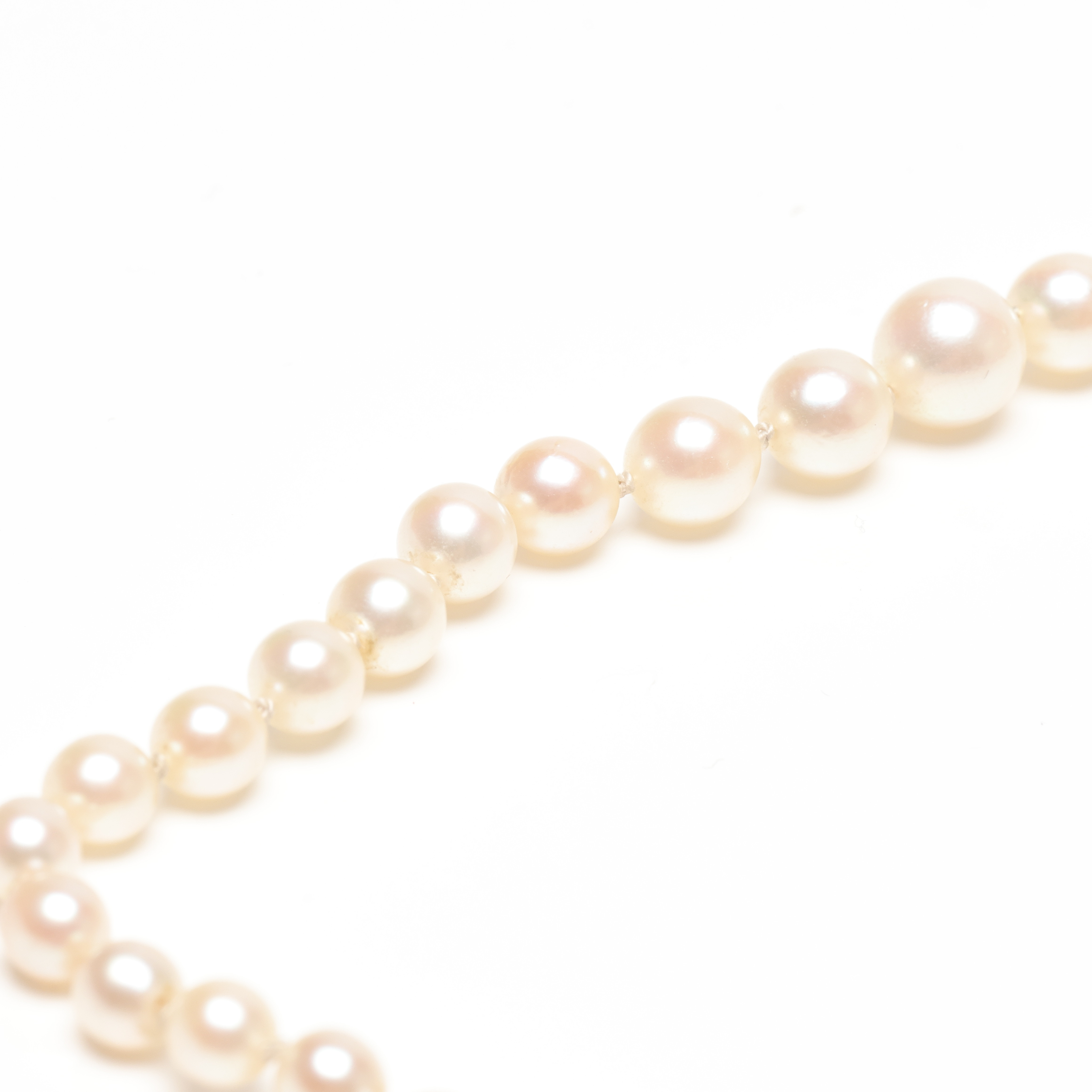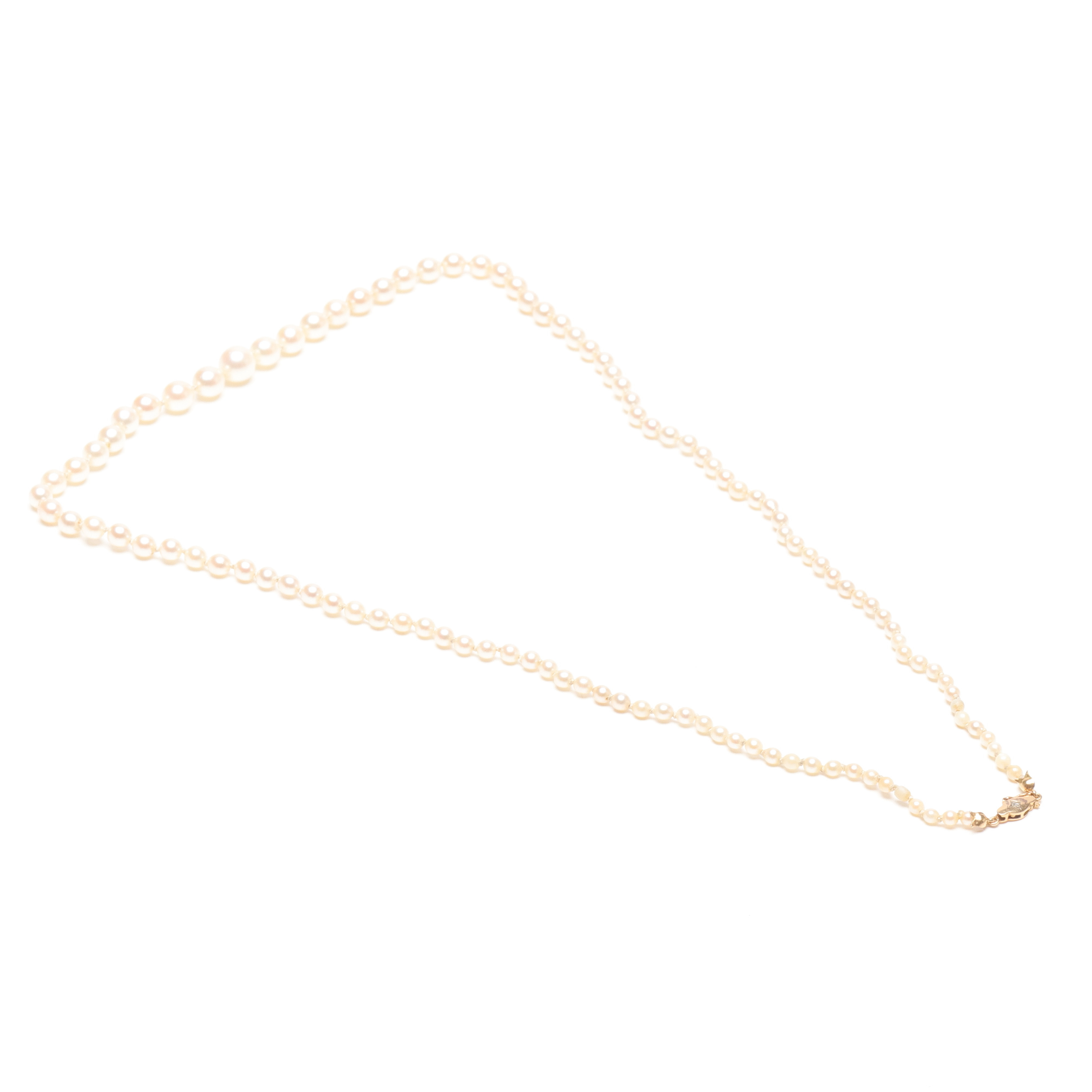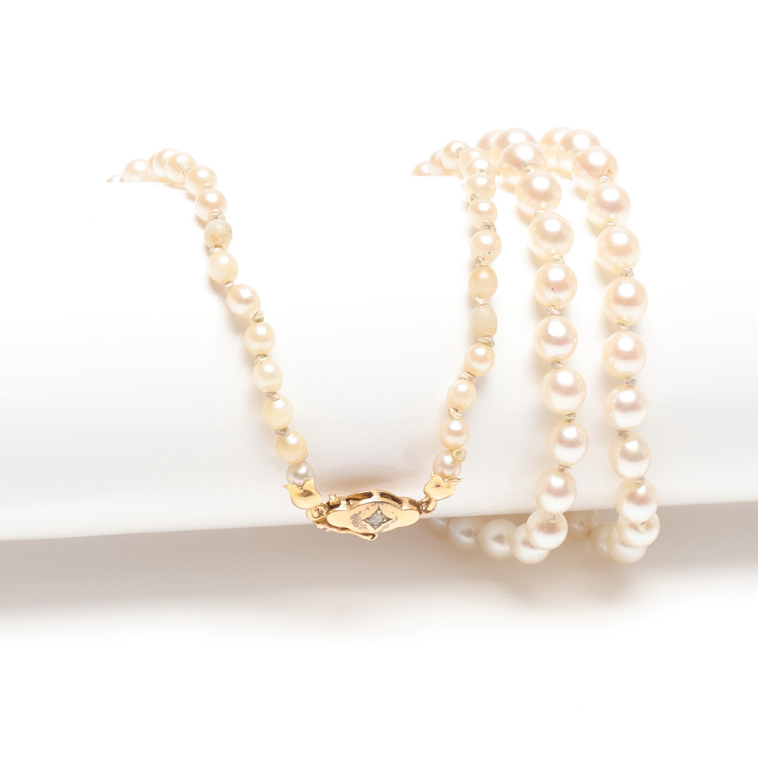 4988581. Un collar de perlas de concha con cierre dorado.