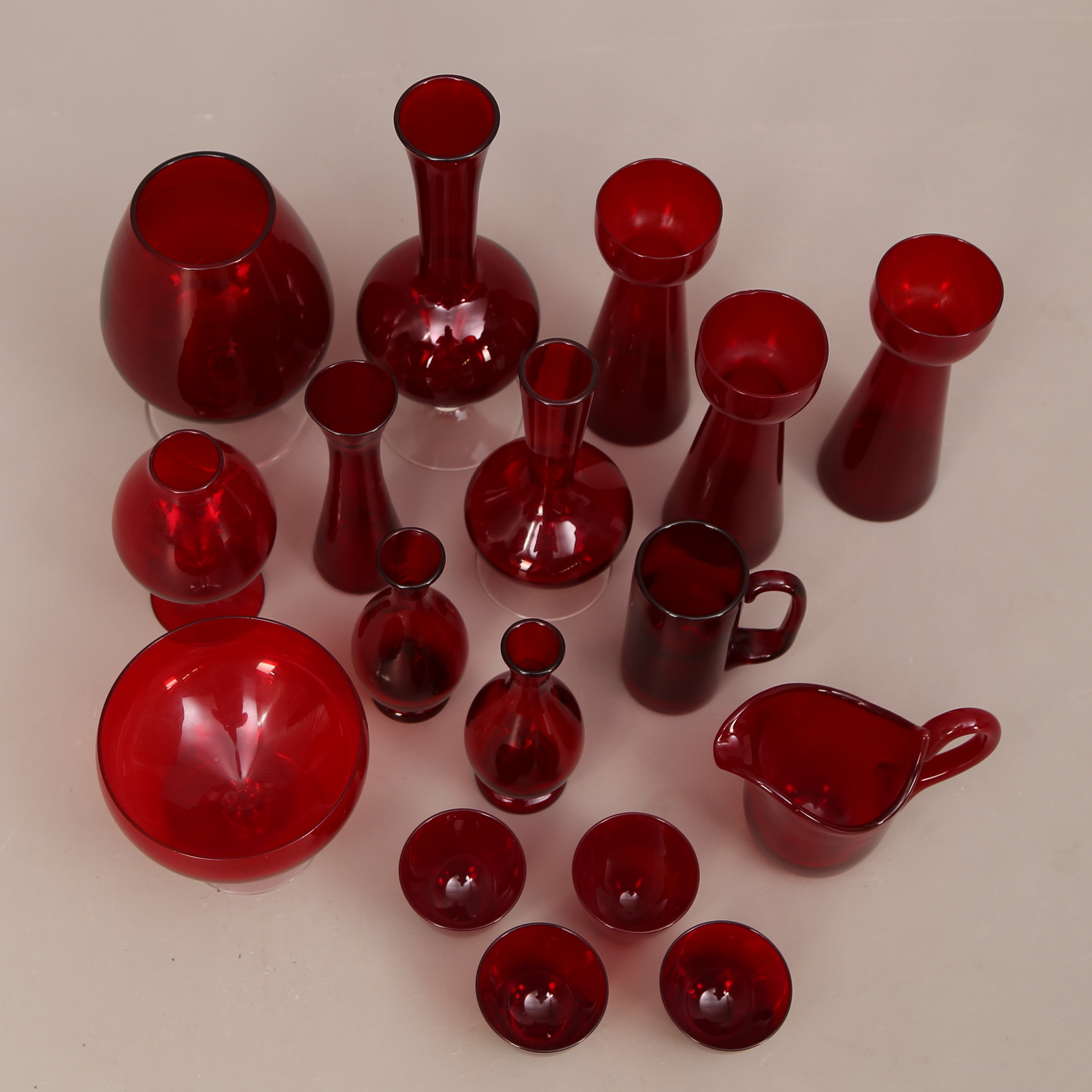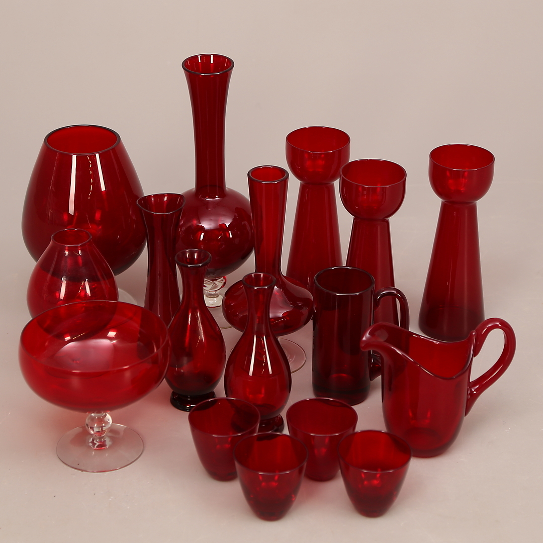 499648. OBJETOS DE VIDRIO, 17 piezas, rojo, 1900.