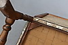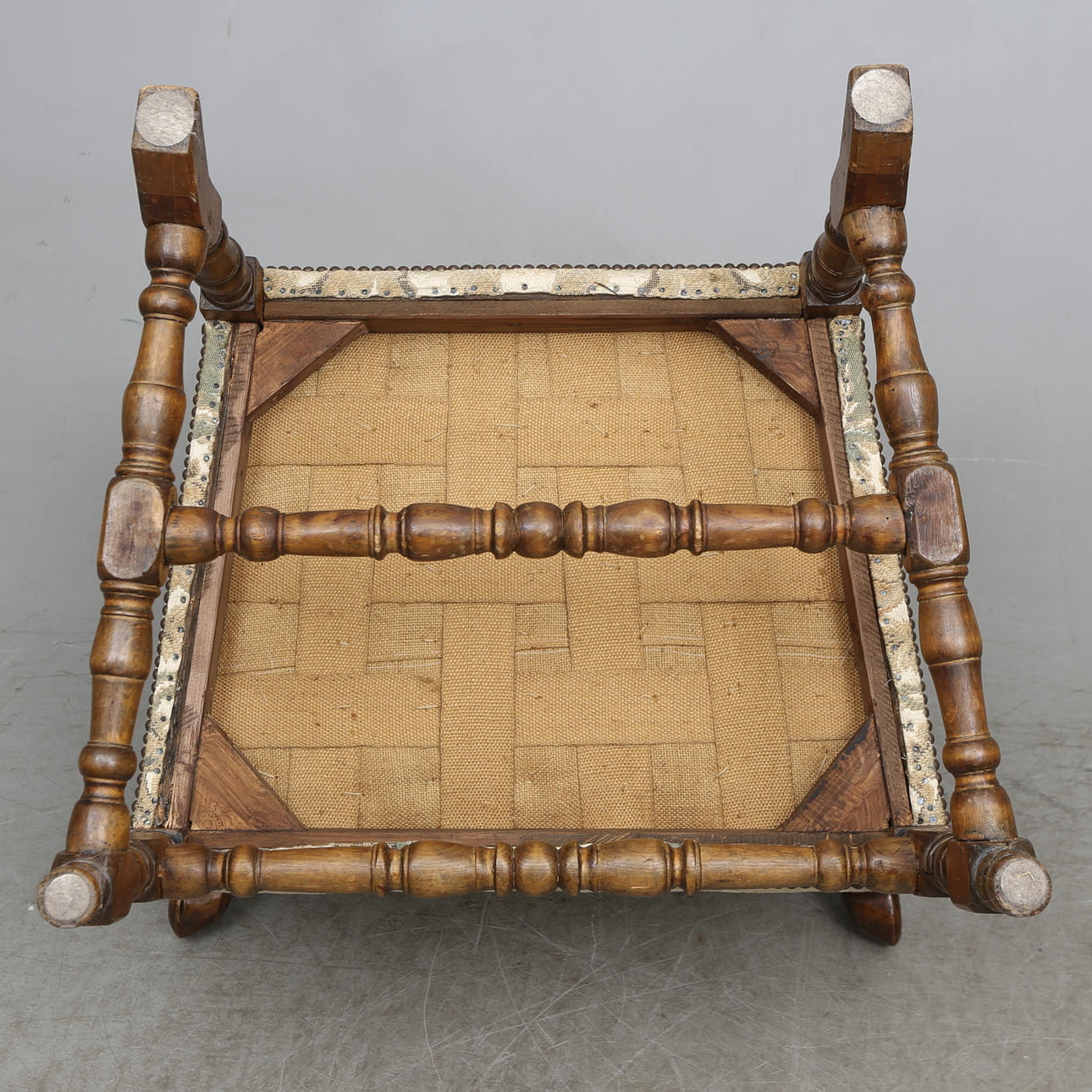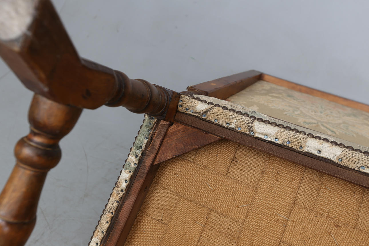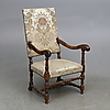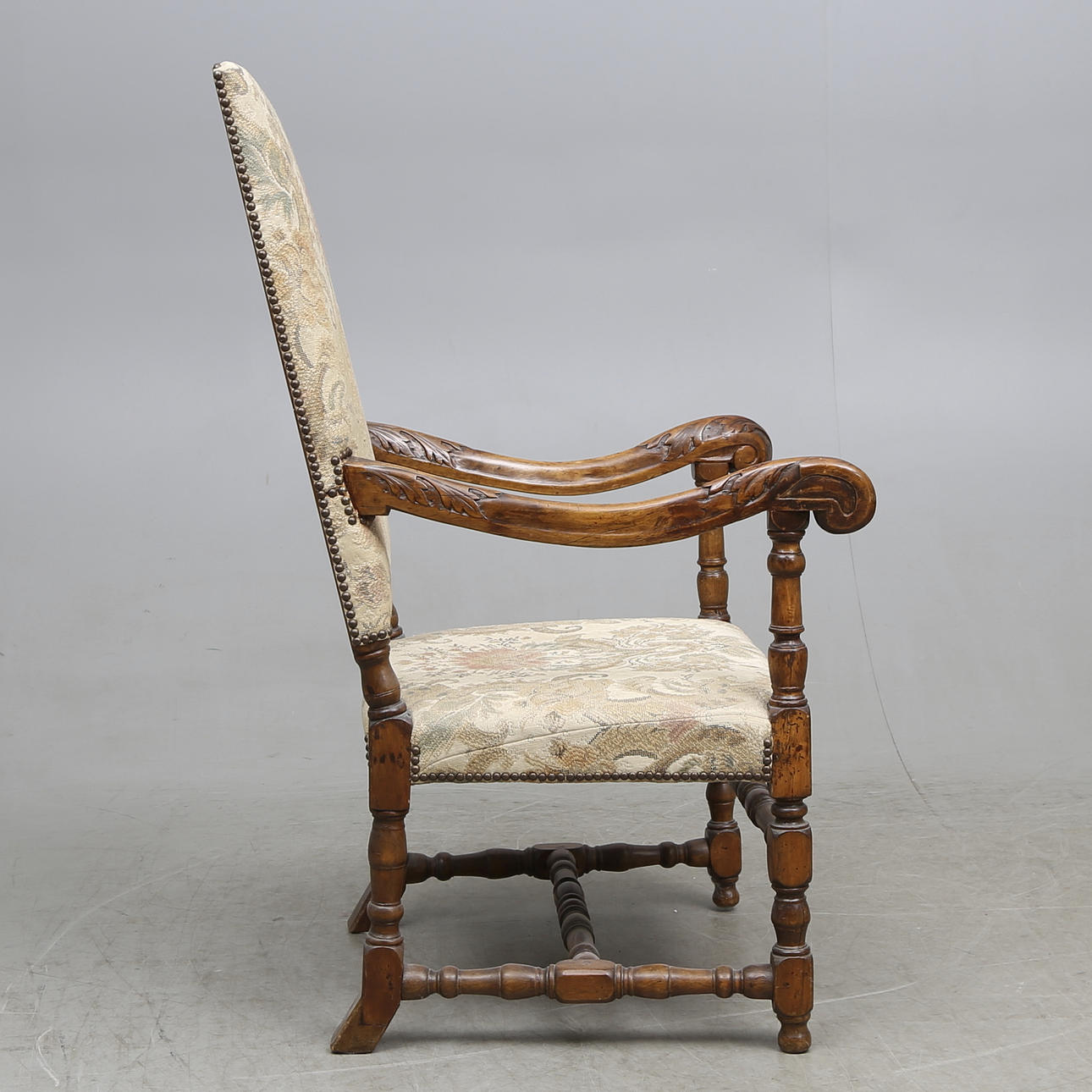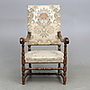 Madera, decoración tallada, tapicería estampada.