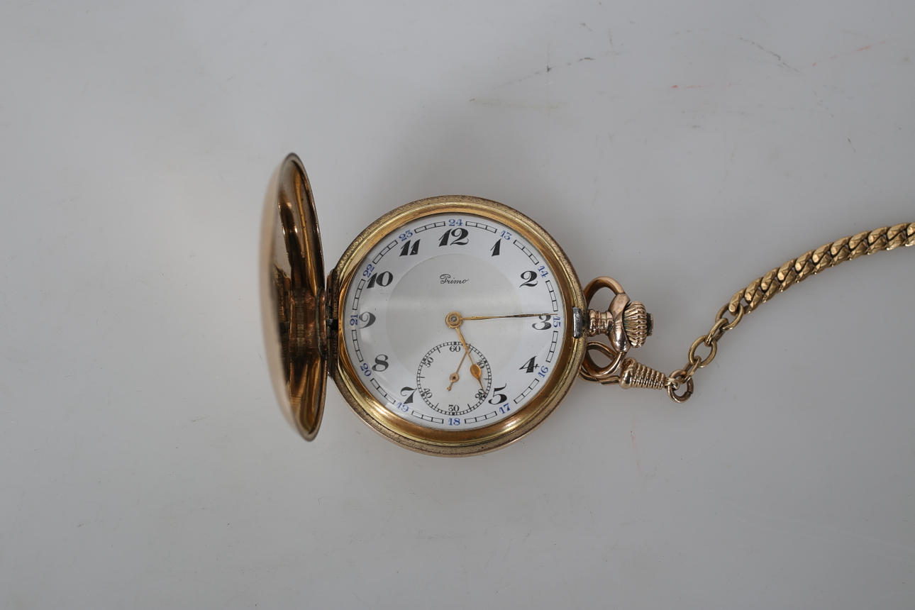 RELOJ DE BOLSILLO CON CADENA, oro doble, Primo, 1900.