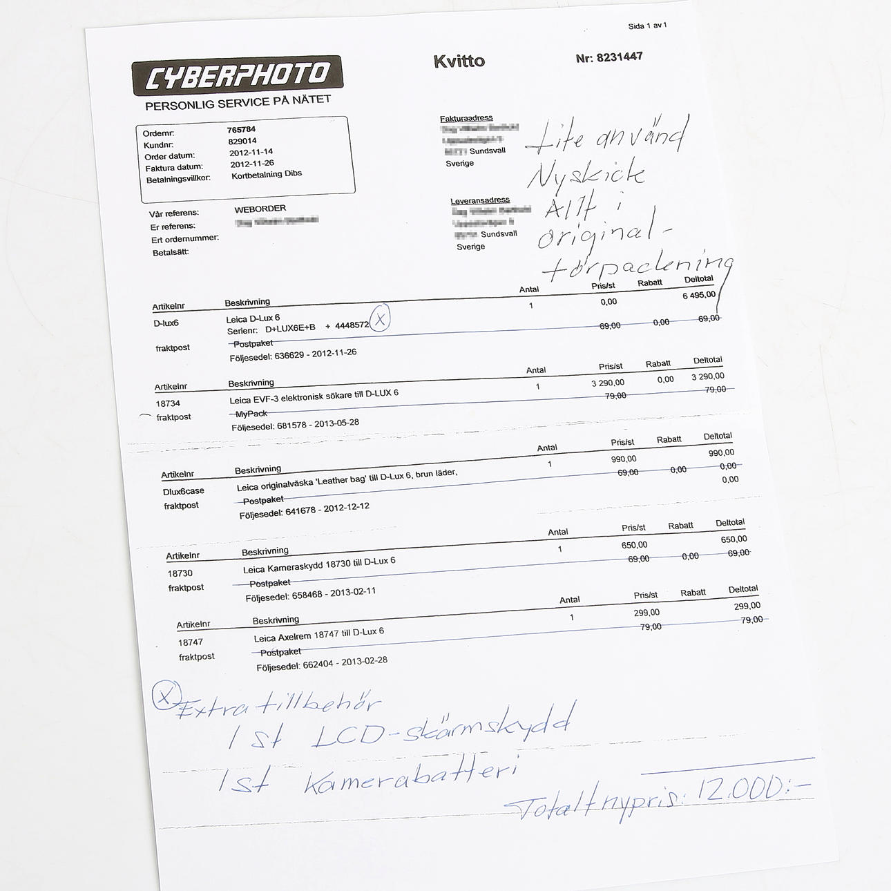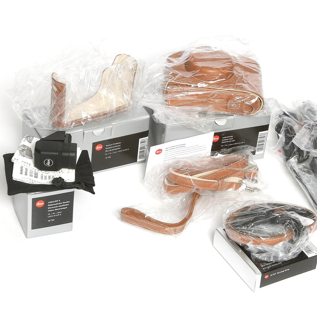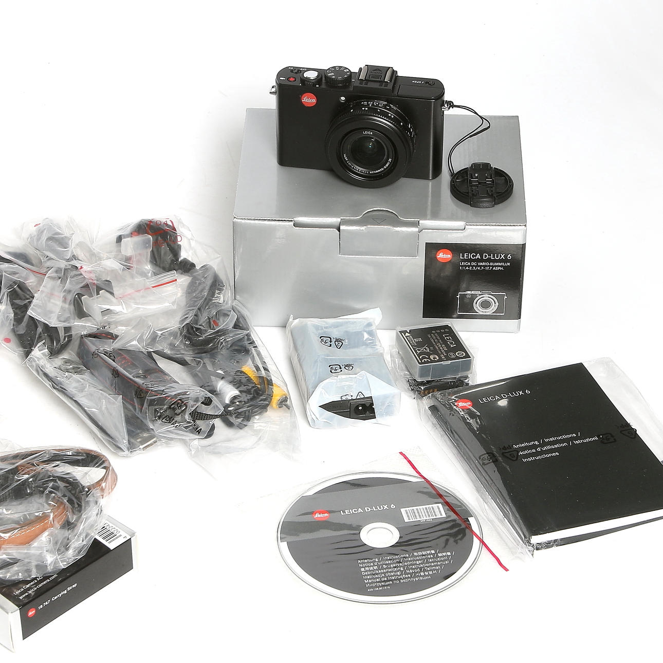 Leica D-Lux 6, con objetivo DC Vario-Summilux 1:1,4-2,2/4,7-17,7 ASPH. Número de serie 4448572. Visor electrónico Leica EVF-3 para D-Lux 6. Bolso original Lecia "Bolso de cuero", cuero marrón. Tapa de cámara 18730. Bandolera 18747. Cajas originales y recibo original incluidos.