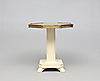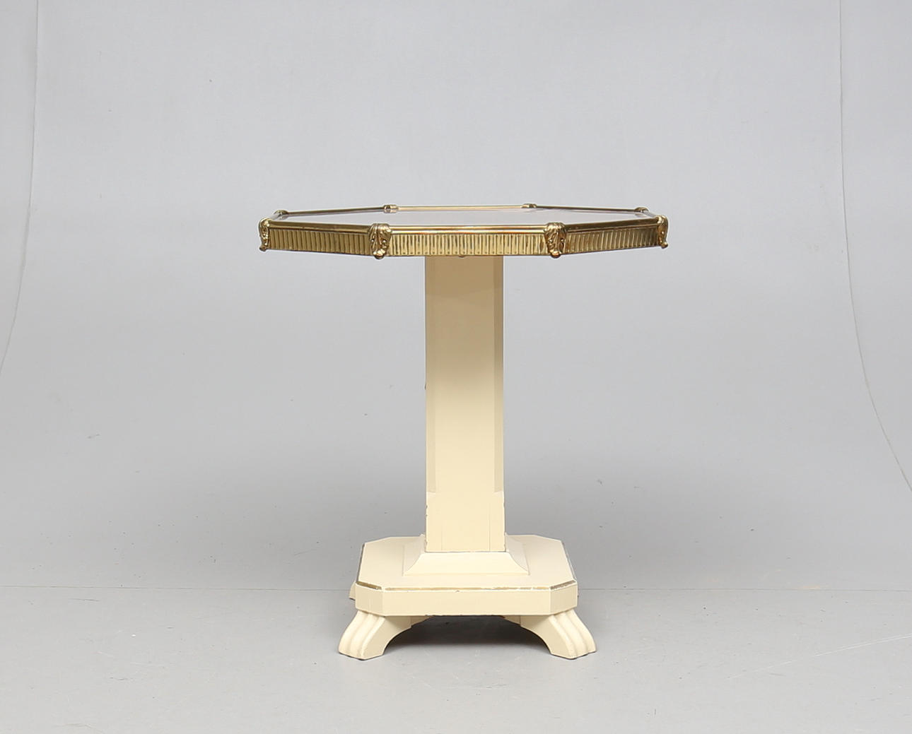Pintado y bronceado. Disco octogonal con chapa de raíz y disco de vidrio. Diámetro 61. Altura 67cm.