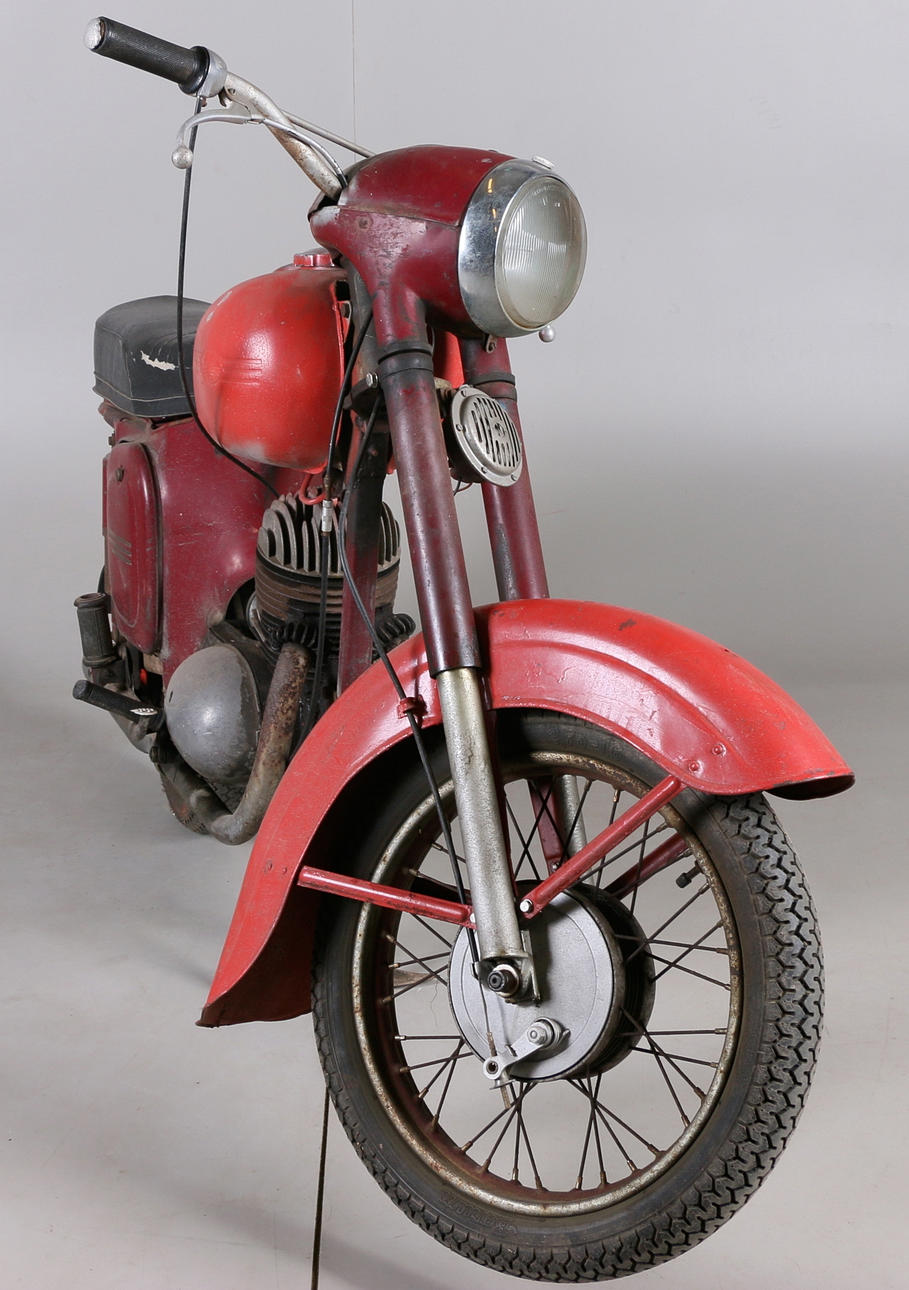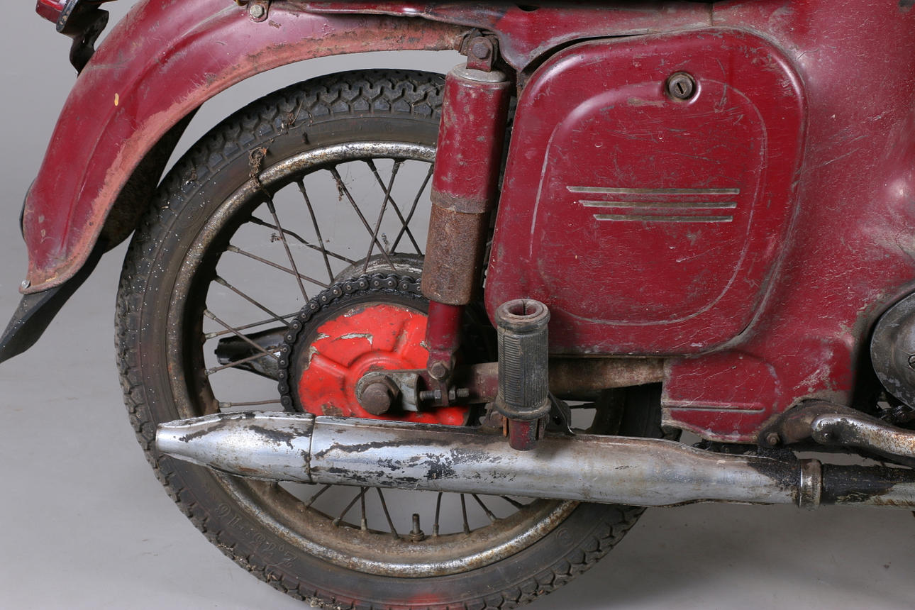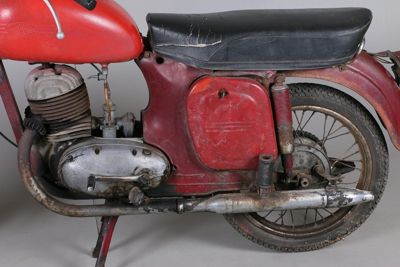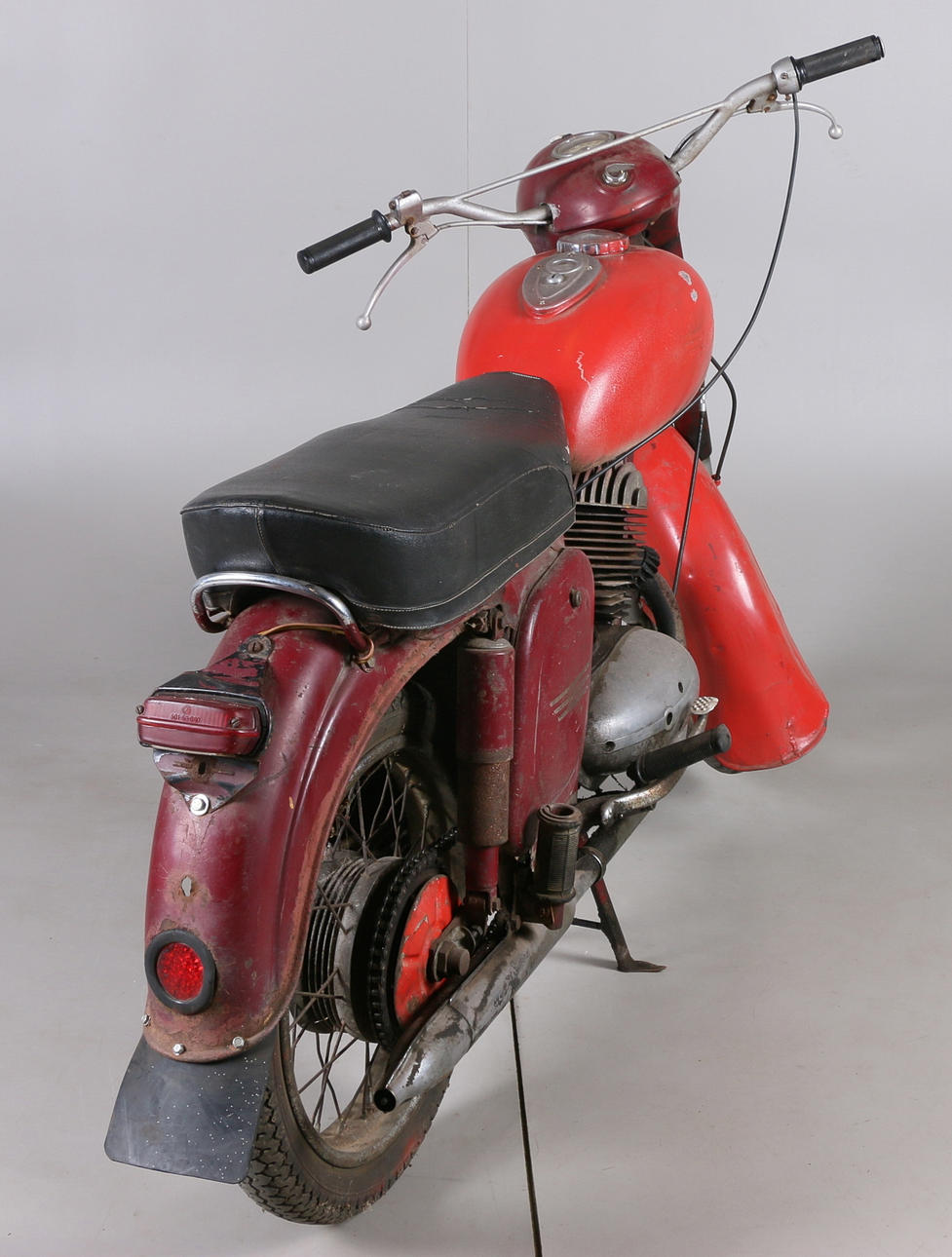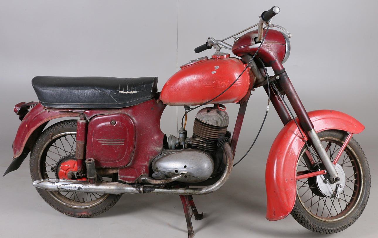 Importado de Hungría, no registrado Jawa 1957, 125 cc, almacenado en un establo, tanque adicional incluido, protector de cadena quitado. 2098 km según metro. Ha estado, según el vendedor, en un establo y no se ha conducido durante algunos años.