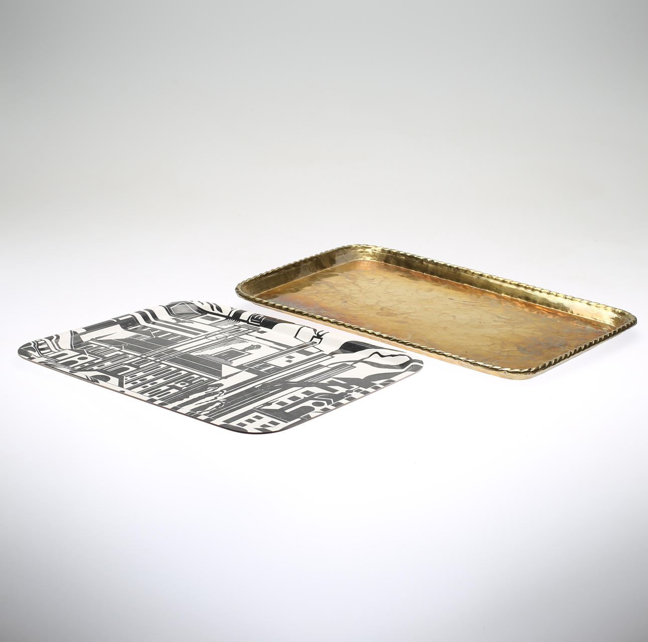 Masa de madera y latón martillado con patrón impreso según Erik Chambert. Largo aproximado 43 y 49 cm.