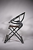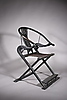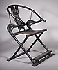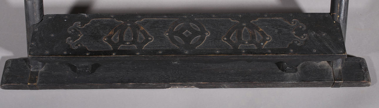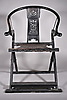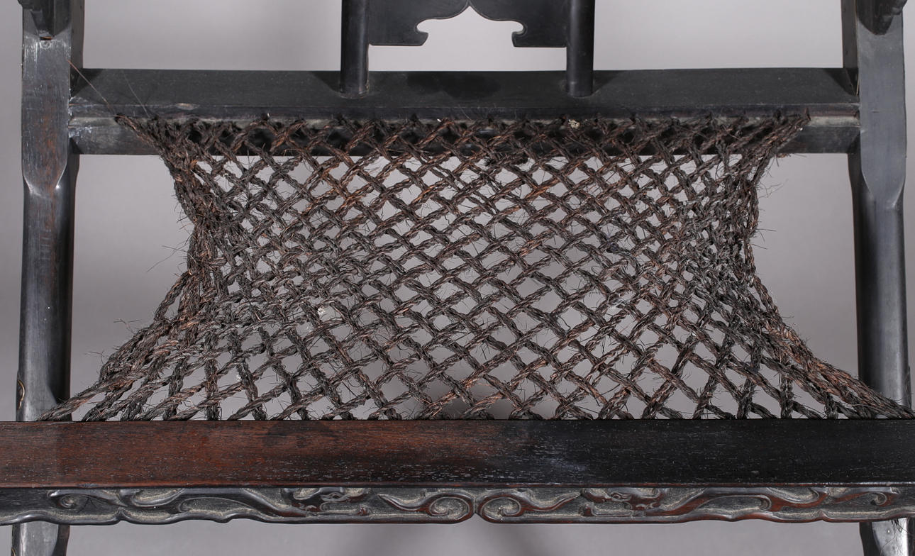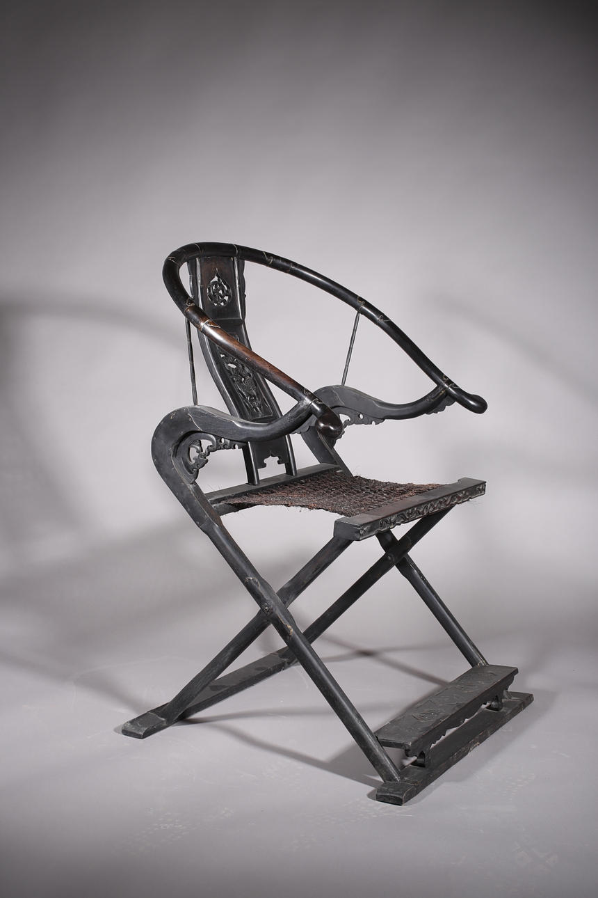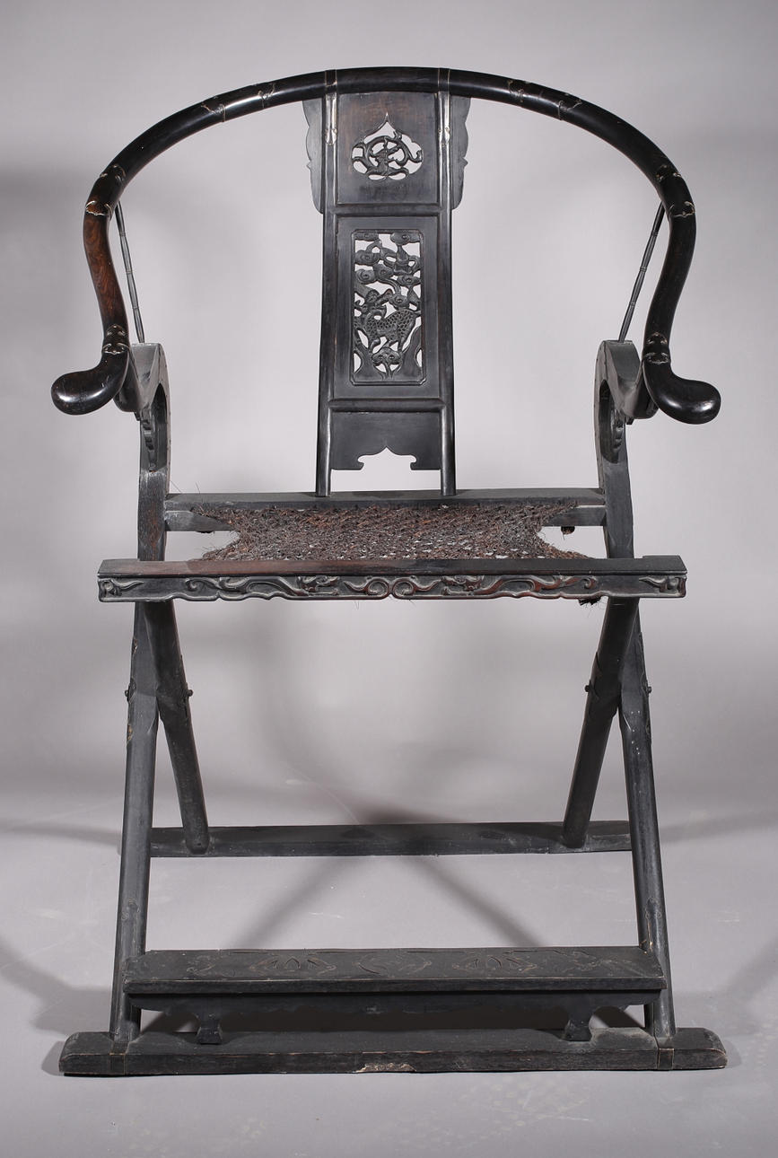 Madera dura oscura con acabado lacado negro. Respaldo y reposabrazos en forma de herradura. El tablero trasero está parcialmente calado y tallado con un qilin (una criatura mítica que promete buena fortuna). Relieve de dragones de lluvia opuestos en el marco. El respaldo y los reposabrazos, así como el reposapiés (tablero add.) con accesorios de metal amarillo pintados en negro, que incluyen patrones de cabezas de nubes (ruyi) y símbolos de la suerte.