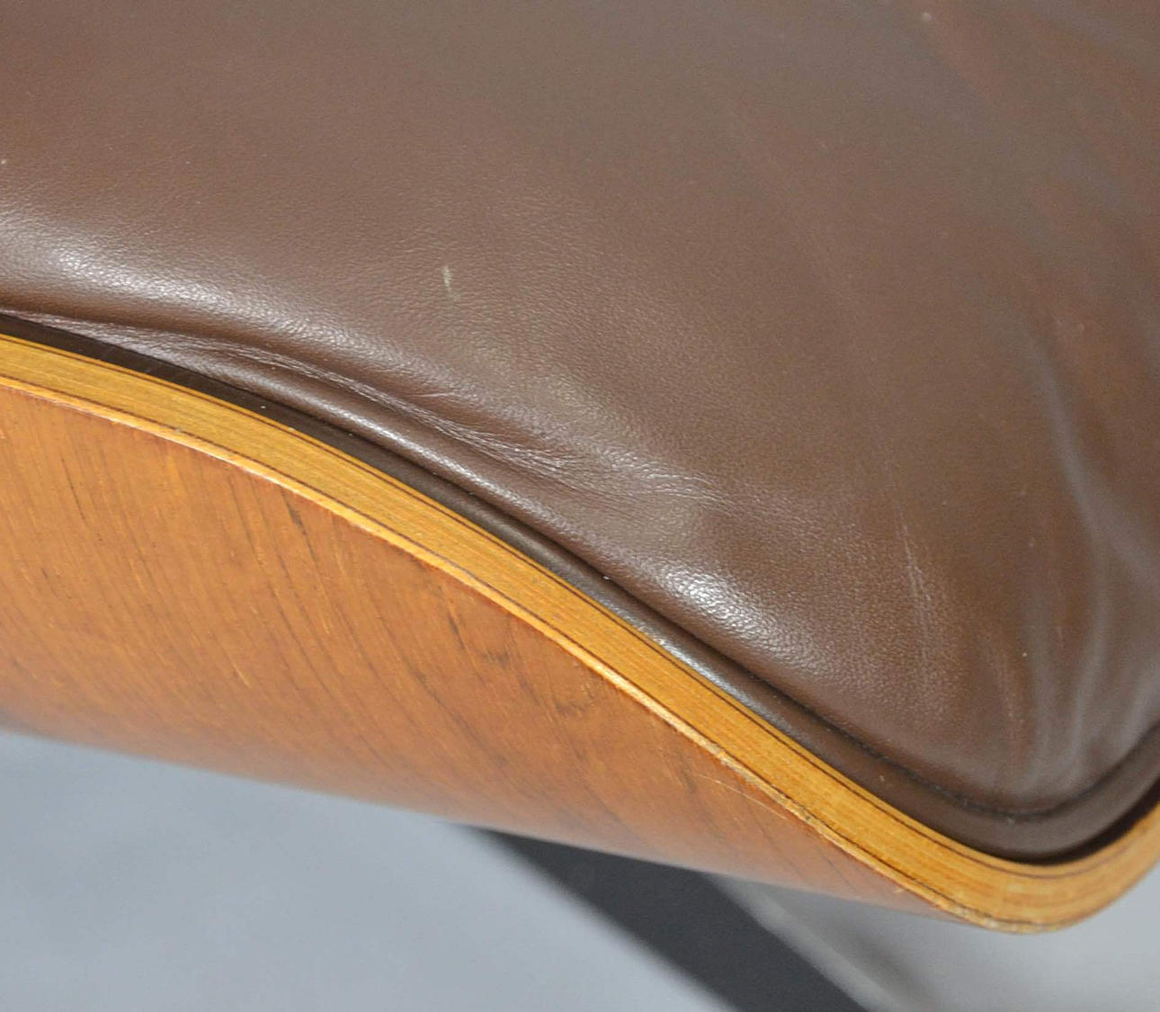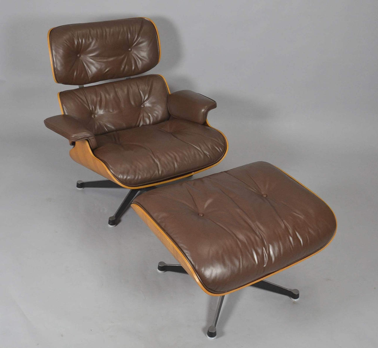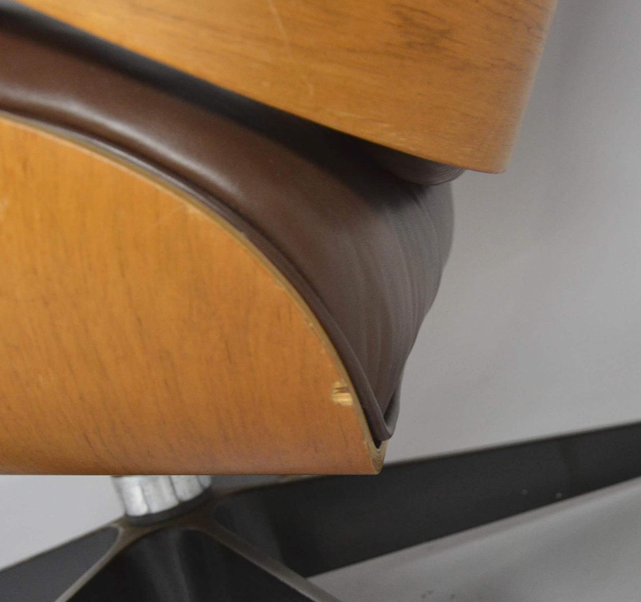 Diseño: Charles & Ray Eames de 1956 Fabricante: Vitra (colección Herman Miller) Edad: finales de los años 70 Modelo: Lounge Chair Base Estructura de aluminio, giratoria con carcasas de madera contrachapada en madera clara, probablemente nogal o teca.