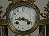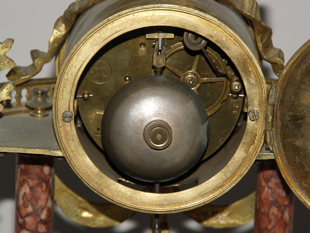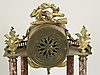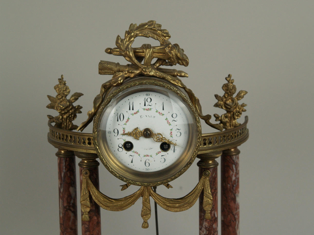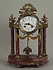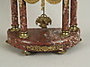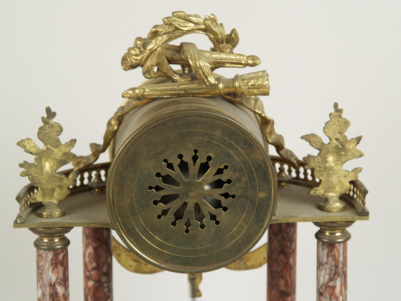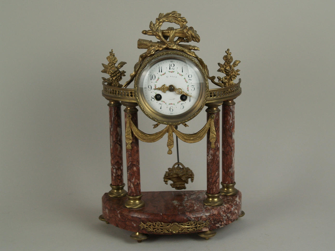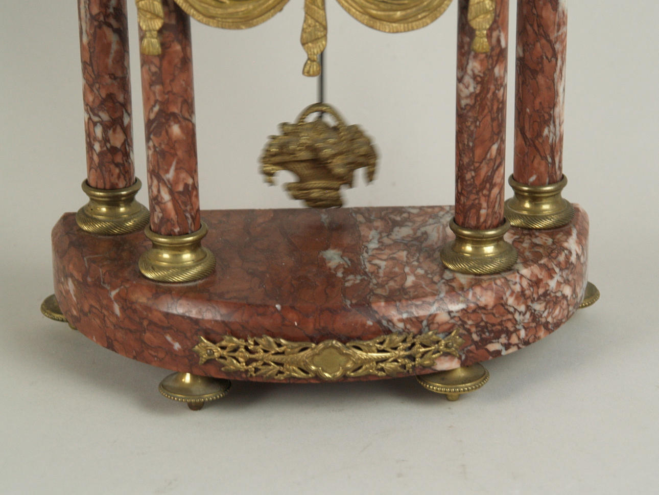 Reloj de pórtico: estructura tipo pórtico con cuatro columnas con capiteles sobre una base en forma de segmento de mármol rojo veteado de blanco, mecanismo de relojería en forma de tambor en el medio, esfera de esmalte con números arábigos, árabe. Minutos y decoración floral, campanada, péndulo decorativo con cesta de flores, elementos decorativos de latón dorado en forma de ramos de flores, antorcha con corona de laurel y cortinajes de tela, (años 90), H. aprox. 53cm.