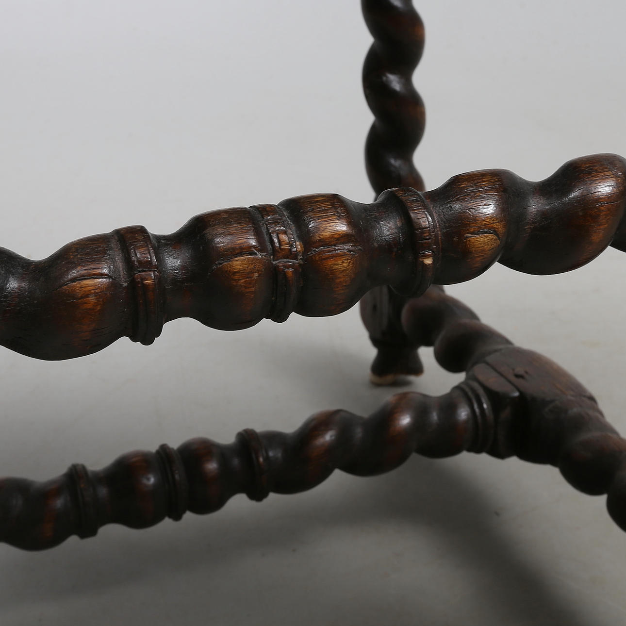 Piernas torneadas en espiral, entrecruzadas y cruzadas. Tapicería de felpa estampada.