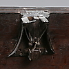 Decoración tallada en forma de herrajes y ornamentación grutesca, pilastras jónicas y moldura dentada que recorre la tapa del ataúd.