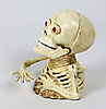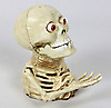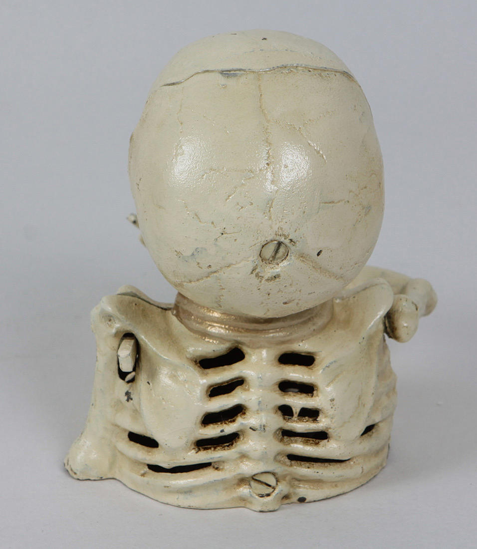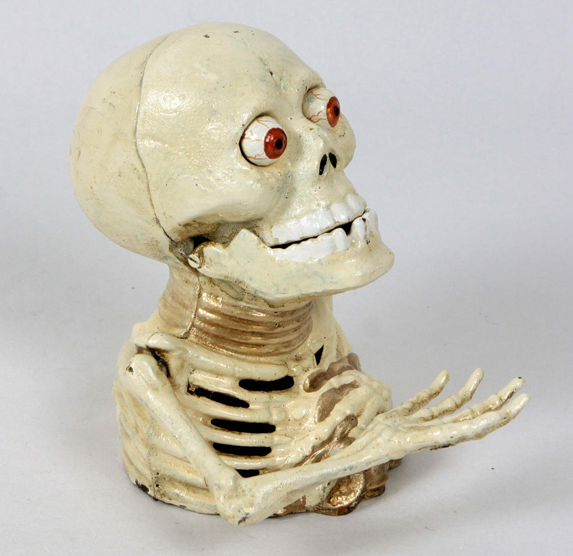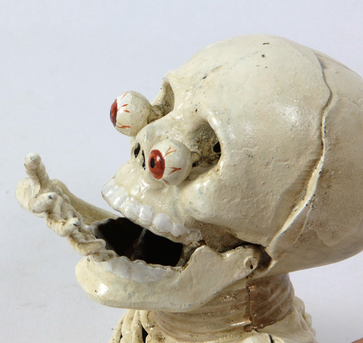 Hucha de hierro fundido en forma de calavera, al presionar la palanca lateral se levanta el brazo y se lleva la moneda a la boca, contemporánea, altura 17 cm.