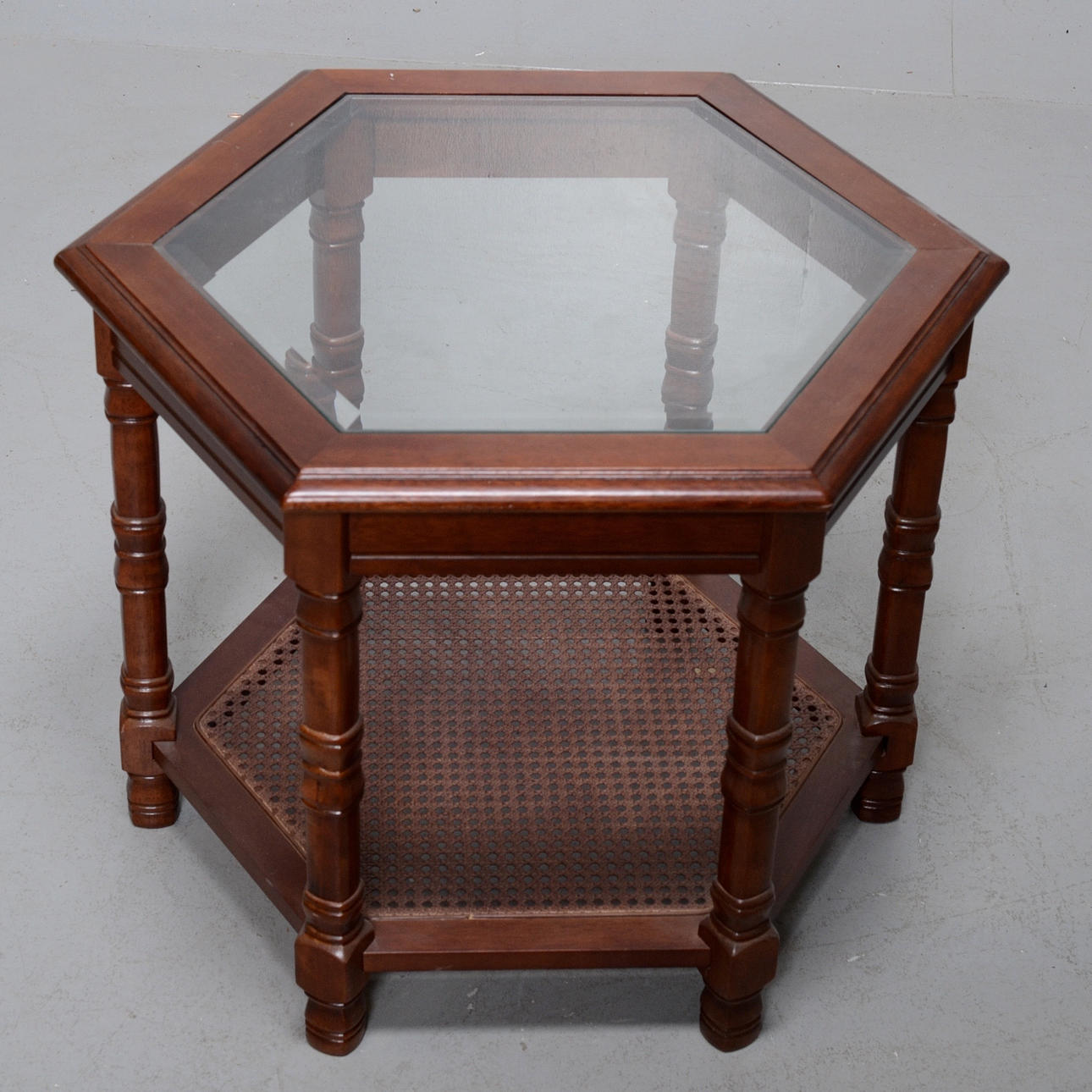 Mesa hexagonal con tapa de cristal. Base de ratán. Altura 53 cm. Diámetro 68 cm.