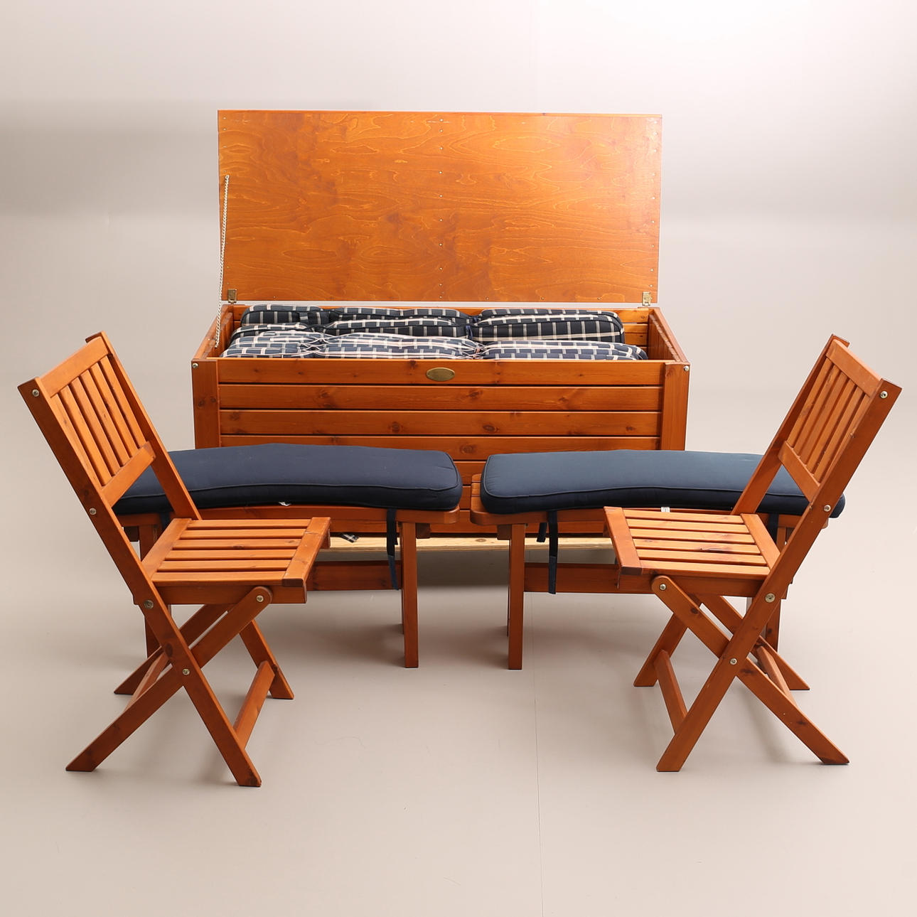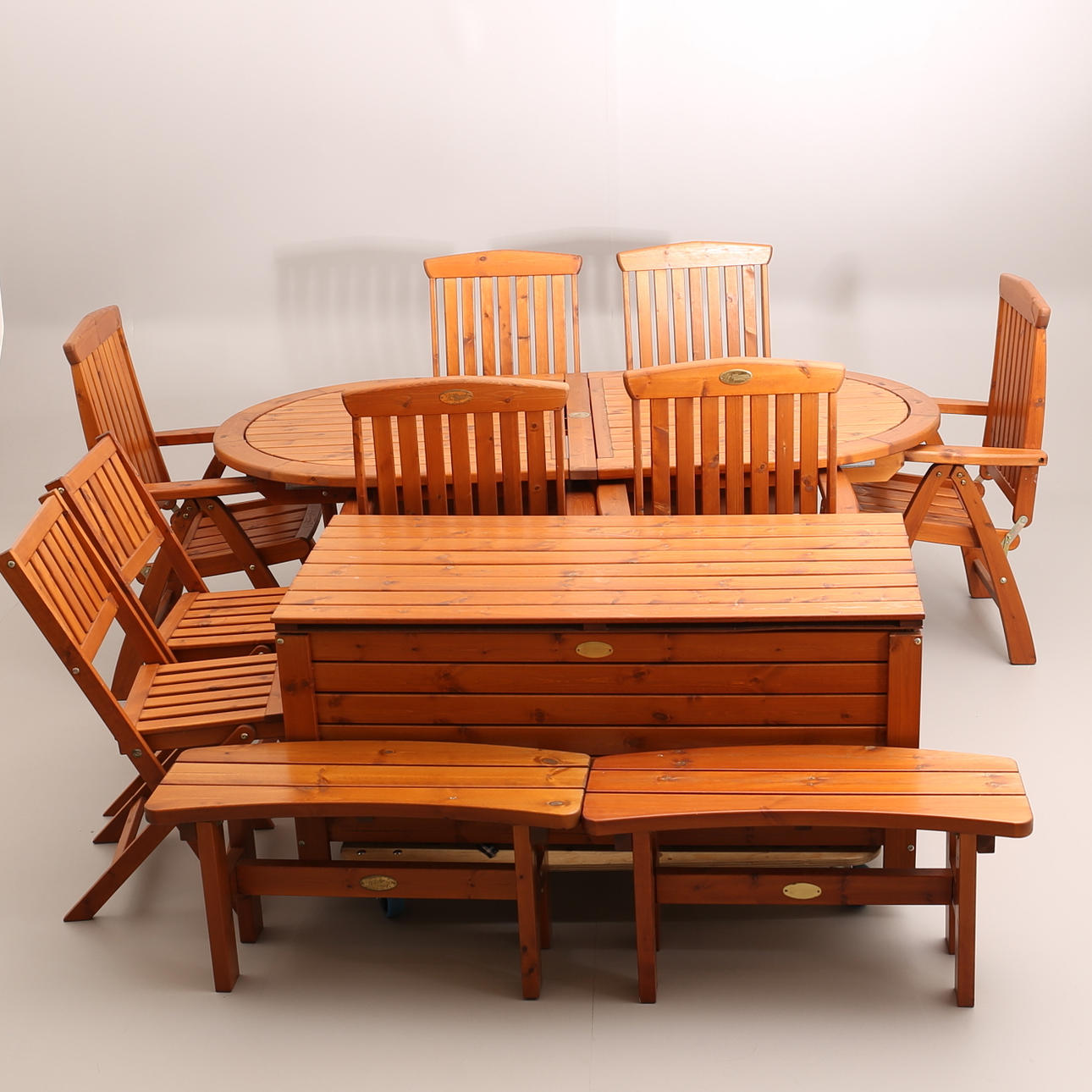 Mesa con 2 insertos, 6+2 sillas, caja de cojines, 2 mesitas.