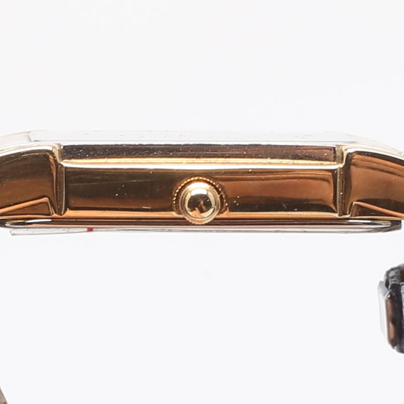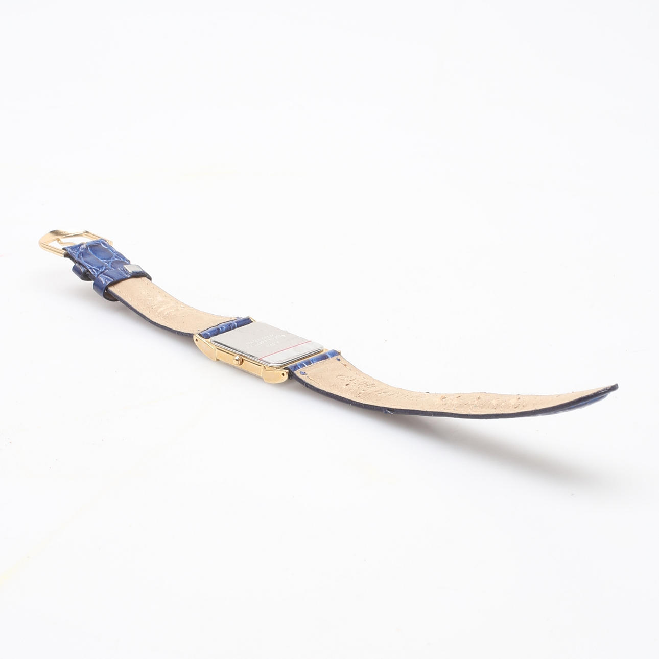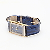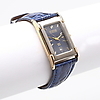Reloj de pulsera, modelo tanque, Coster. Caja de acero, esfera azul con índices de barra dorados y visualización de fecha. Tachonado con un pequeño diamante. Movimiento de cuarzo.