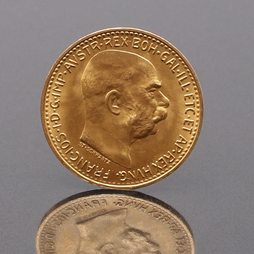 Moneda de oro, 10 coronas, 1912, Austria/Hungría, diámetro aproximado 20 mm, peso 3,39 gramos.