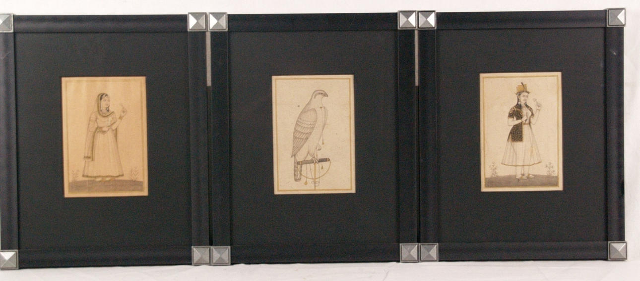 Colección de dibujos - India después de 1900, 3 dibujos a lápiz extremadamente finos sobre papel, coloreados con personal dorado, motivos: 2x dama joven con atuendo festivo con flor/halcón de caza sentado en un poste, 1x min, sección PP ca.16x11cm.