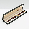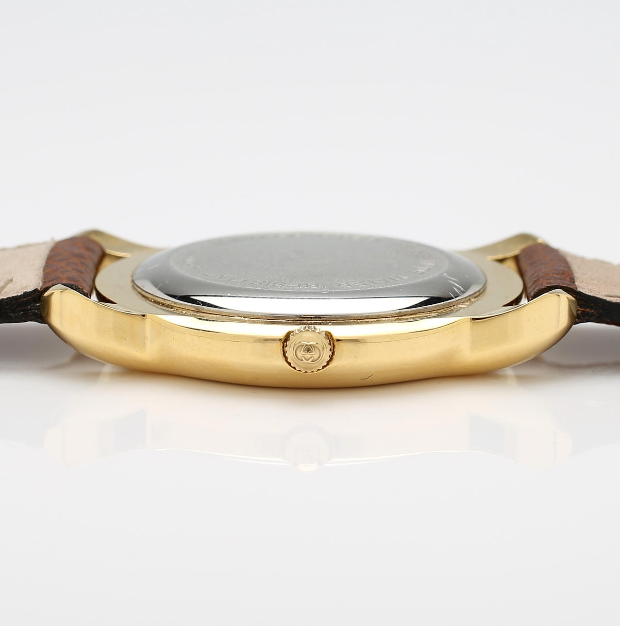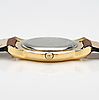 Cuarzo. Esfera de color dorado con ventana de fecha. Pulsera de cuero repujado. Con caja original. Diámetro aproximado 35 mm.