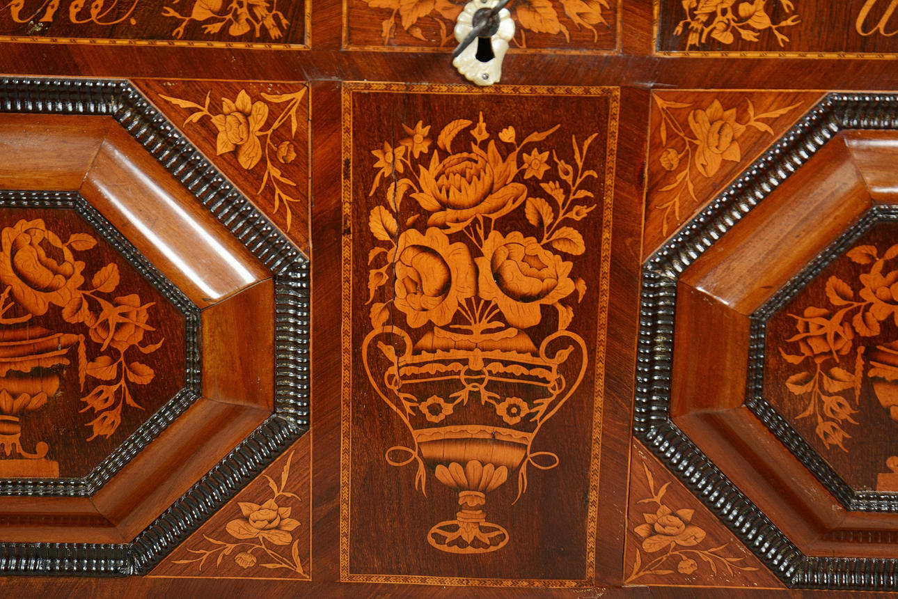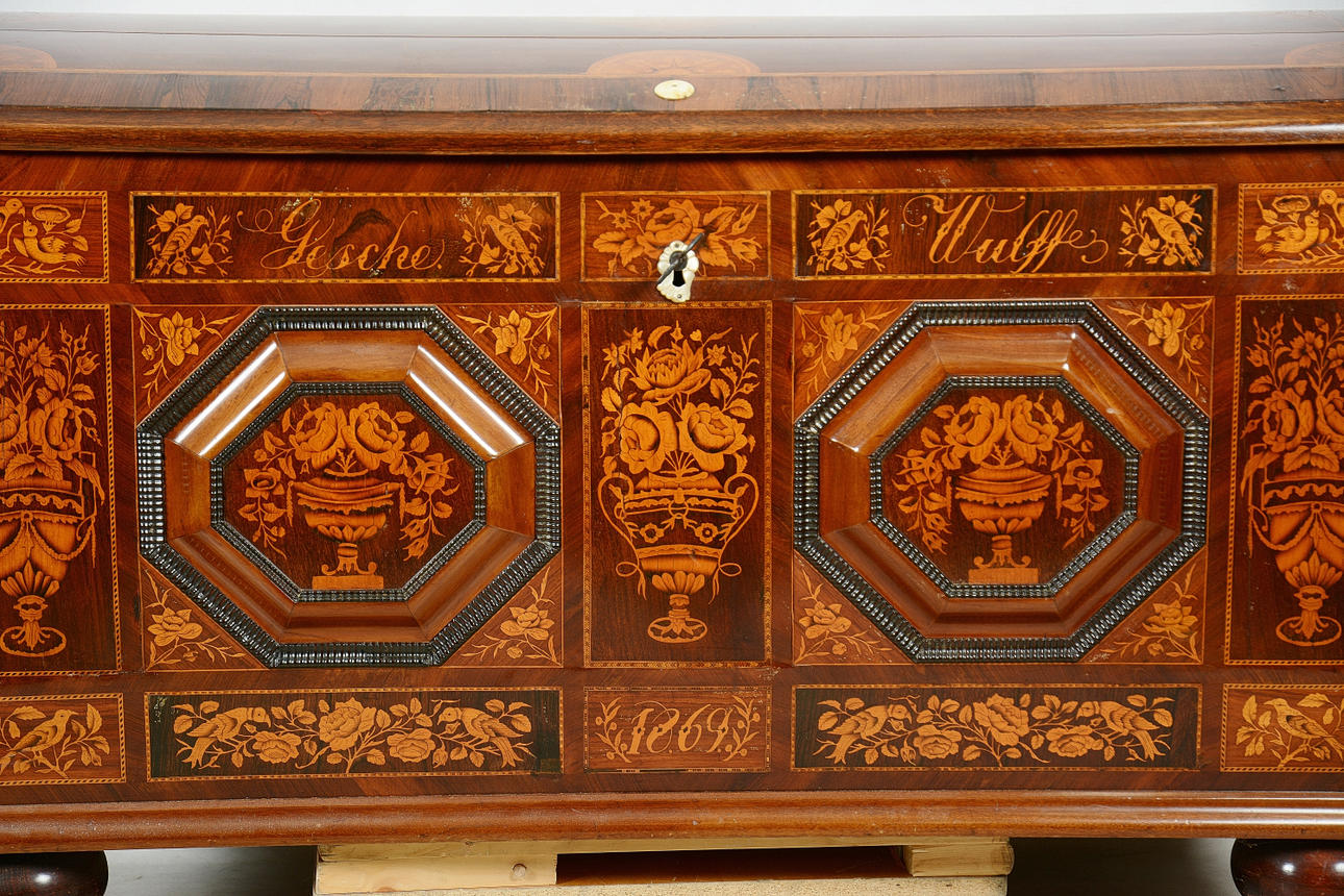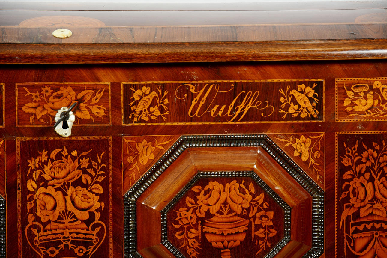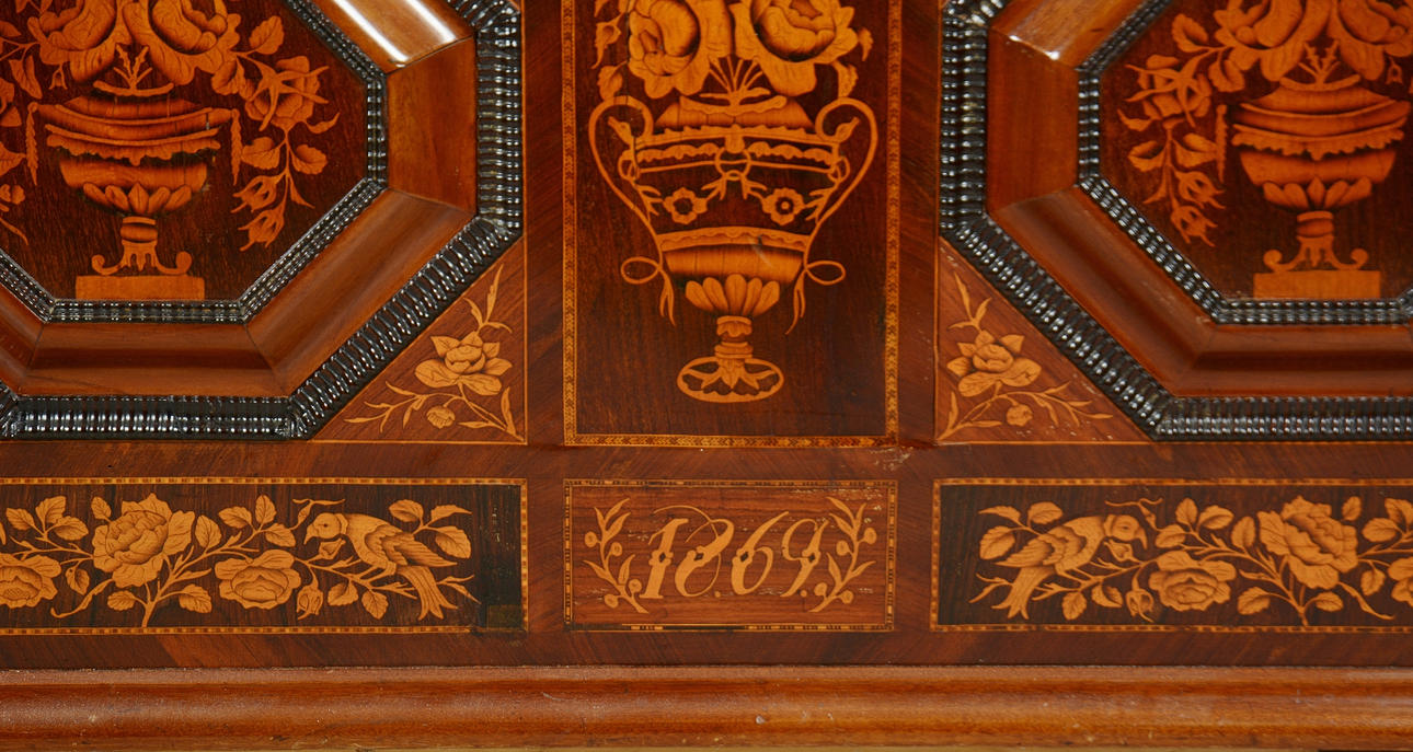 Fechado en 1869 y firmado Wulffe, decorado con intarsia, bocallave de nácar, tirador de latón, ancho 135 cm, profundidad 66 cm, alto 80 cm aprox.
