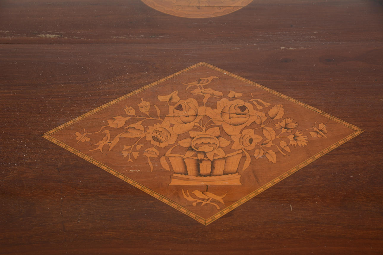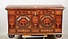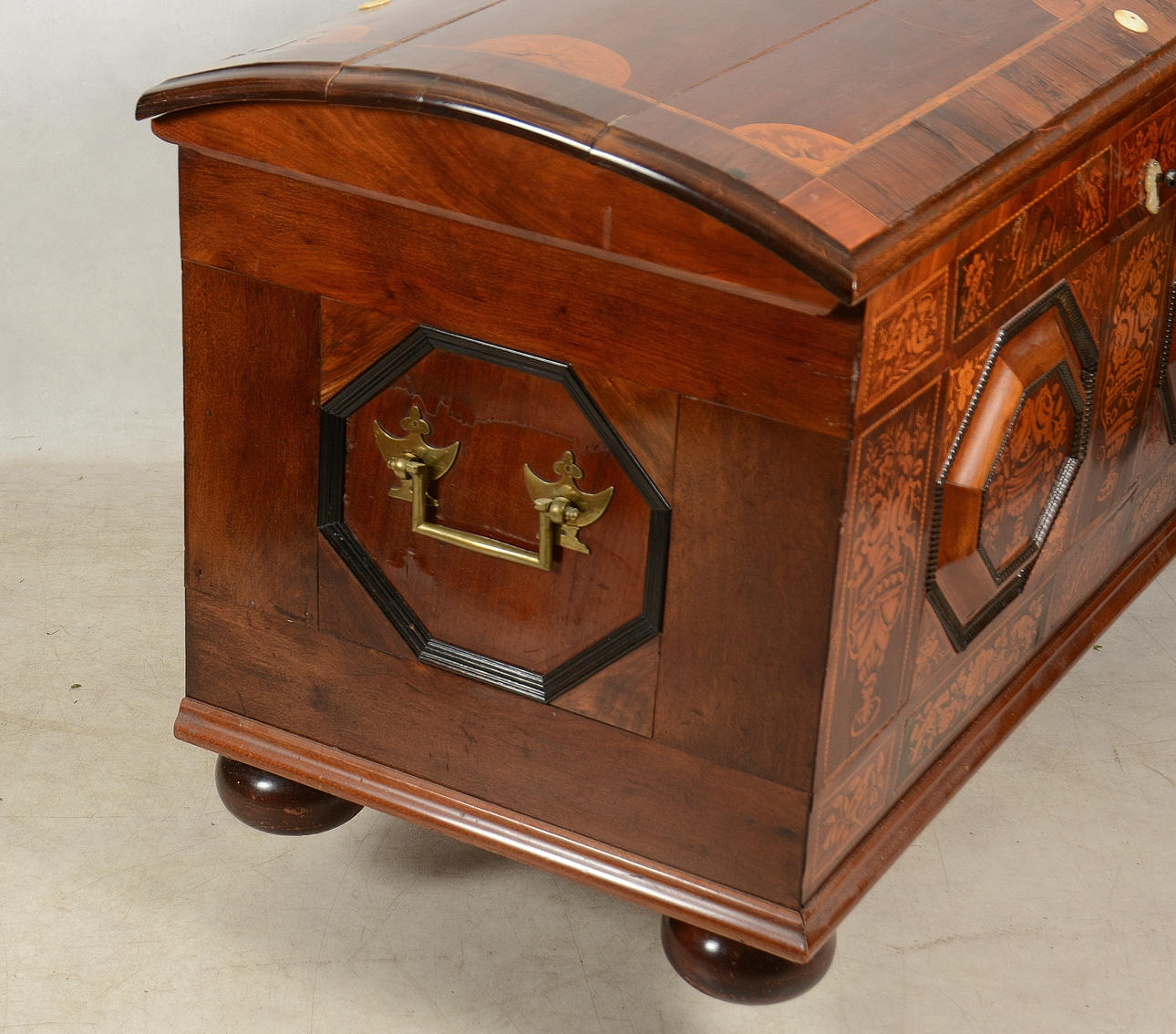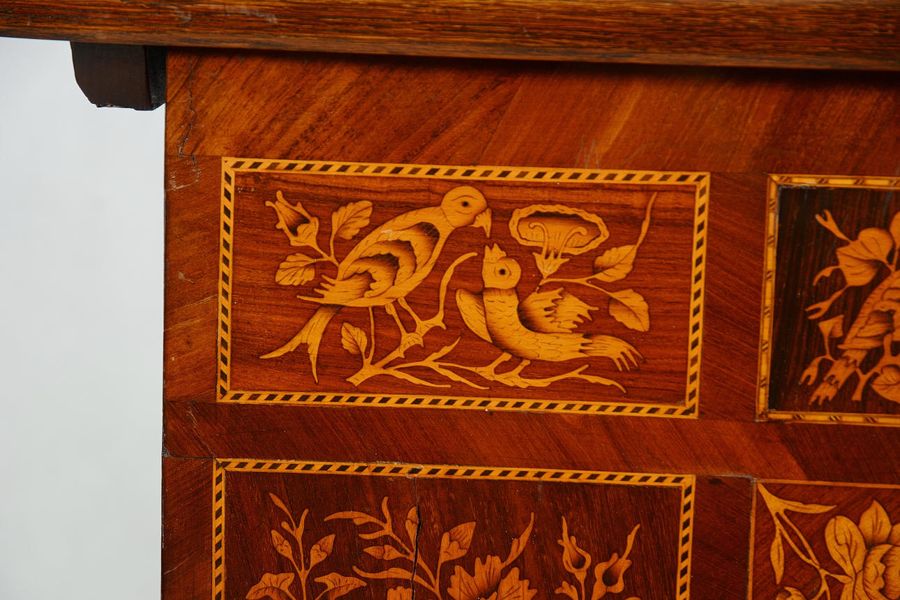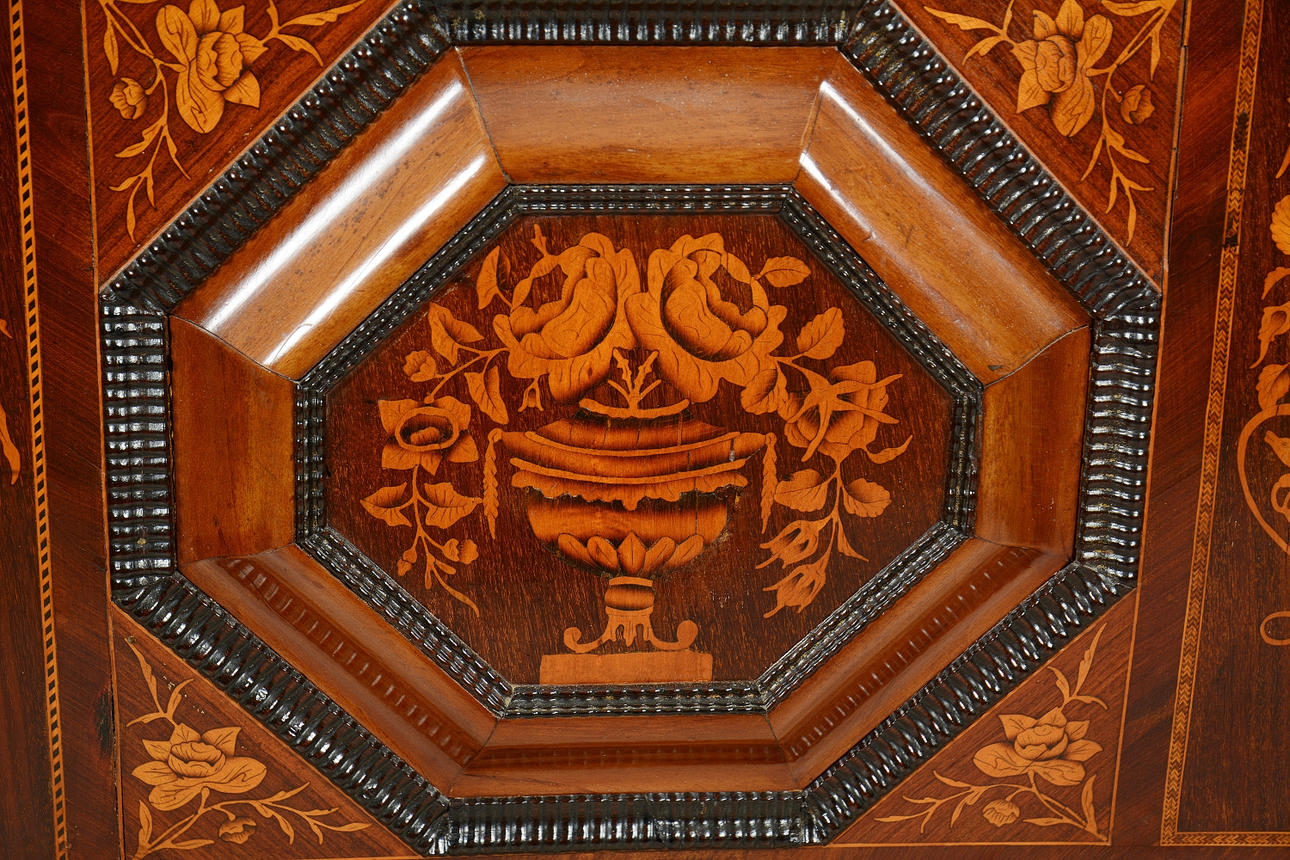 Fechado en 1869 y firmado Wulffe, decorado con intarsia, bocallave de nácar, tirador de latón, ancho 135 cm, profundidad 66 cm, alto 80 cm aprox.
