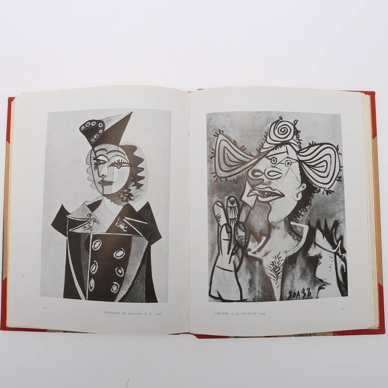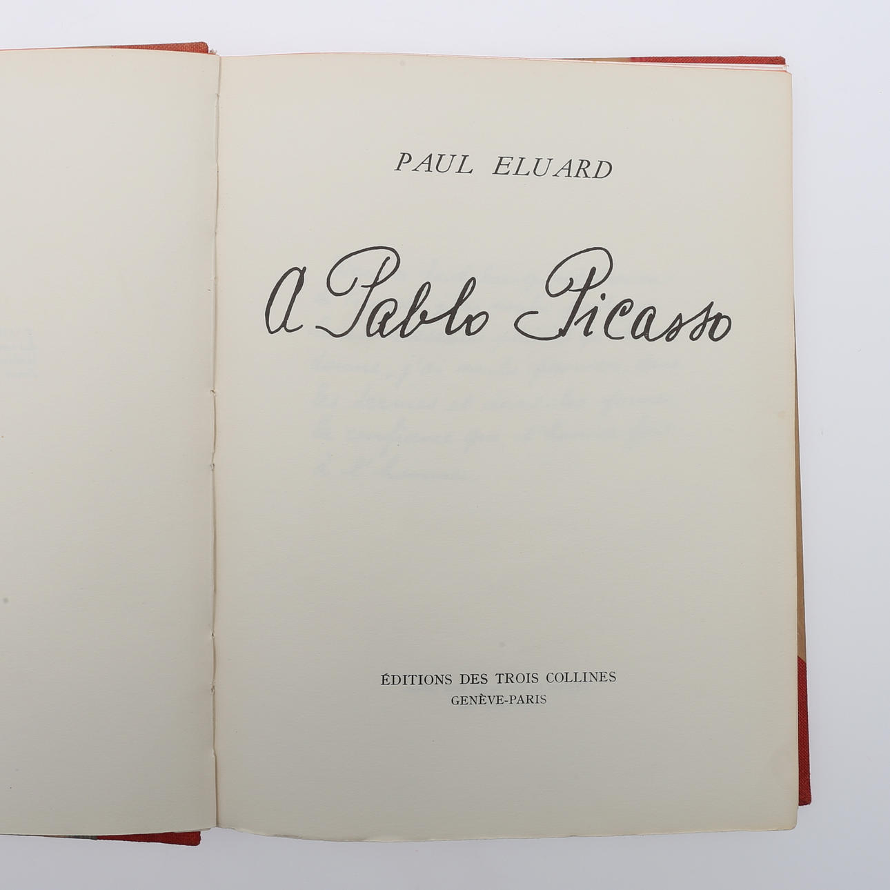 Eluard, Pablo. Un Pablo Picasso. Éditions des Trois Collines, Ginebra-París, 1944. Primera edición. Gran 8vo encuadernación en media tela roja decorada. Encuadernado con las sobrecubiertas rojas originales impresas en negro. Este es el primer volumen de la serie "Colección les grands peintres par leurs amis.Ilustrado con una lámina montada a color y numerosos dibujos y reproducciones fotográficas en b/n sobre papel satinado. 168 p., (XII).